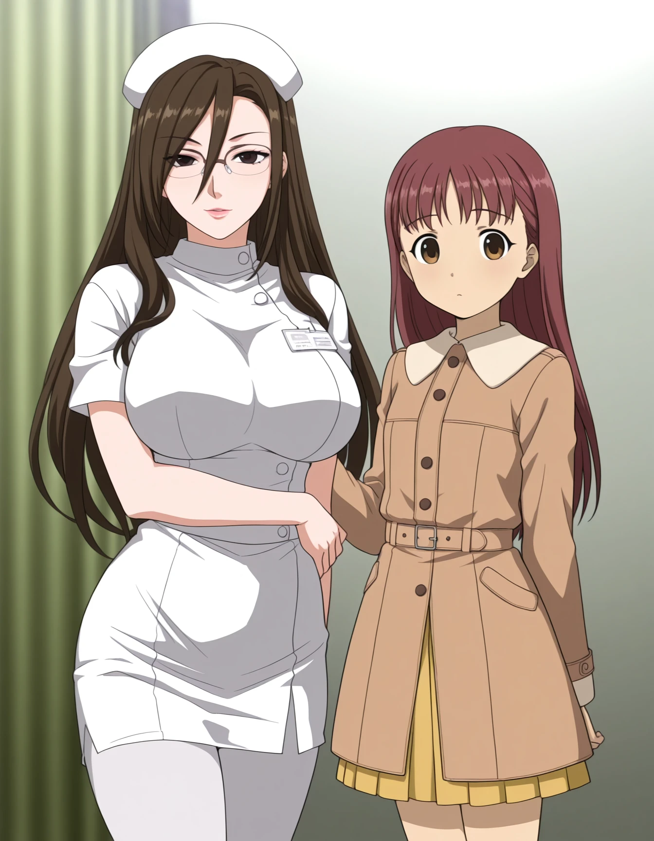 mai_iwka,mai_miwakowk,mature_female,long_hair,brown_hair,hair_between_eyes,brown_eyes,pink_lips,glasses,large_breasts,nurse,nurse_cap,white_dress,white_pantyhose,high_heelsMisaki