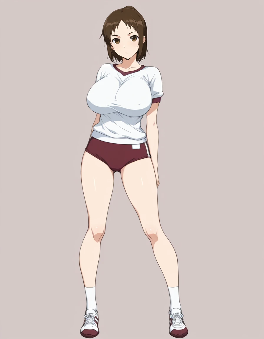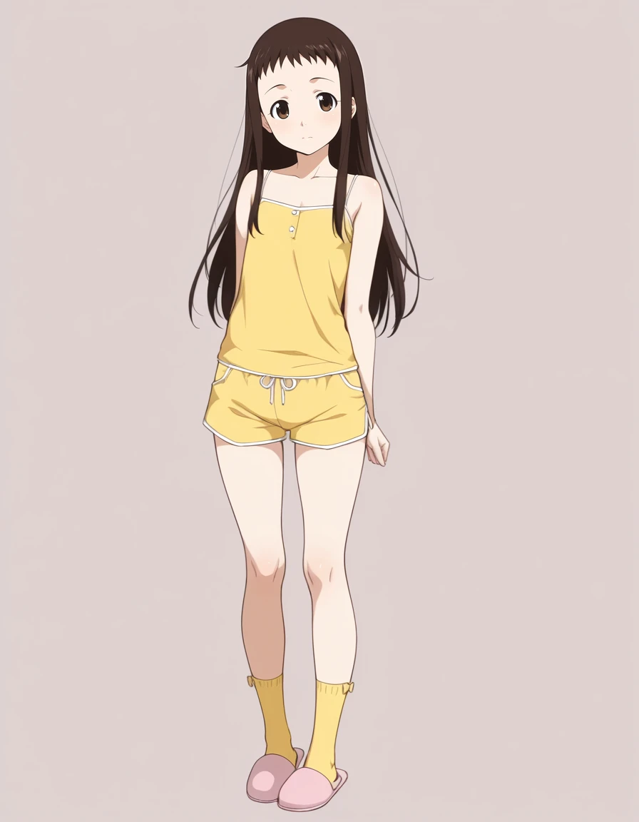 mai_iwka,mai_akiwk,long_hair,brown_hair,brown_eyes,_shoulders,yellow_camisole,yellow_shorts,yellow_socks,slippers