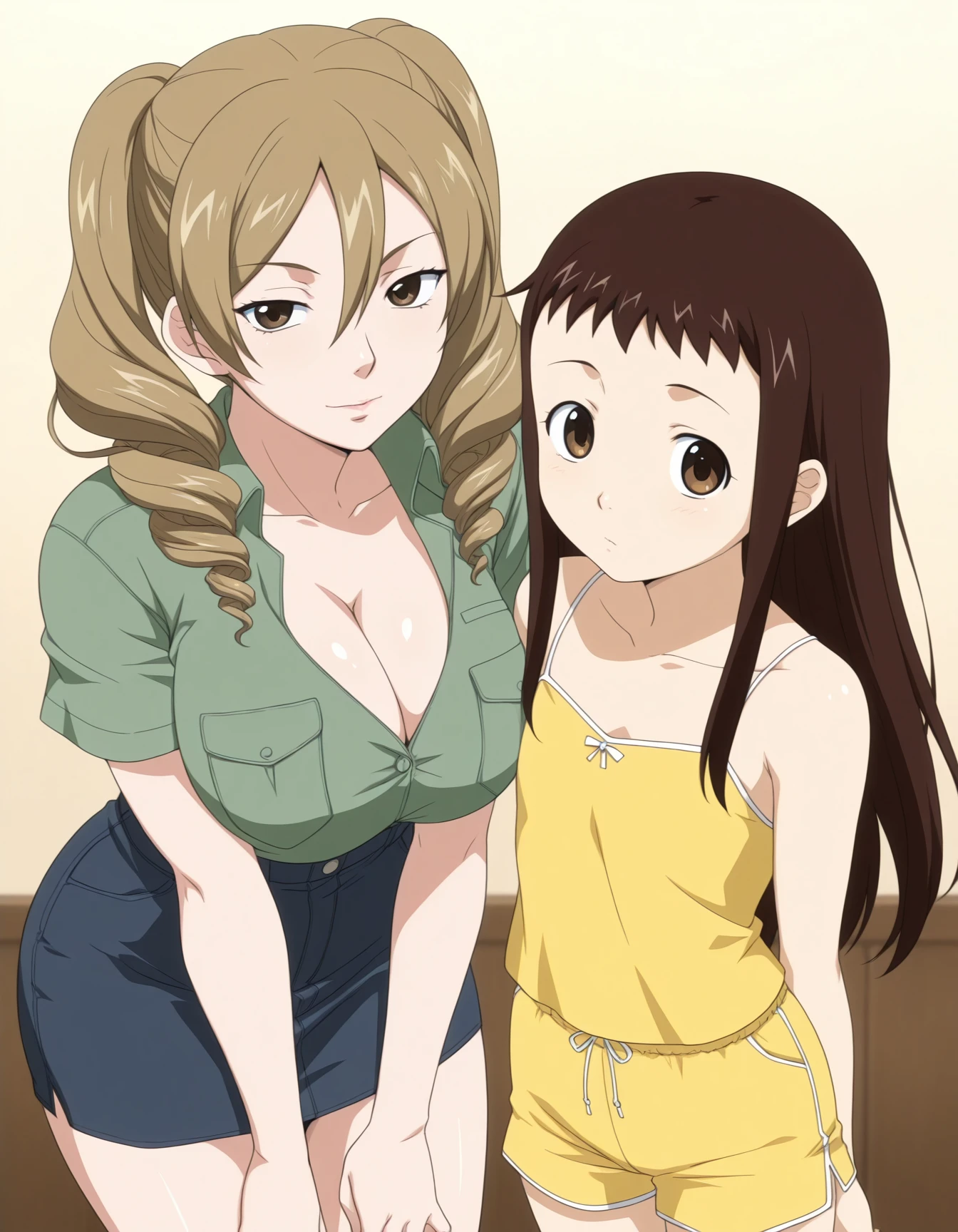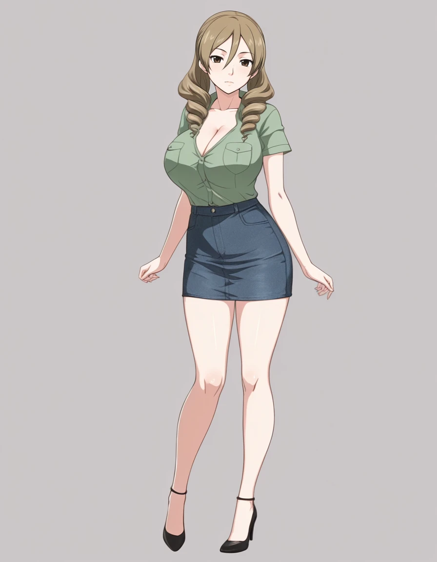 mai_iwka,mai_yumikowk,large_breasts,blonde_hair,long_hair,drill_hair,brown_eyes,green_shirt,short_sleeves,cleavage,breast_pocket,denim_skirt,high_heelsAki