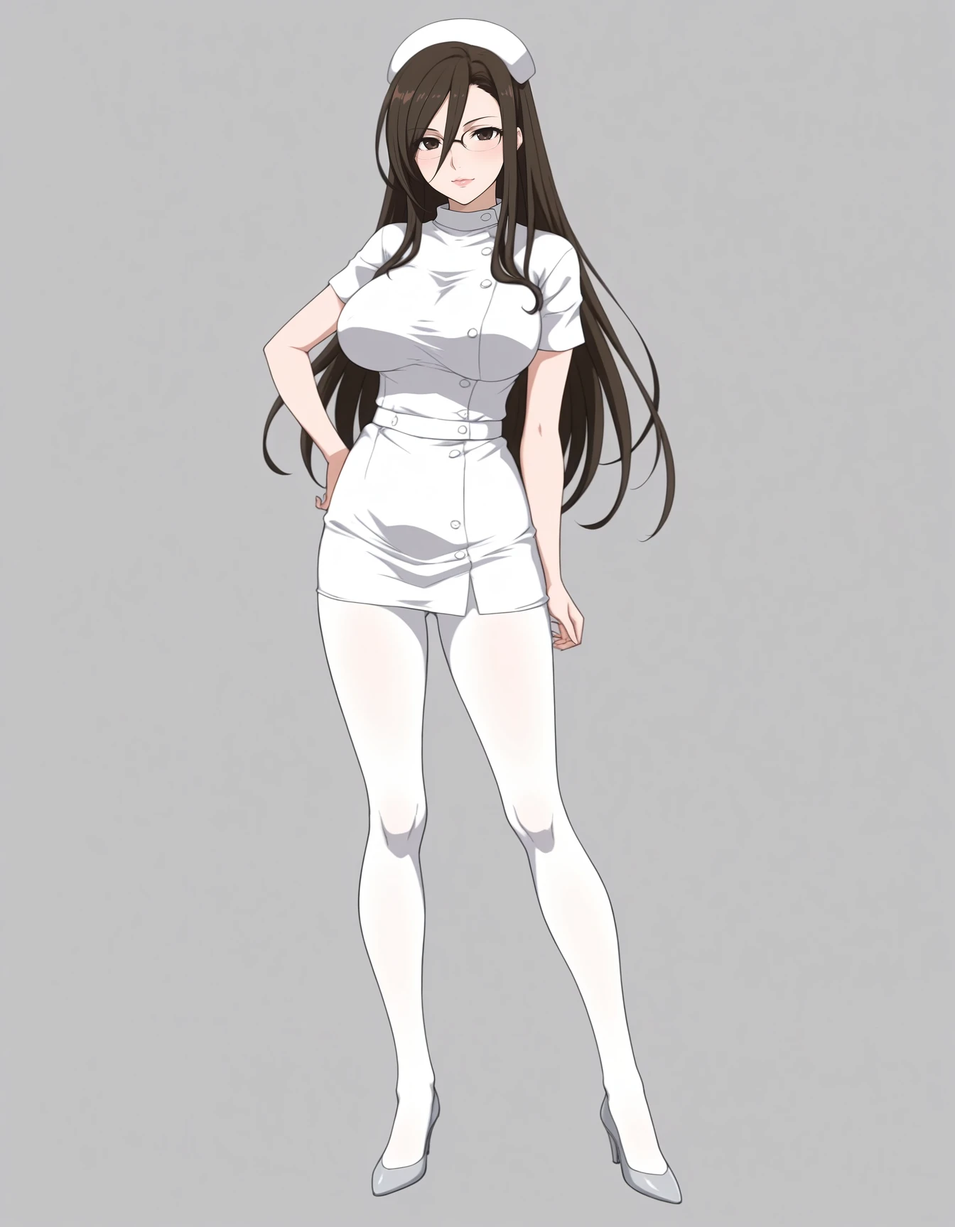 mai_iwka,mai_miwakowk,mature_female,long_hair,brown_hair,hair_between_eyes,brown_eyes,pink_lips,glasses,large_,nurse,nurse_cap,white_dress,white_pantyhose,high_heels