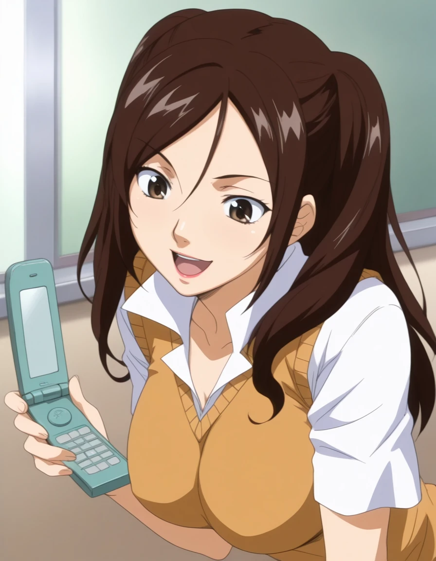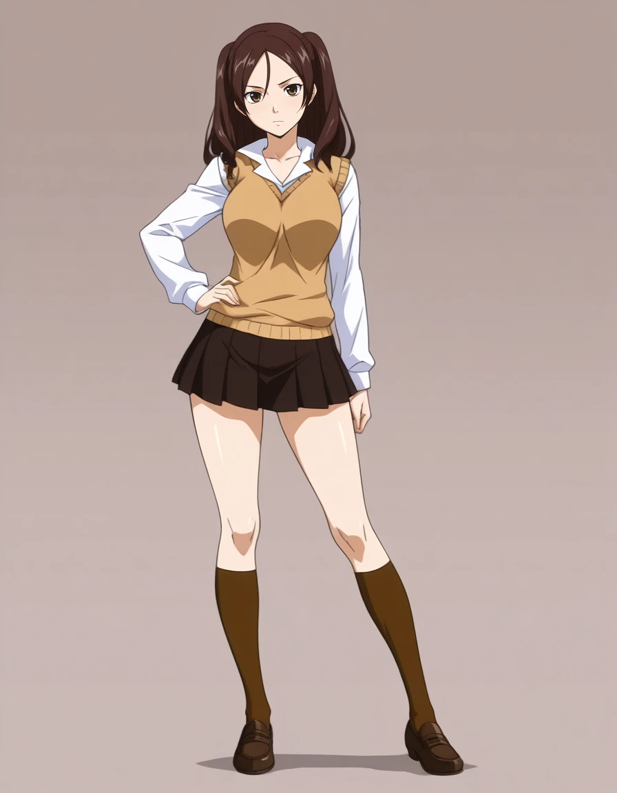 mai_iwka,mai_akanewk,long_hair,twintails,parted_bangs,brown_hair,brown_eyes,school_uniform,white_shirt,long_sleeves,sweater_vest,brown_skirt,brown_kneehighs,loafersYumiko