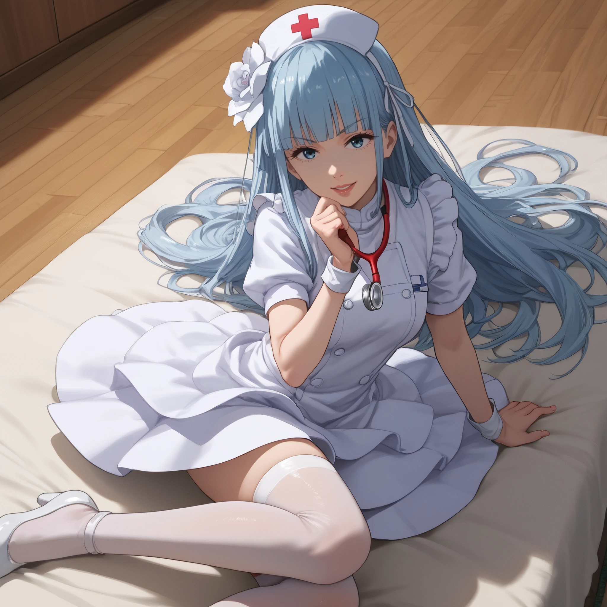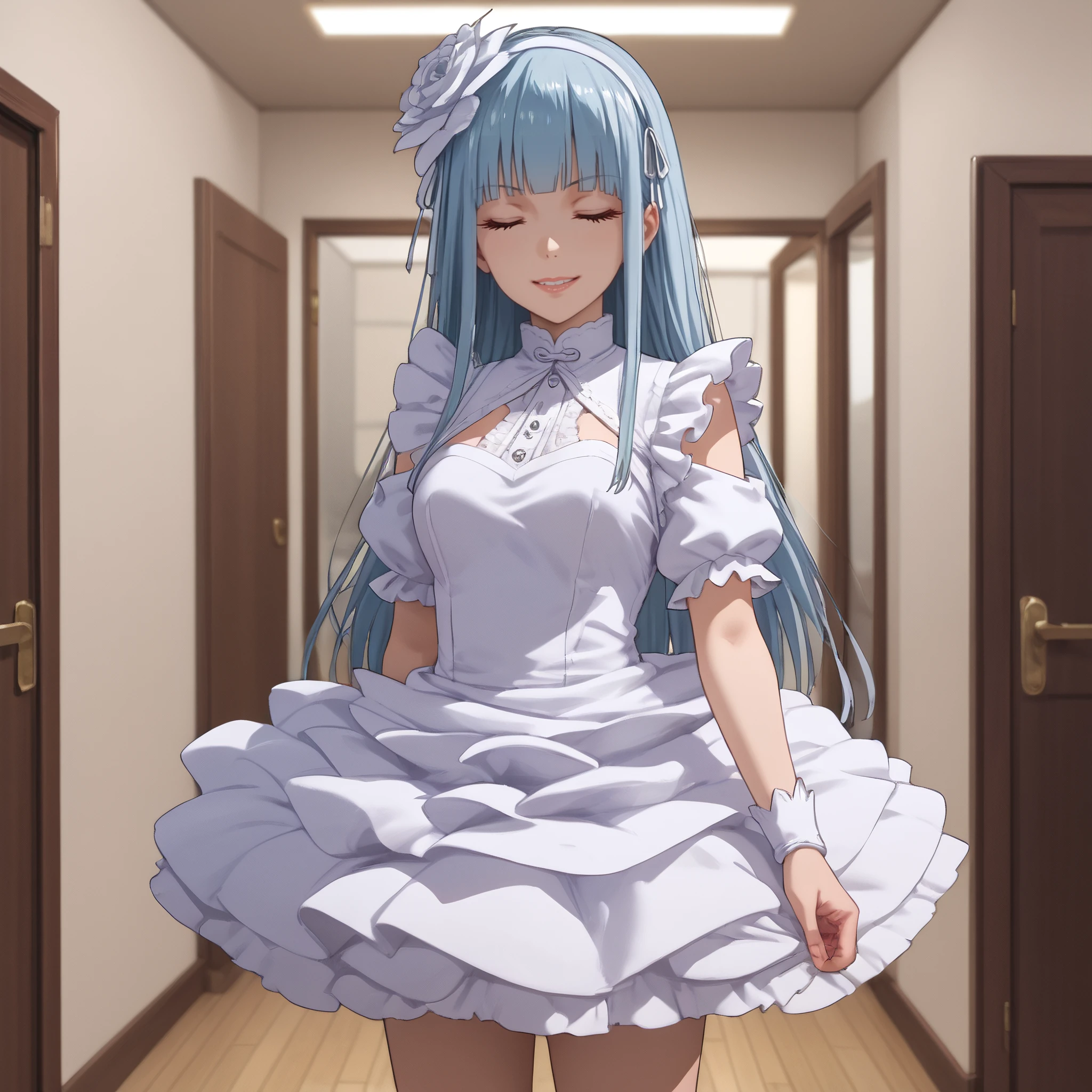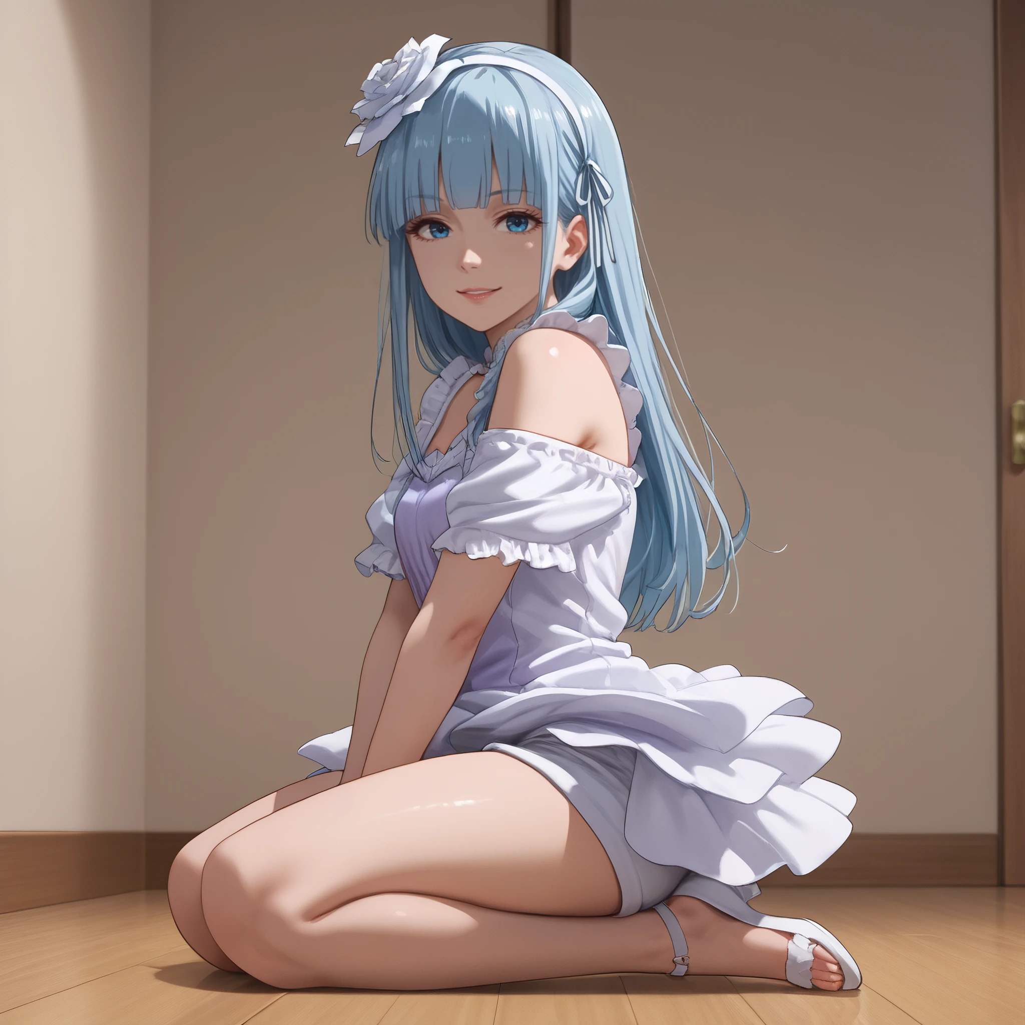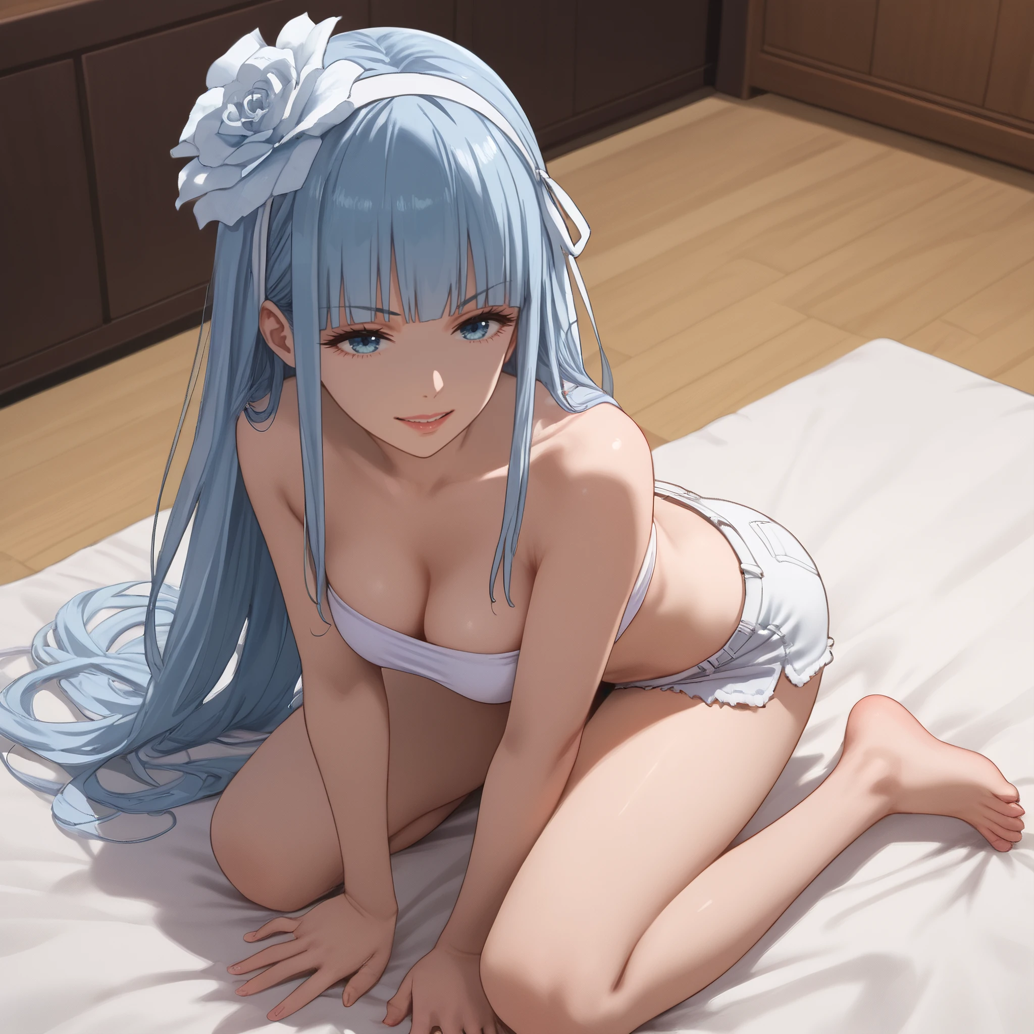 AMWManami, long hair, bangs, blunt bangs, hair ornament, blue hair, hair flower, ribbon, hairband, eyebrows visible through hair, blue eyes, hair ribbon,