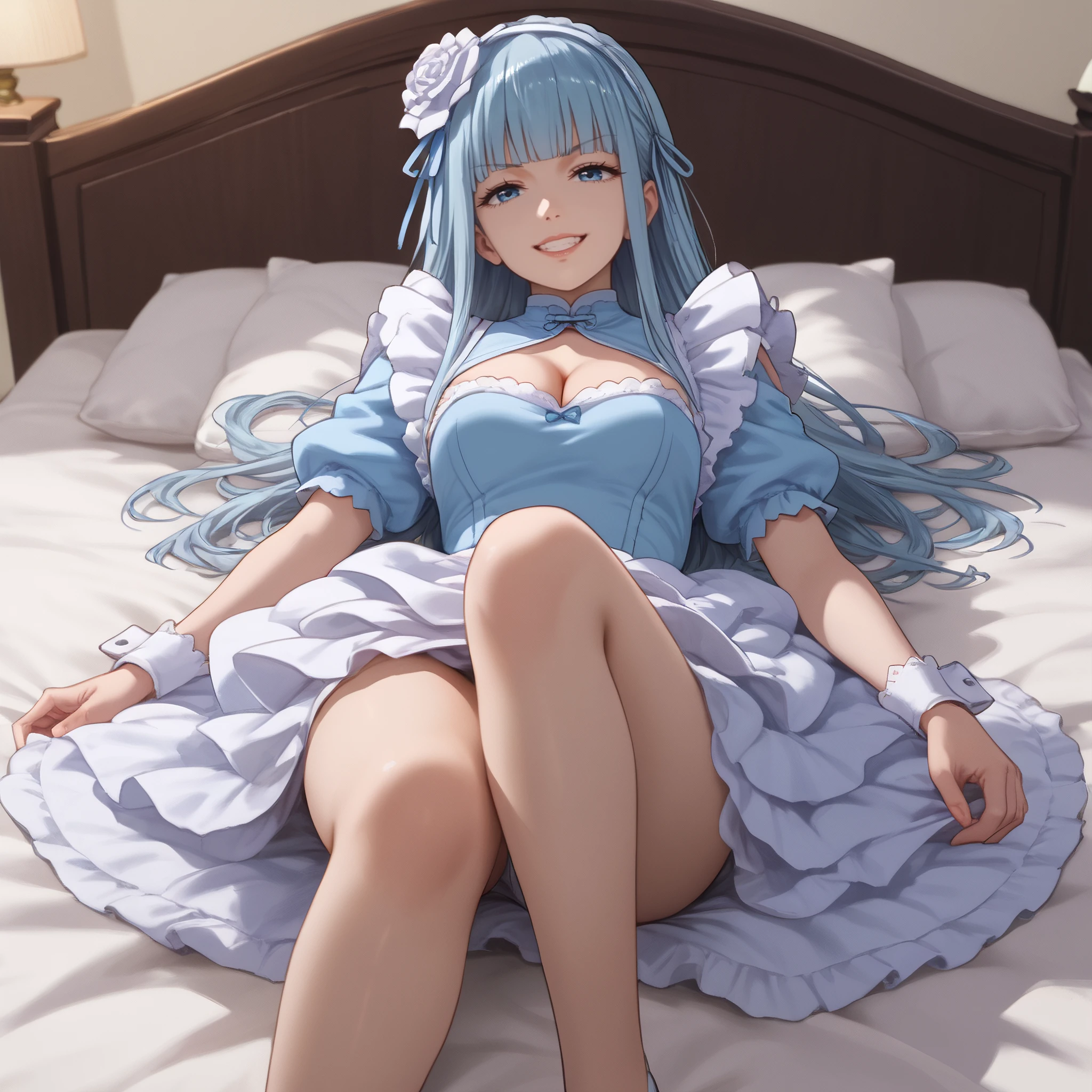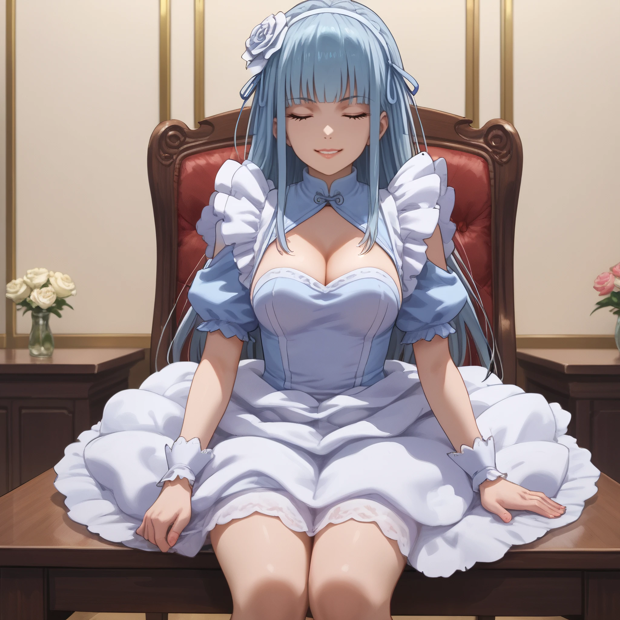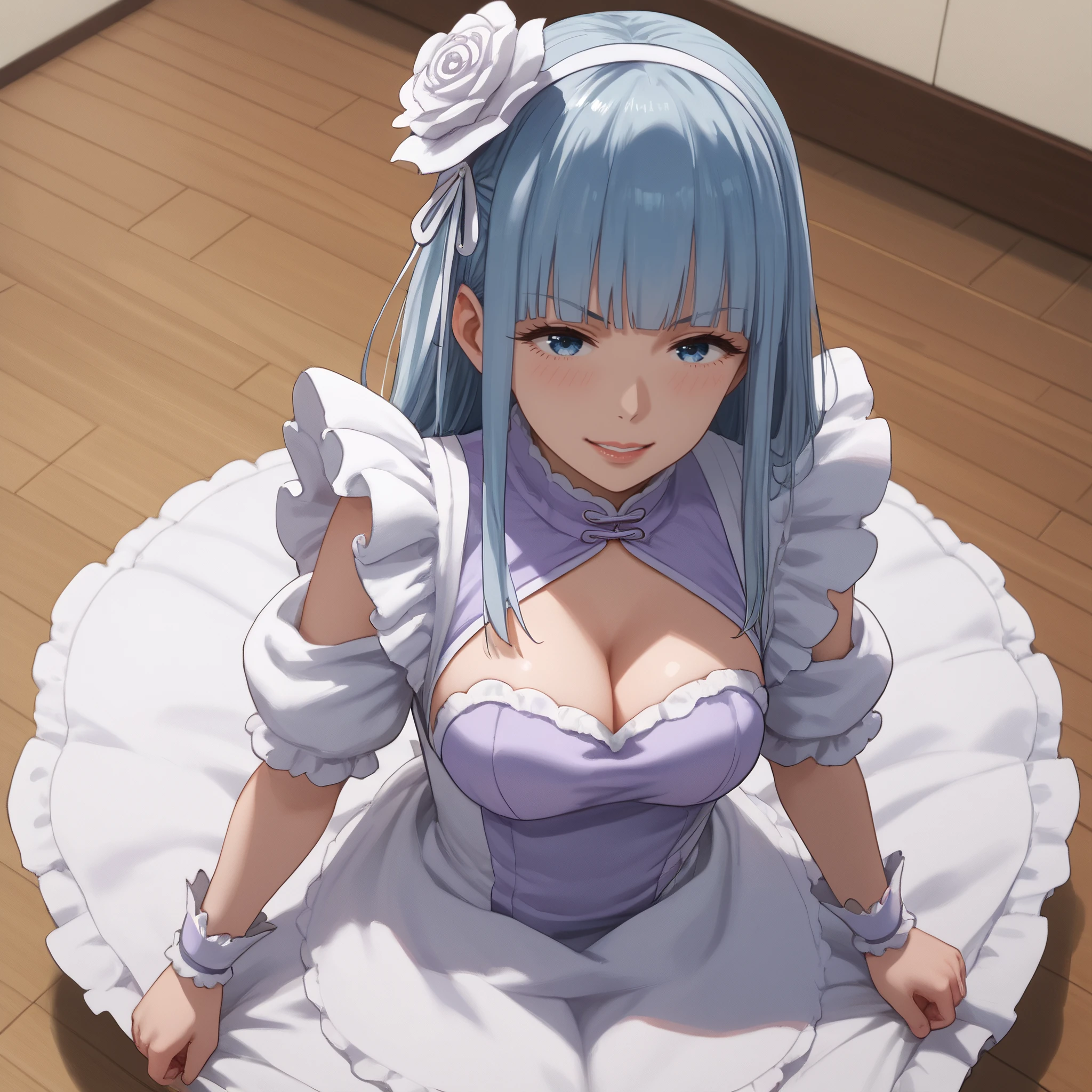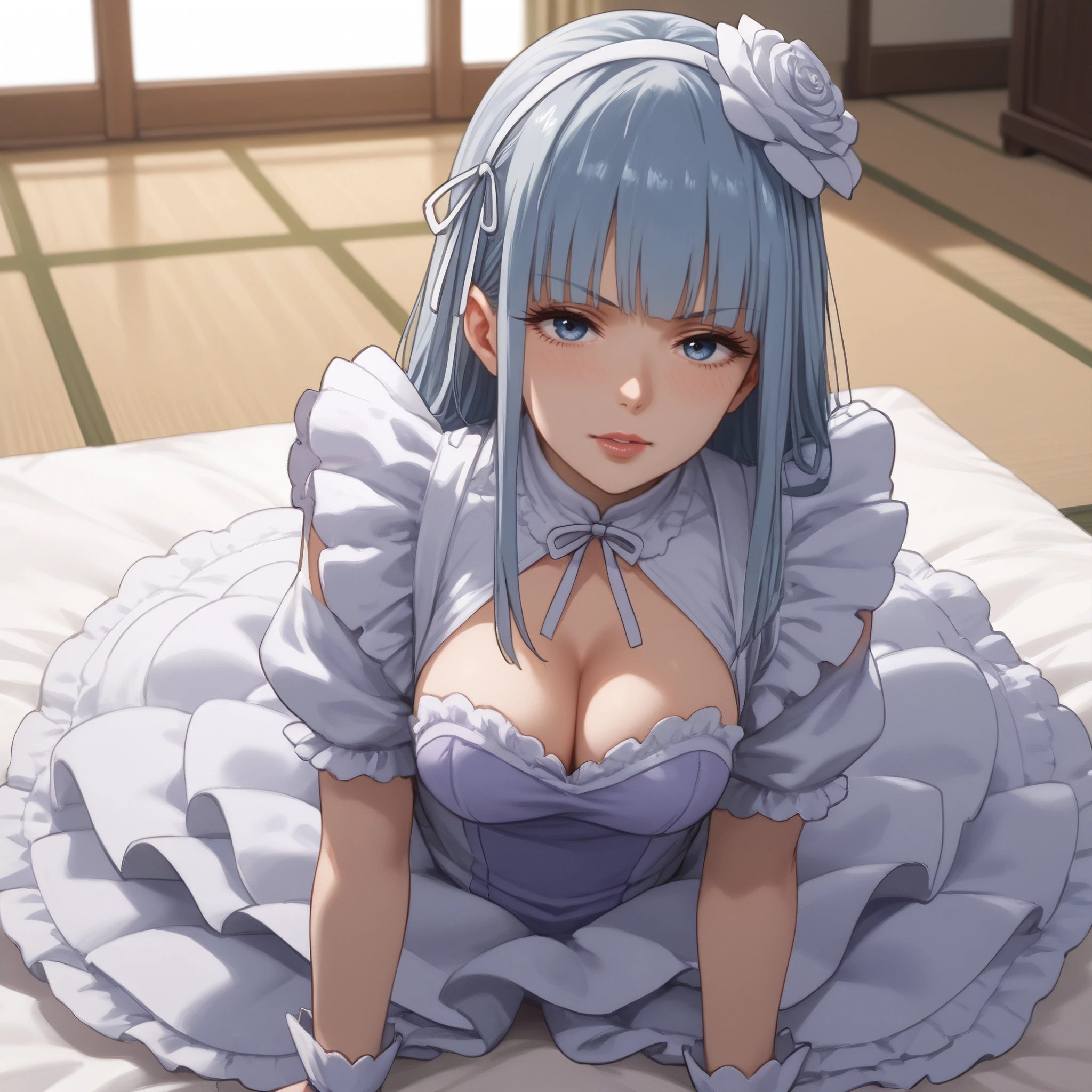 dress, frills, cleavage, maid, rose, puffy sleeves, gloves, wrist cuffs, apron, puffy short sleeves, single thighhigh, cleavage cutout,