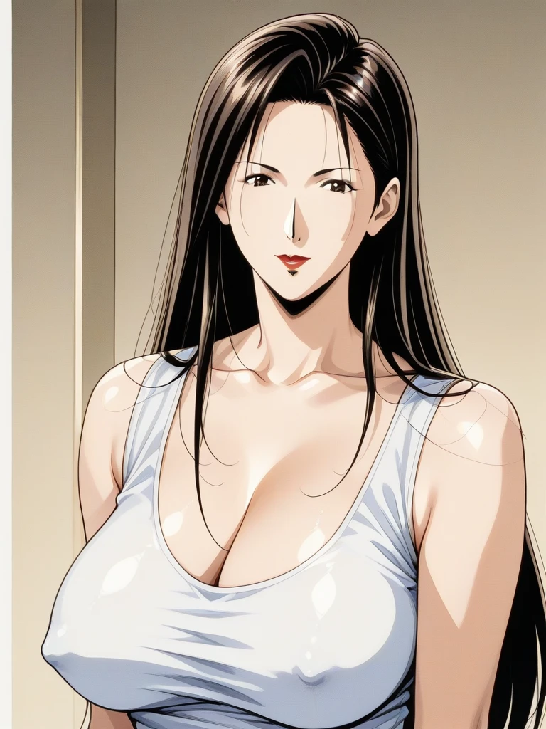 himuro, solo,realistic mature anime woman 30s, ((realistic proportions:1.2)),female body,voluptuous curvy body yet slim athletic build, fit body, busty, slightly huge breasts, side-parted voluminous long hair, thick airy straight hair,very long side-parted bangs, chest-bottom length side fringe, beautiful shaped women face with subtle oval shape, elegant slender face, dark eyes, clean thin lineart, realistic bustline, adult female proportions, highly detailed shading. early 2000s adult anime style, anime screencap, Anime style, cel-shaded, mature design character, (sharp pointed chin:1.0).