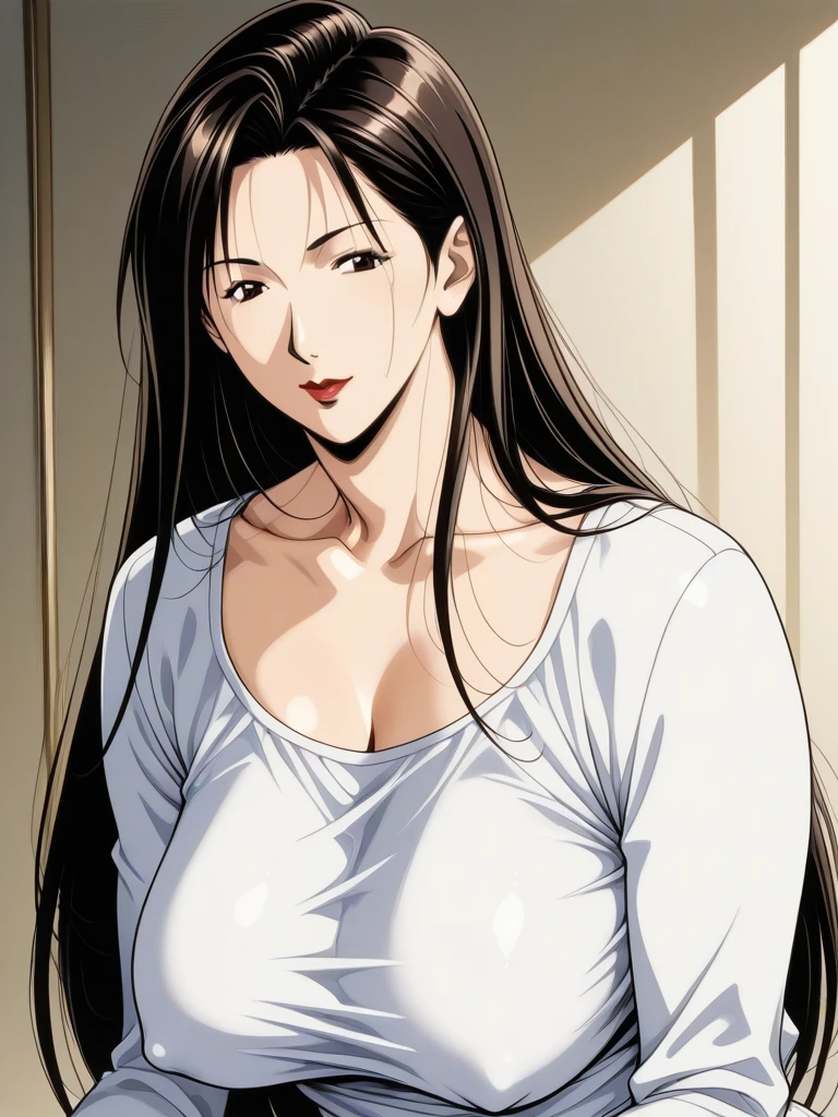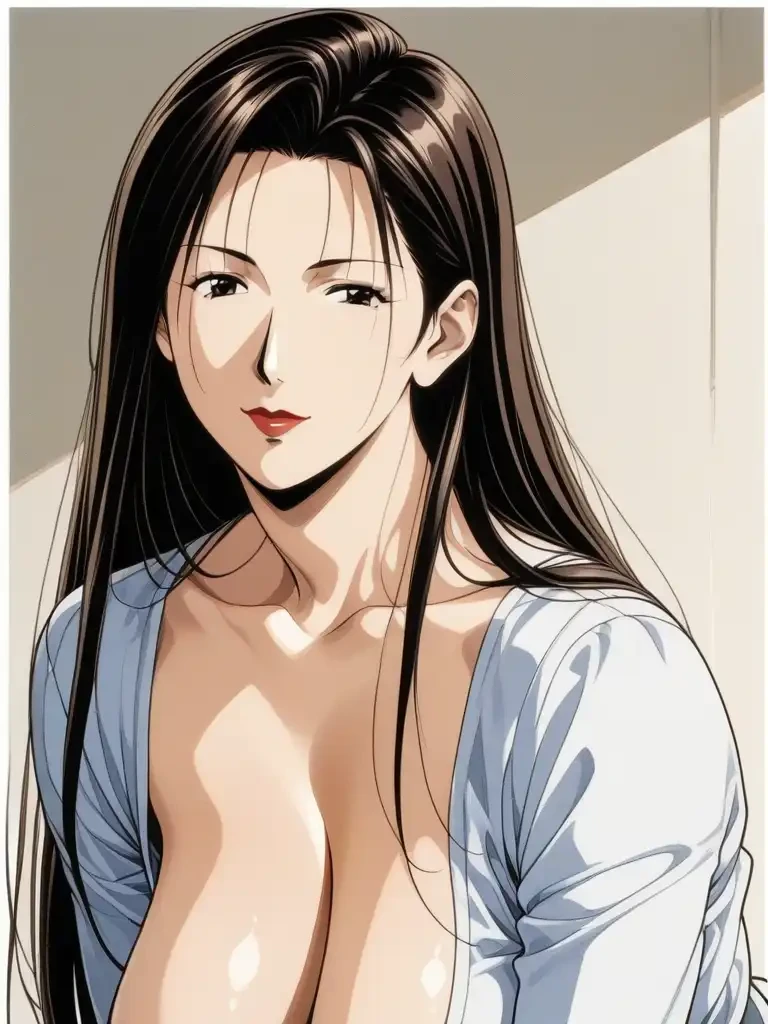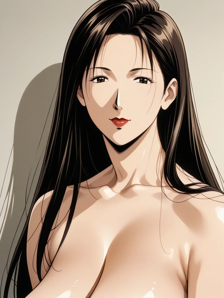 himuro, solo,realistic mature anime woman 30s, ((realistic proportions:1.2)),female body,voluptuous curvy body yet slim athletic build, fit body, busty, slightly huge breasts, side-parted voluminous long hair, thick airy straight hair,very long side-parted past the shoulders, hair covering chests, chest-bottom length side fringe, beautiful shaped women face with subtle oval shape, elegant slim face with sharp jawline, dark eyes, clean thin lineart, realistic bustline, adult female proportions, highly detailed shading. early 2000s adult anime style, anime screencap, Anime style, cel-shaded, mature design character, (sharp pointed chin:1.0).