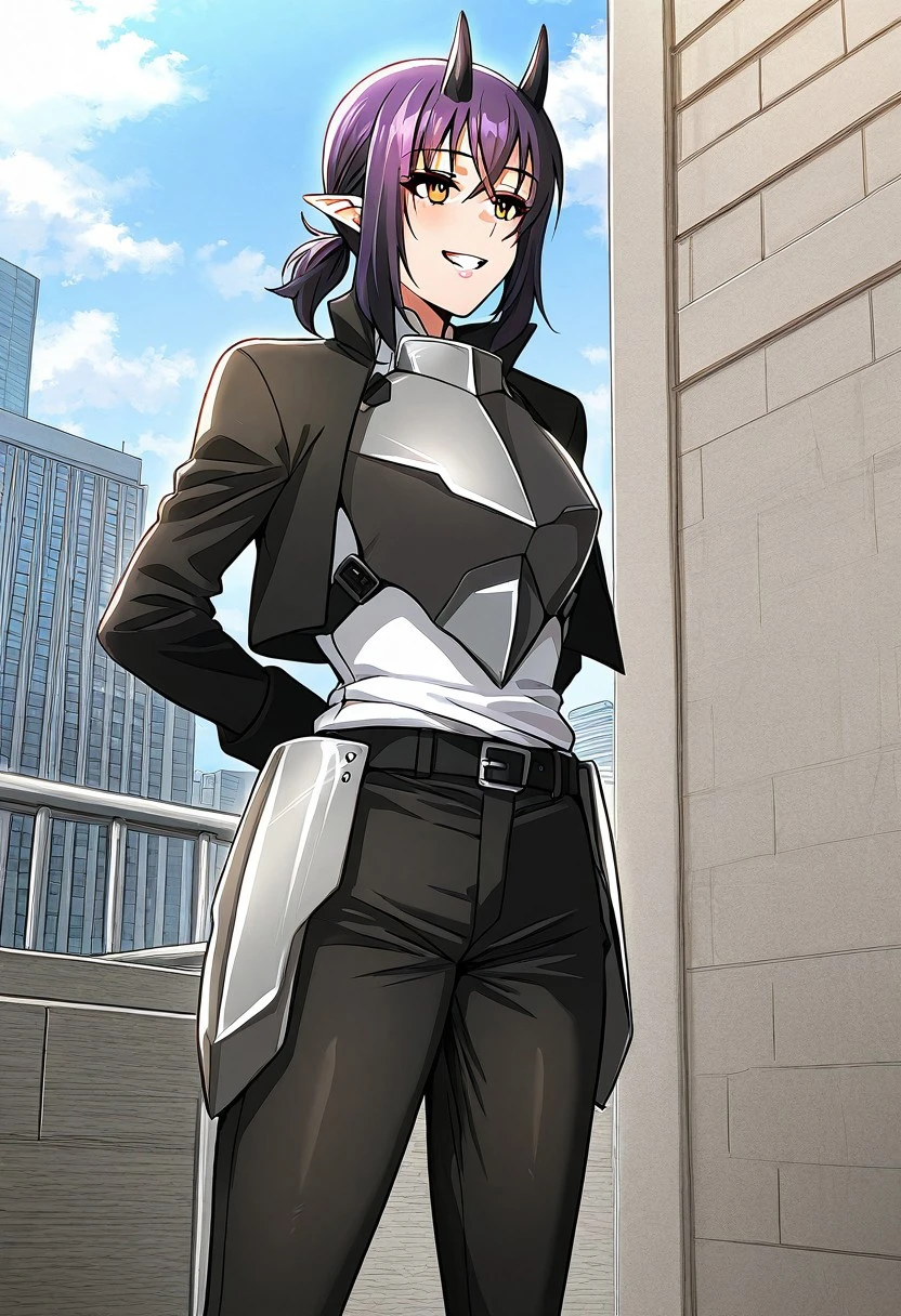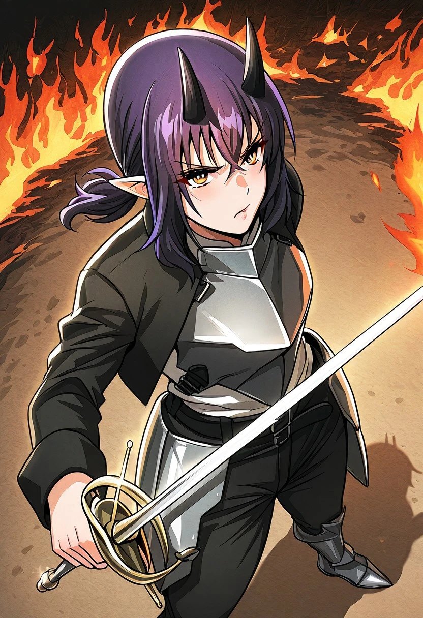 (( <lora:ozma_zoroaster:1> , ozma_zoroaster, thin waist, wide hips, beautiful skin, piercing amber eyes, clear eyes, bright pupils, beautiful eyes, beautiful purple hair, beautiful long hair, low ponytail, hair between eyes, bangs, big and shaggy breasts, natural beauty, extraordinary beautiful woman, attractive woman, super sexy woman, lustful body, sexy woman with seductive obscene body, sensual body, voluptuous body, sexy beauty, no piercings, no piercing, pointy ears, )), ((sharp black demon horns, ))