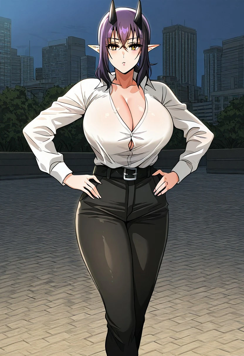 2. ((sexy long-sleeves white shirt, obscene cleavage, huge cleavage, black trousers, black belt, ))