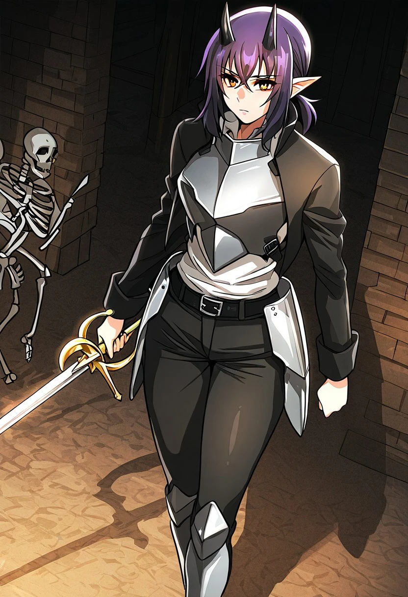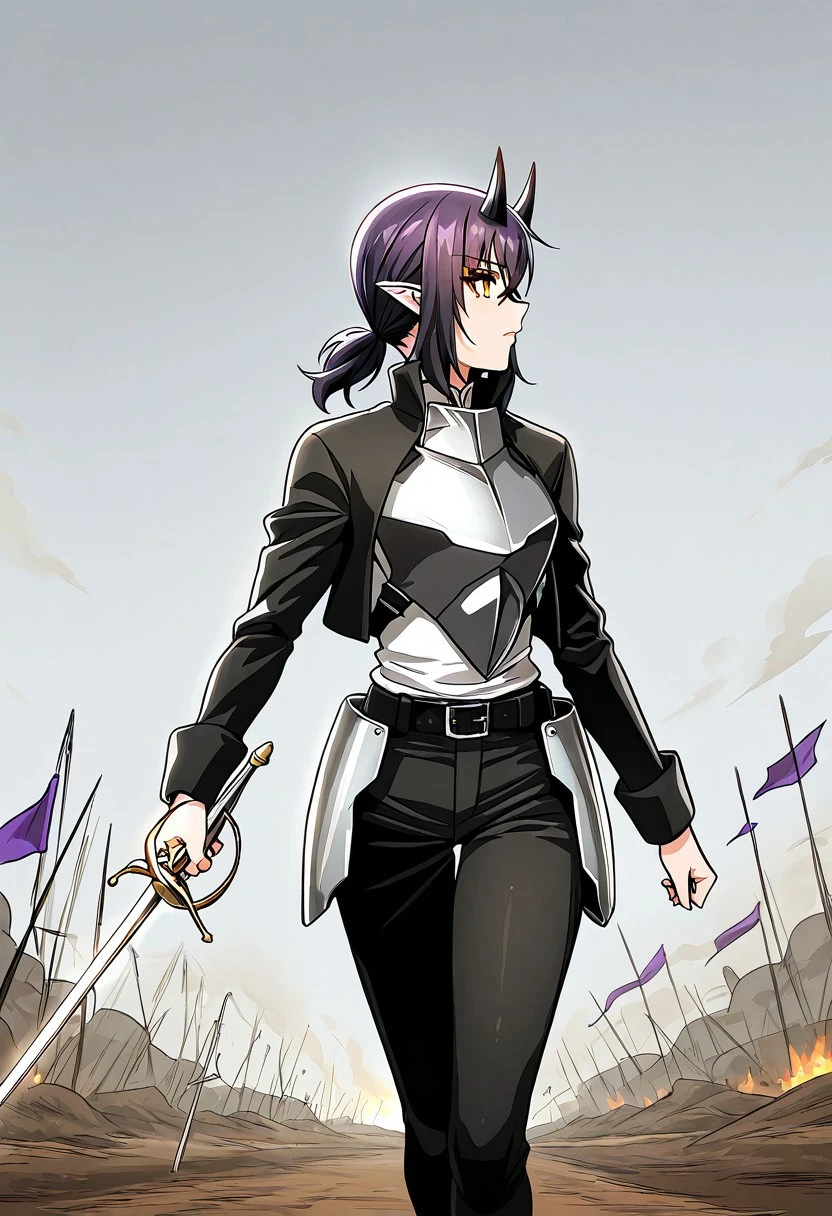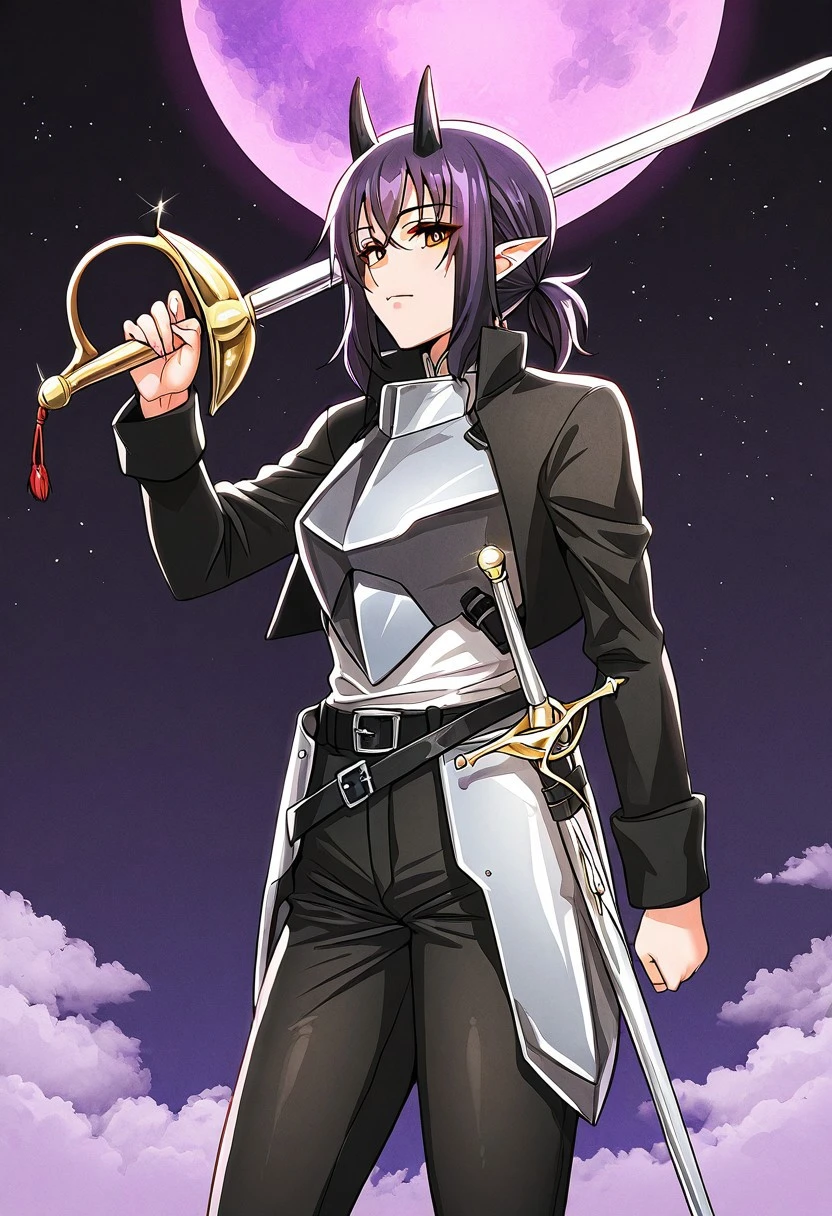 1. ((light armor, open black jacket, metal breastplate, white shirt, black trousers, black belt, metal hip armor, metal shin armor, black sword belt, black sword scabbard, )) rapier sword with gold crossguard, ; white sword scabbard, sabre with simple white handle