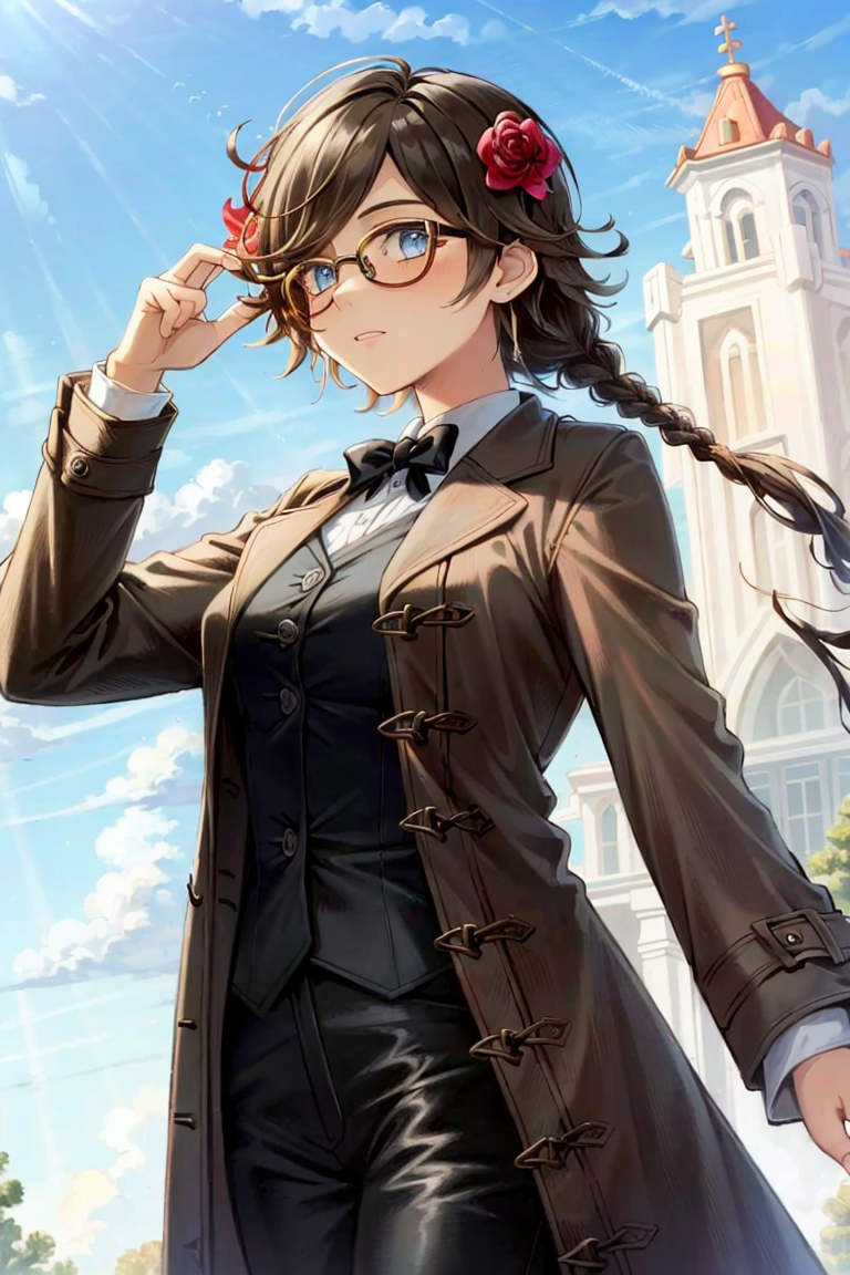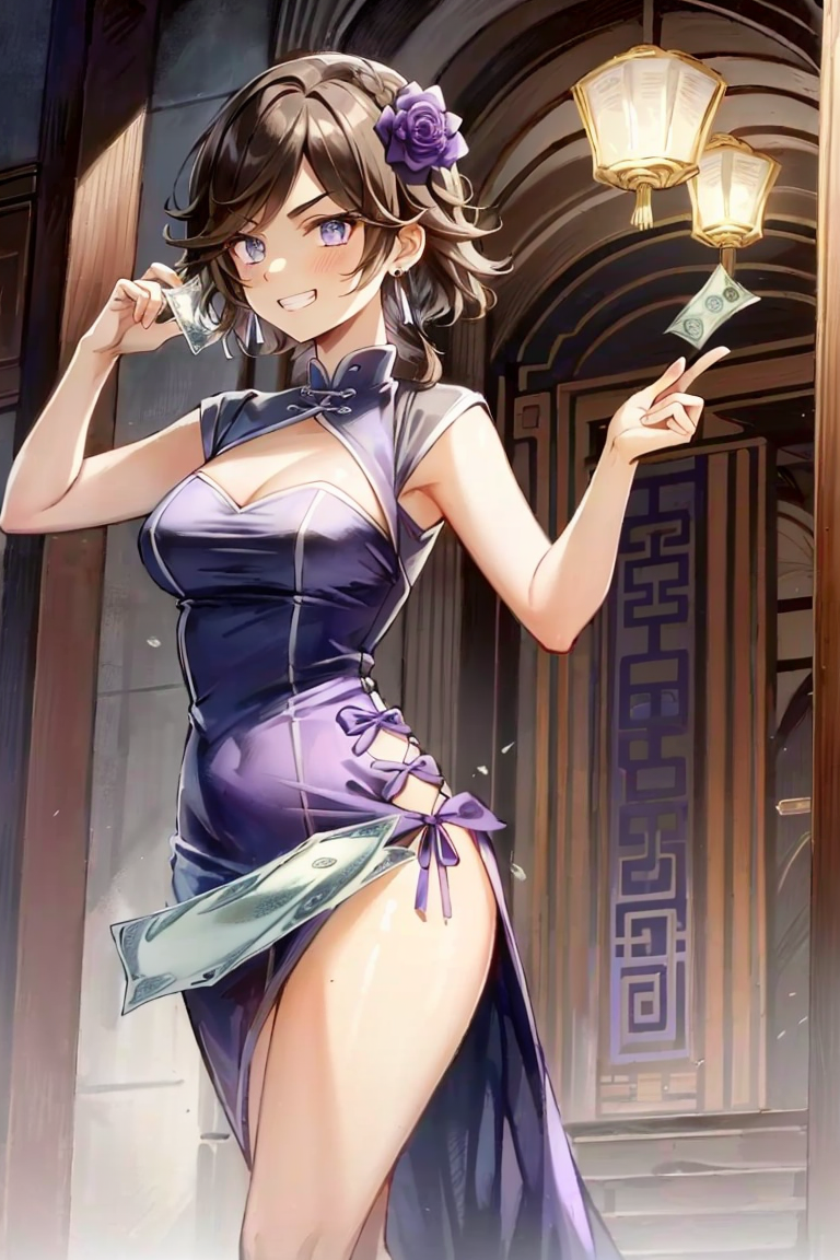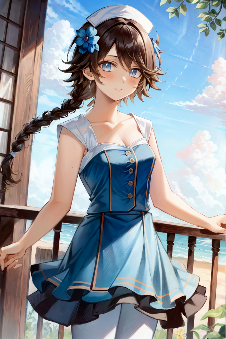 Use "dress" and "hair flower" for her outfit. The dress is not always perfect.