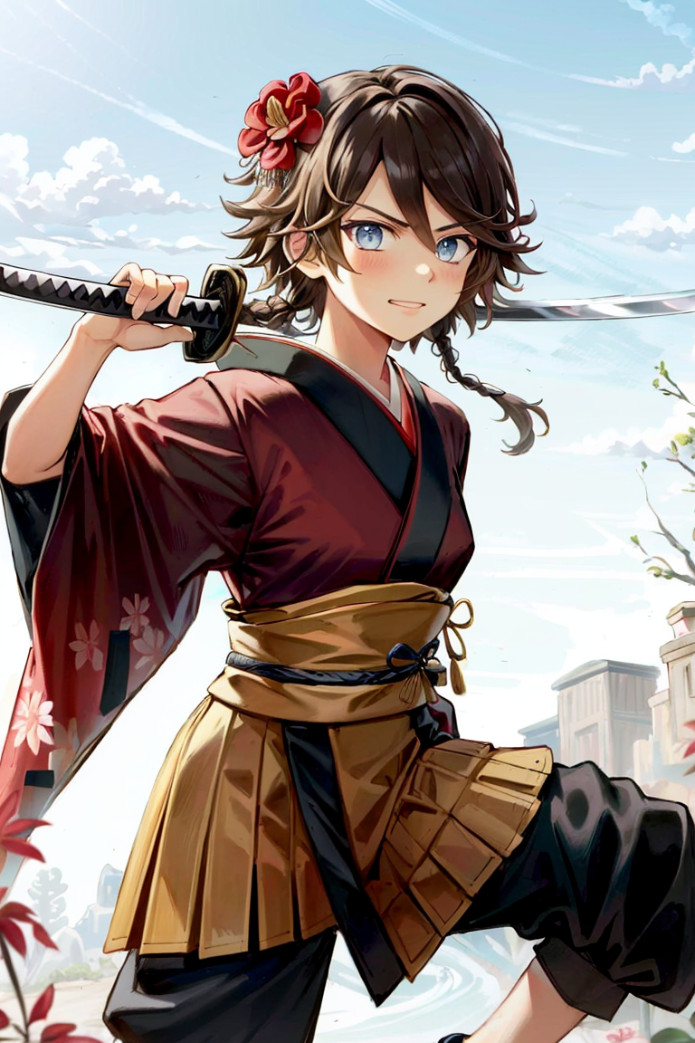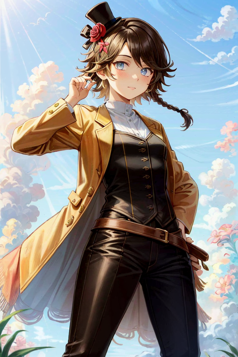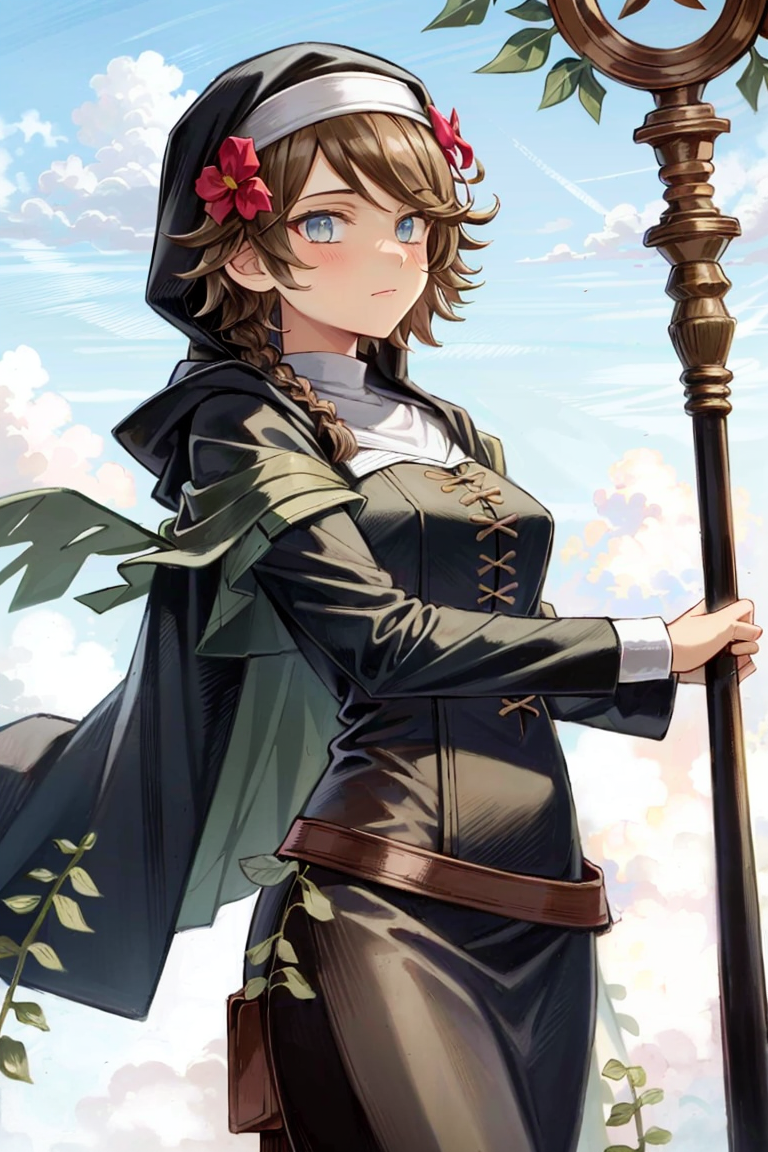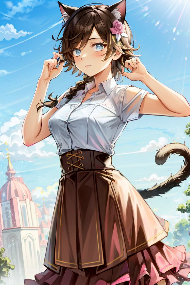 Use "dress" and "hair flower" for her outfit. The dress is not always perfect.