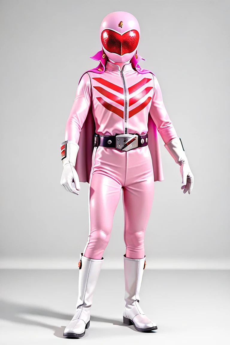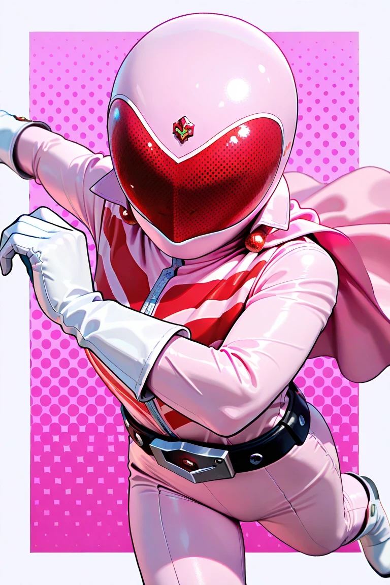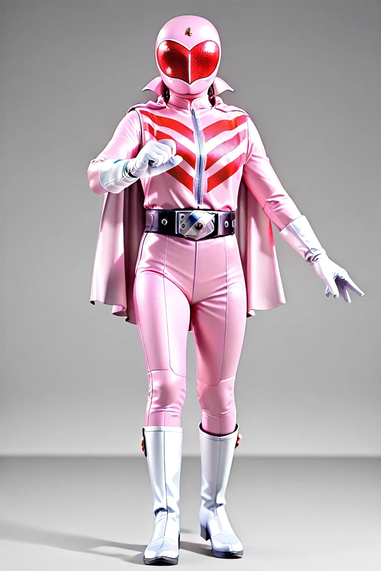 Momoranger, 1girl, pink helmet, pink bodysuit, pink pants, black belt, white gloves, white boots, pink cape, red earrings,