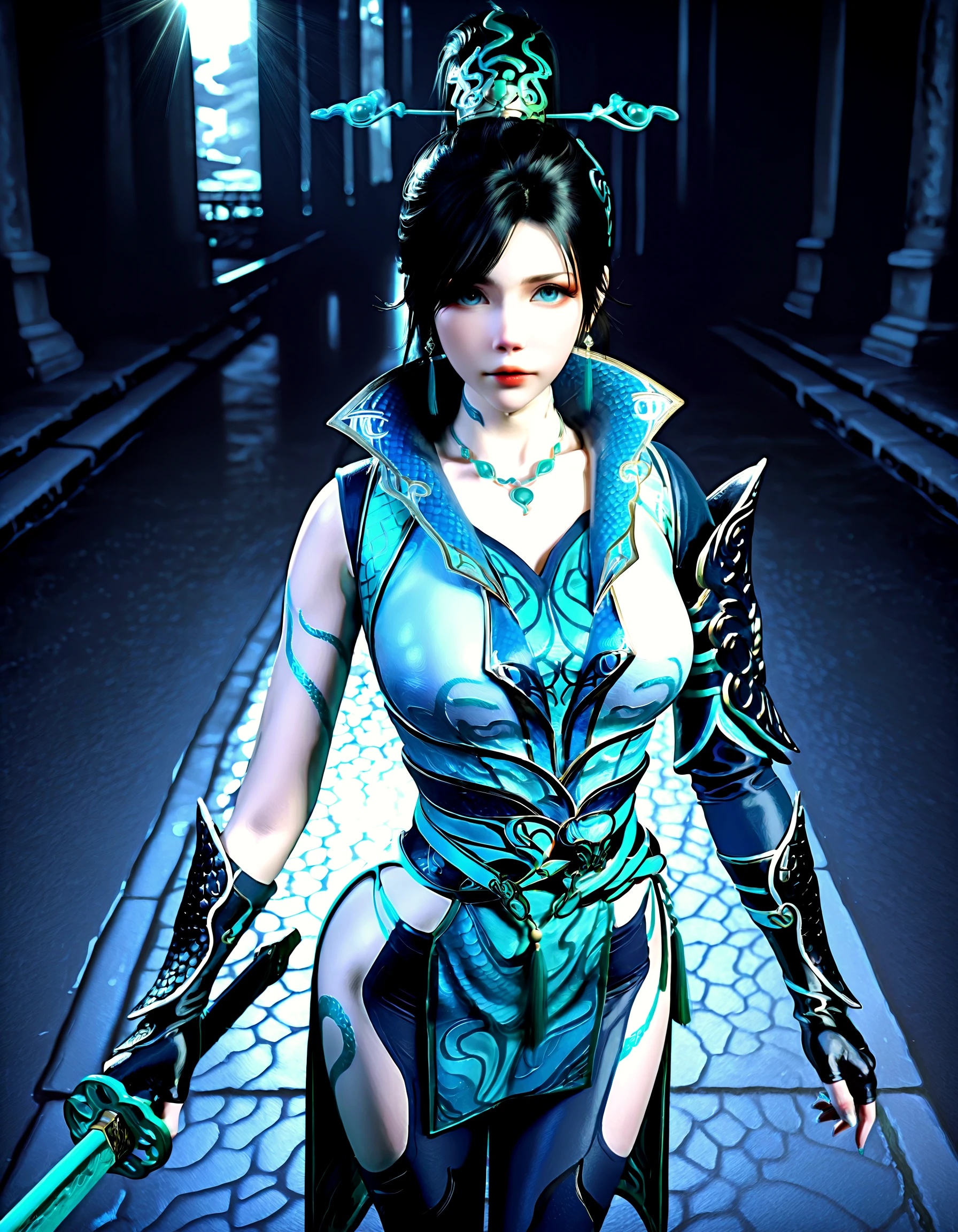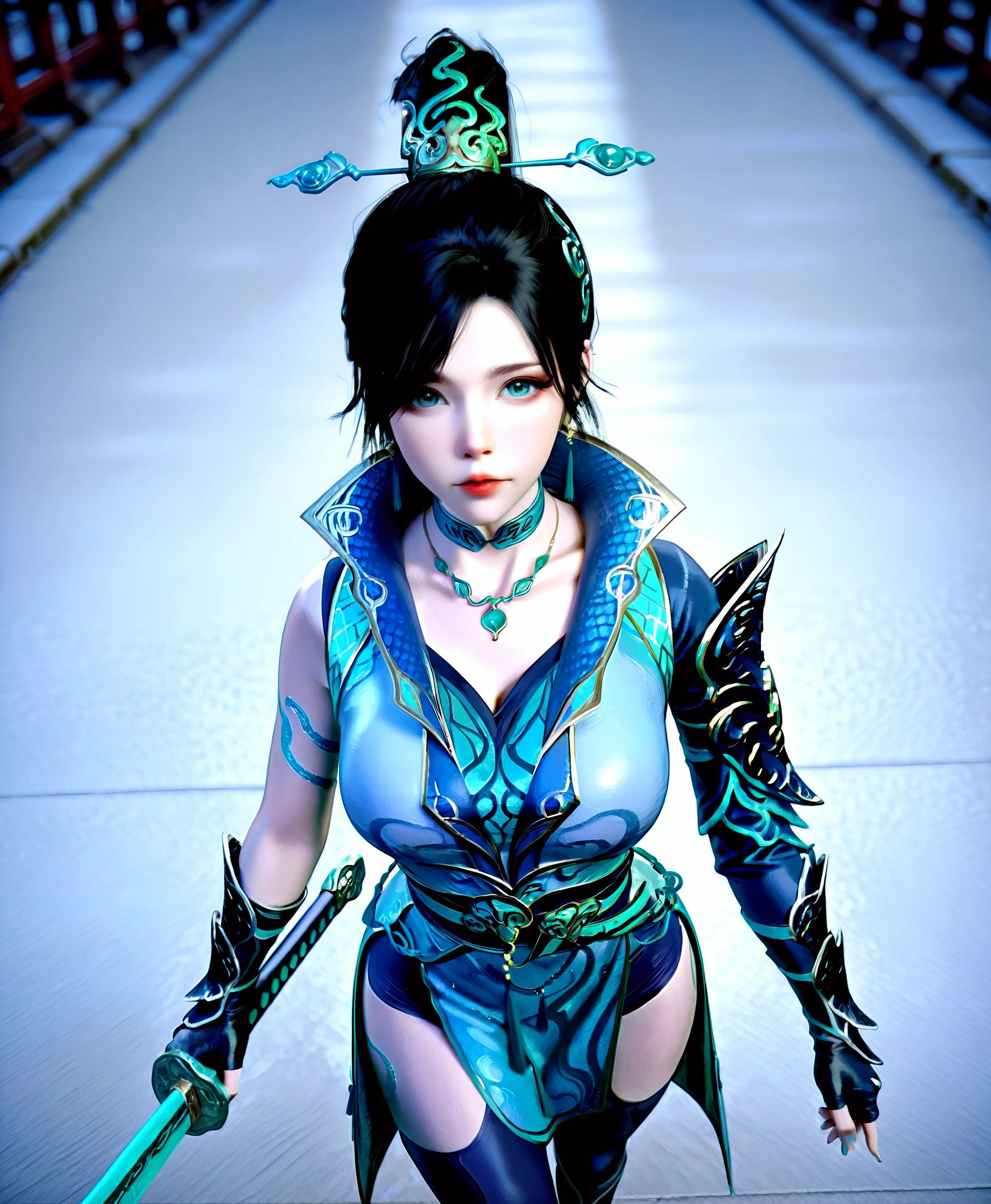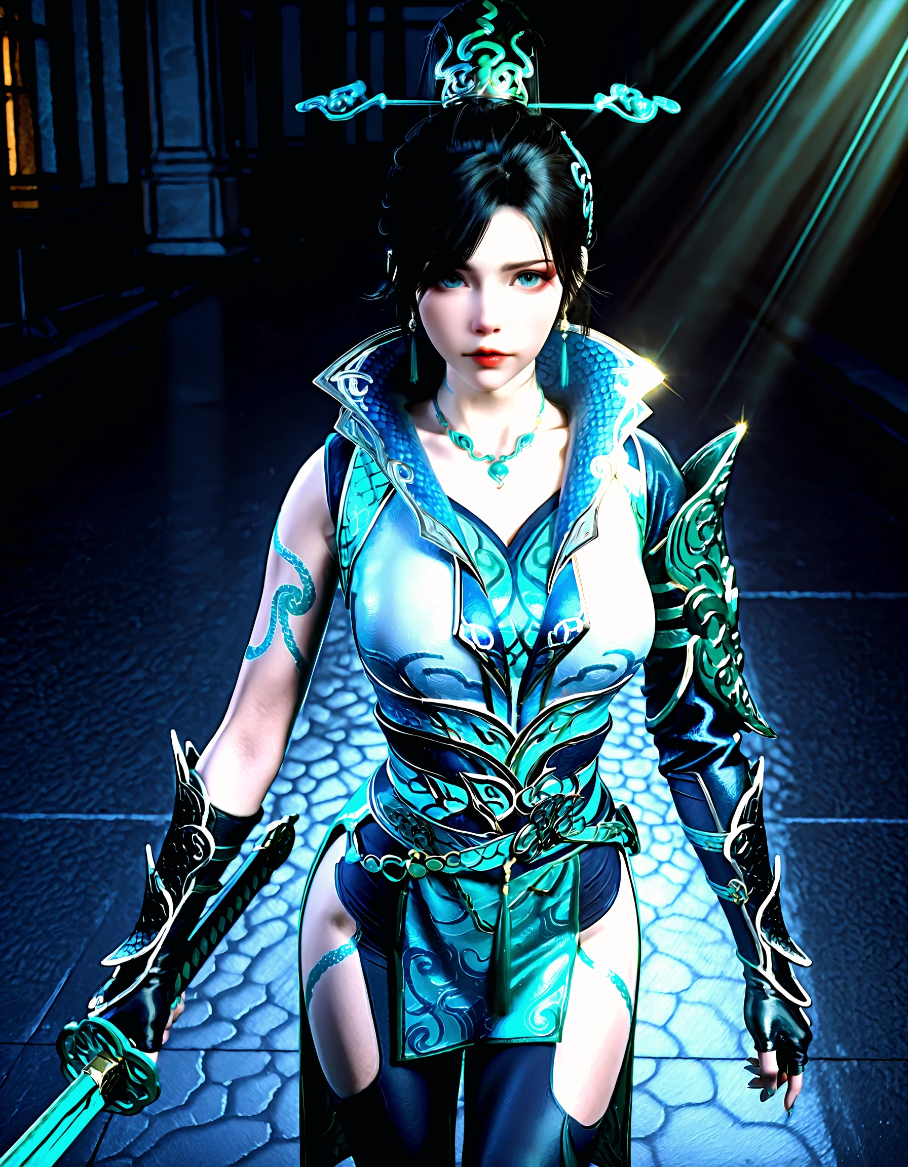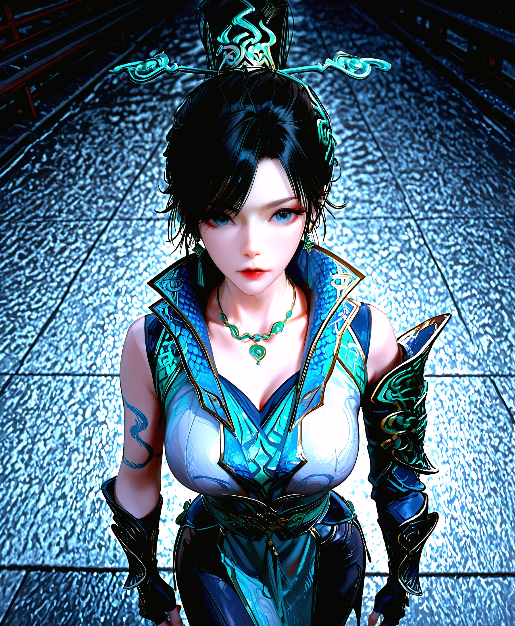 qing lin, 1girl, black hair, updo, teal eyes, scales, tattoos, china dress, armor, choker, gauntlets, leggings, chignon, hairpin, aqua eyes, gold trim, fingerless gloves, high collar, belt chains, boots, arms at sides, t-pose, simple background, asymmetrical skirt, pelvic curtain, high slit