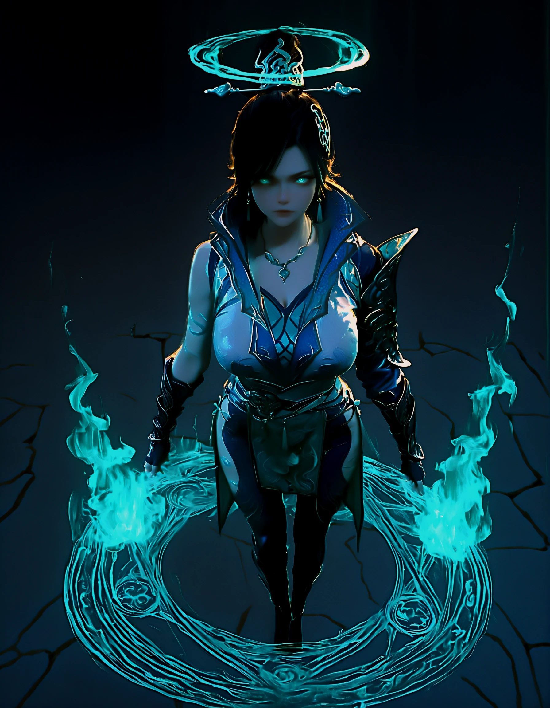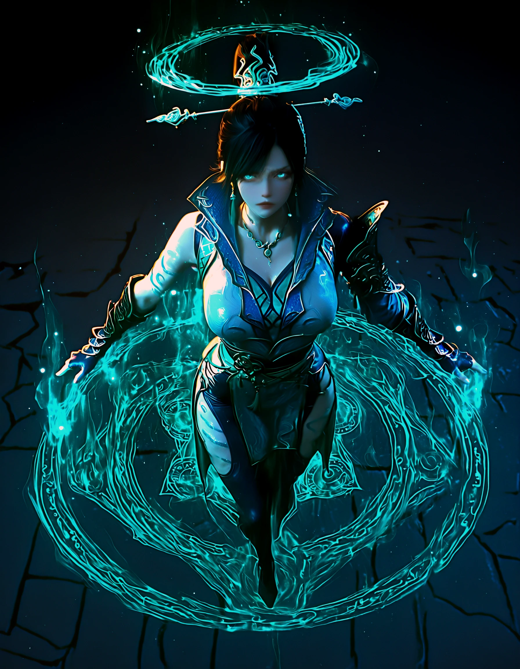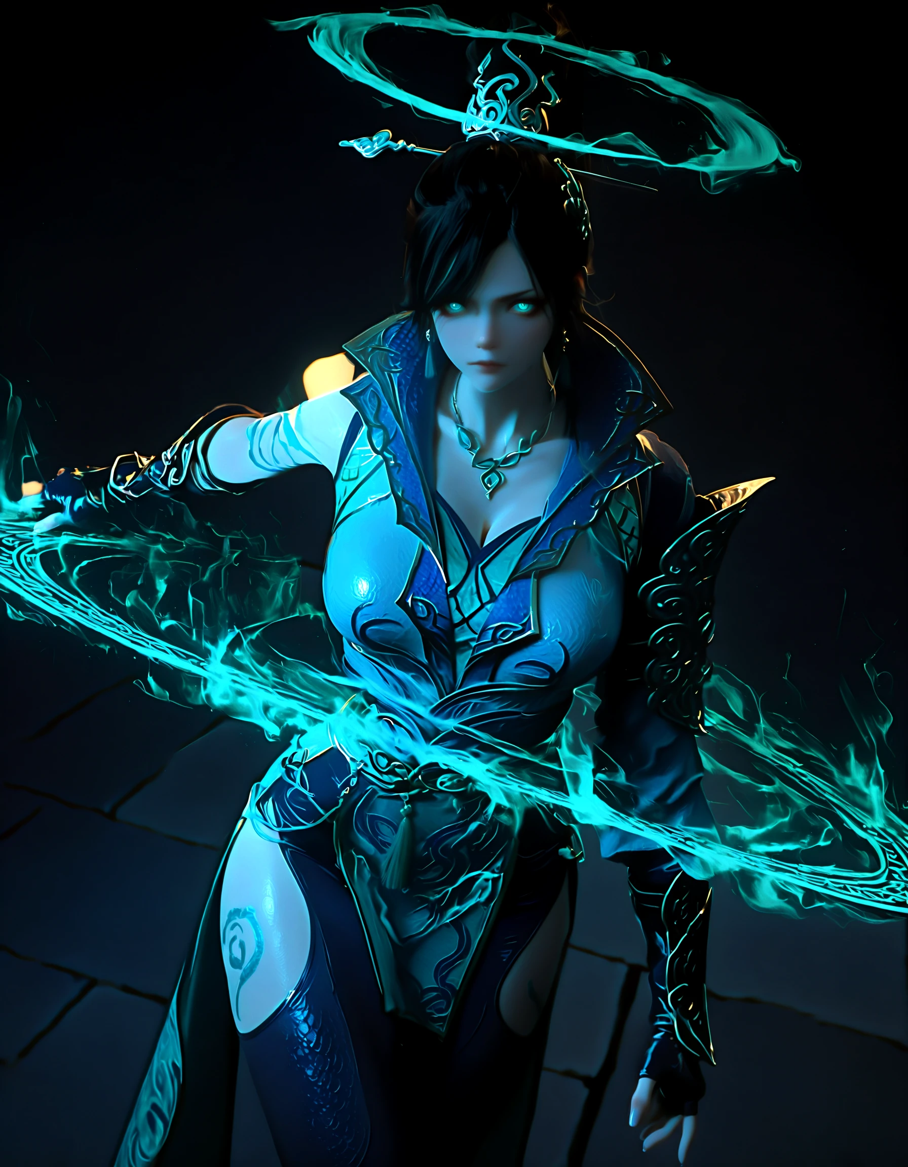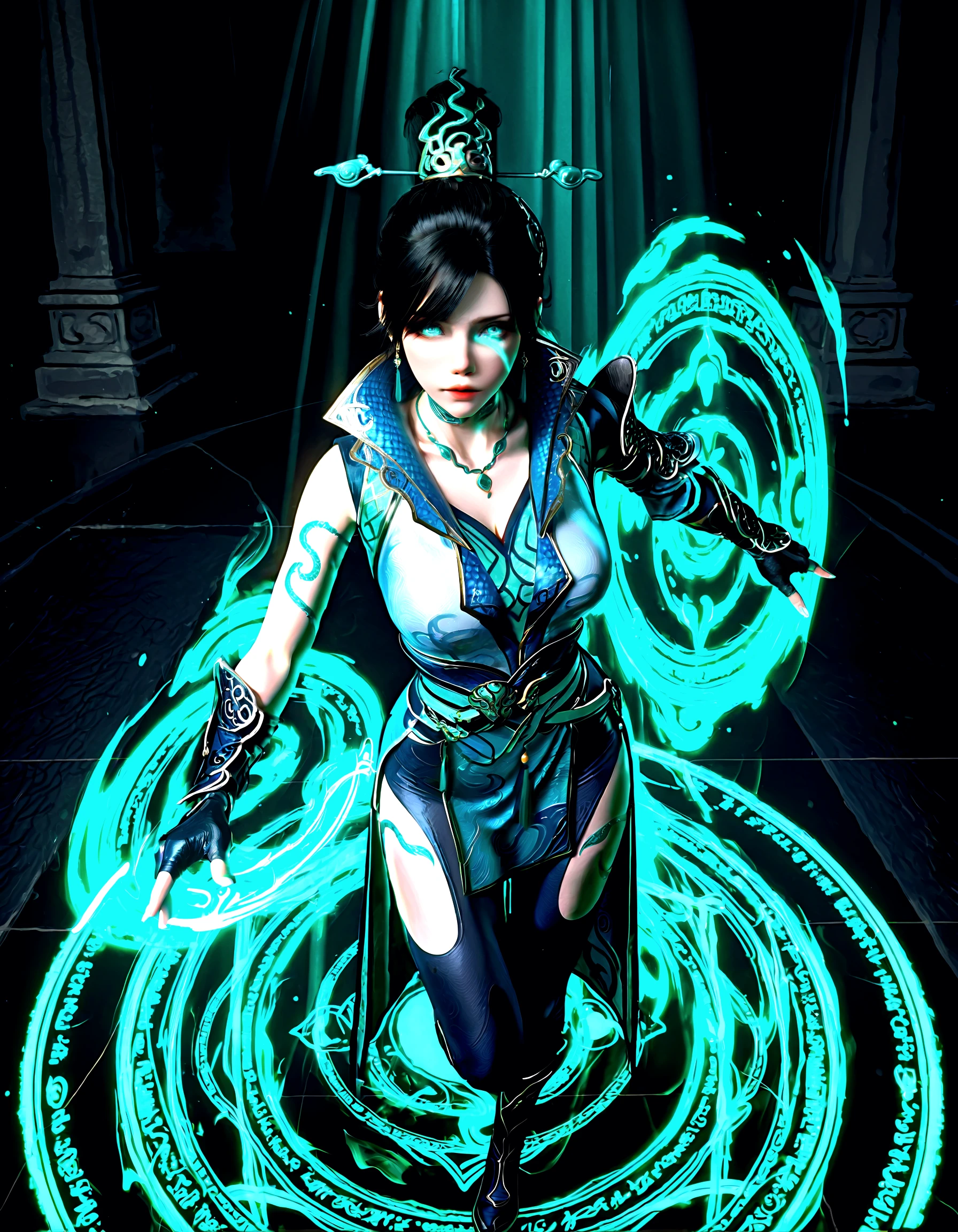 qing lin, 1girl, black hair, updo, teal eyes, scales, tattoos, china dress, armor, choker, gauntlets, leggings, chignon, hairpin, aqua eyes, gold trim, fingerless gloves, high collar, belt chains, boots, arms at sides, t-pose, simple background, asymmetrical skirt, pelvic curtain, high slit