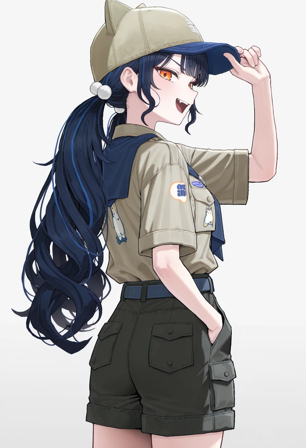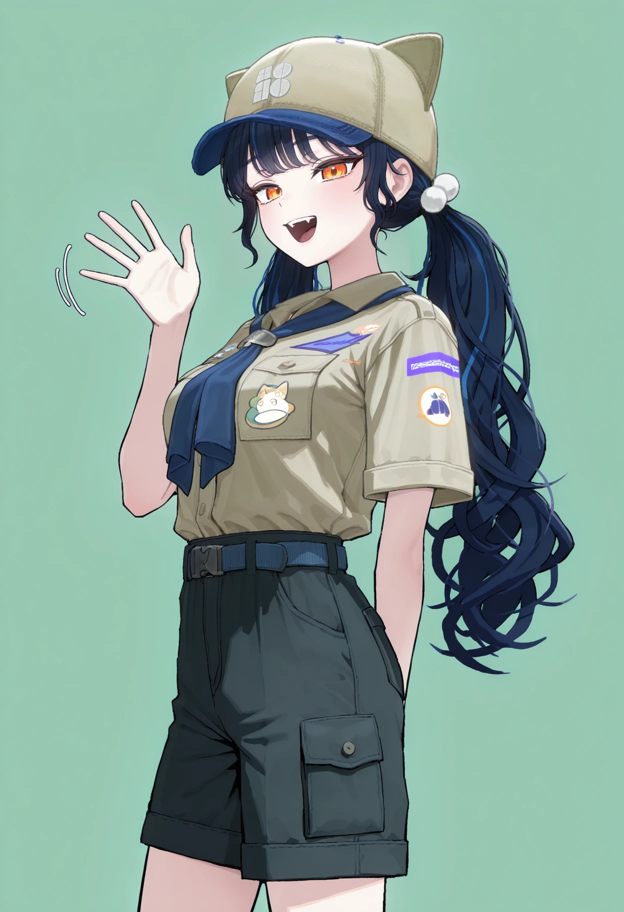 CTLP, brown hat, blue hat, cat hat, multicolored hat, orange eyes, dark blue hair, streaked hair, long hair, curly hair, bangs, low twintails, pom pom hair ornament, blue neckerchief, brown shirt, print shirt, breast pocket, short sleeves, sleeve cuffs, belt, black shorts, cargo shorts, blue kneehighs, brown footwear,