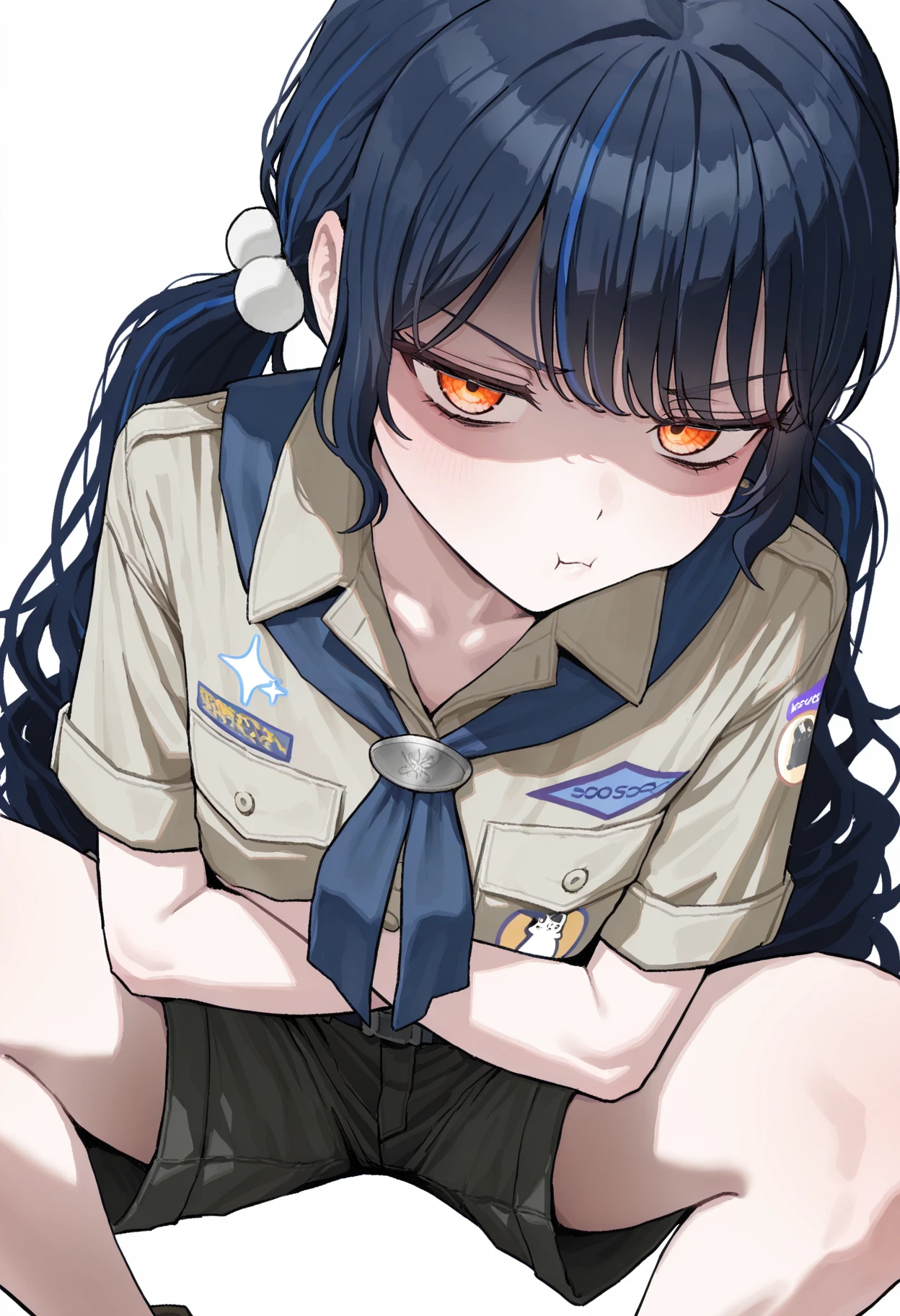 • CTLP, brown hat, blue hat, cat hat, multicolored hat, orange eyes, dark blue hair, streaked hair, long hair, curly hair, bangs, low twintails, pom pom hair ornament, blue neckerchief, brown shirt, print shirt, ?????? pocket, short sleeves, sleeve cuffs, belt, black shorts, cargo shorts, blue kneehighs, brown footwear,