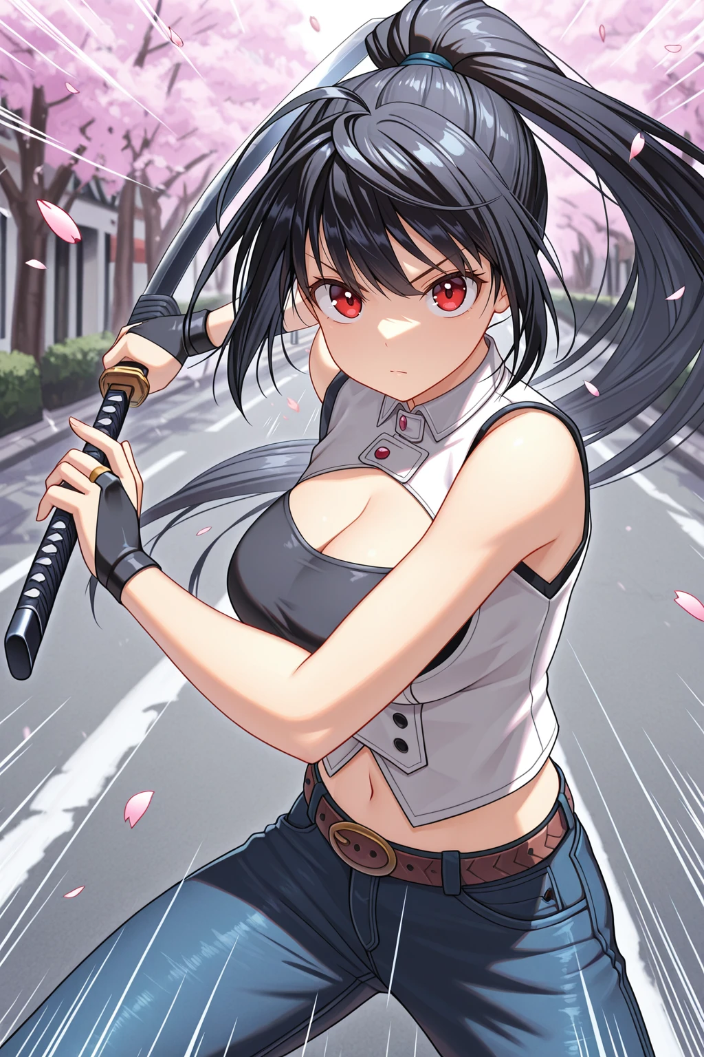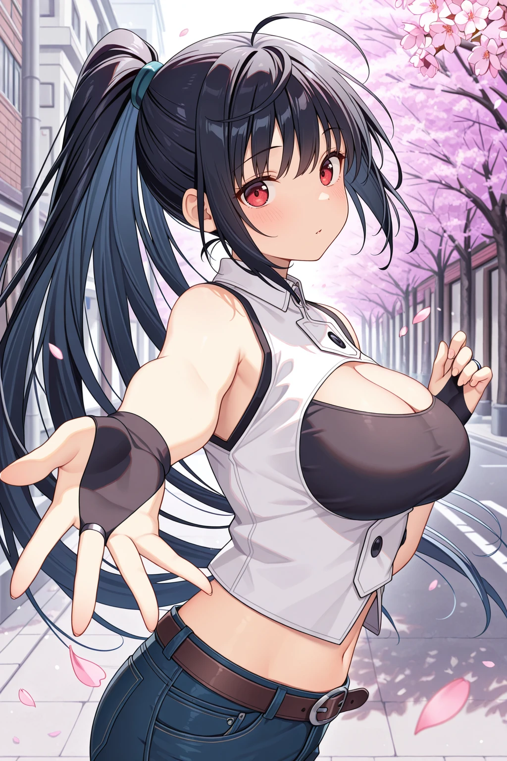 cleavage, cleavage cutout, midriff, navel, sleeveless, black gloves, fingerless gloves, bridal gauntlets, belt, blue pants, jeans