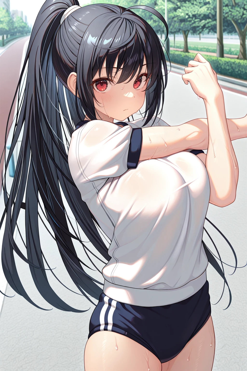 yaegashi shizuku, black hair, very long hair, ponytail, high ponytail, ahoge, red eyes