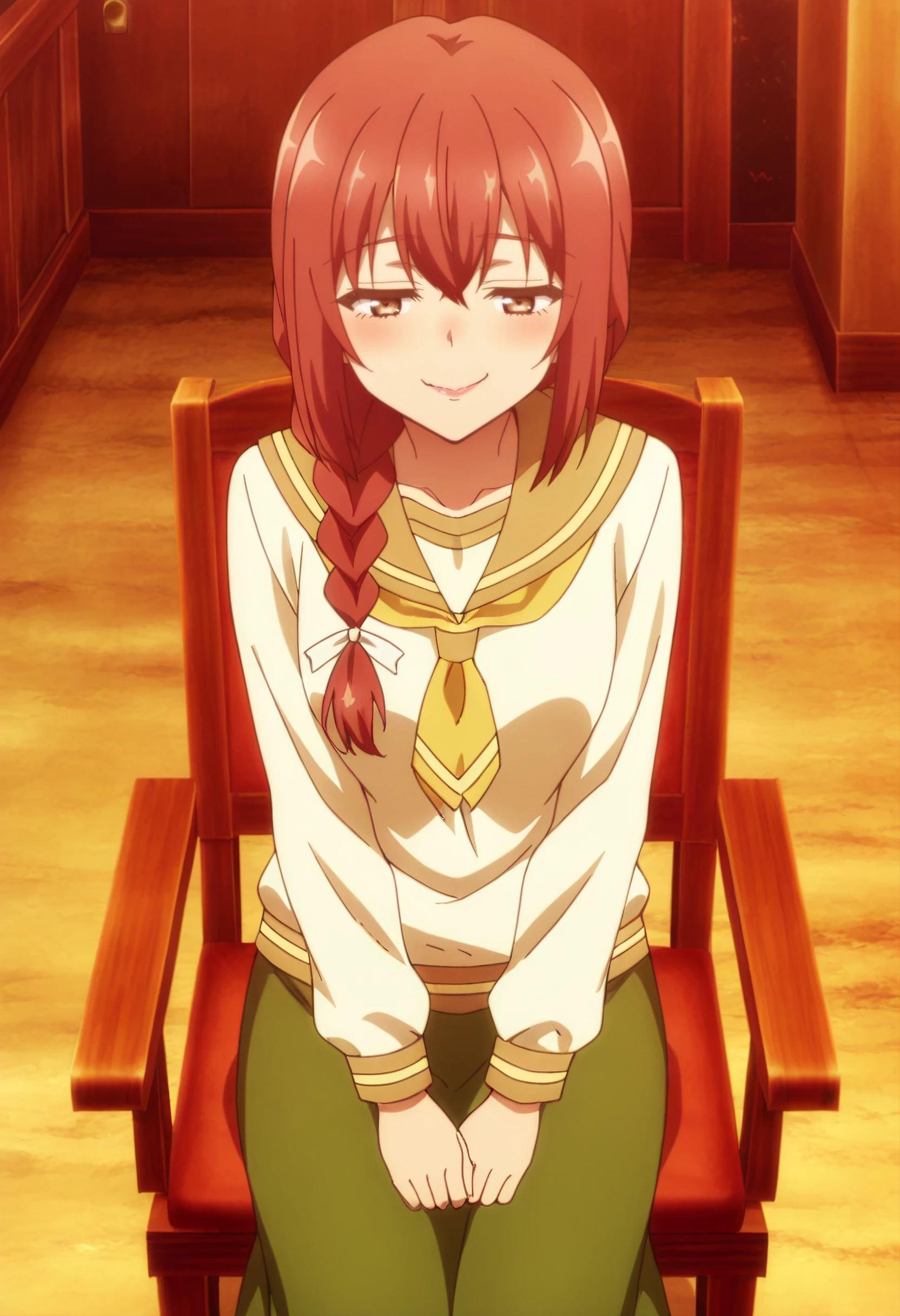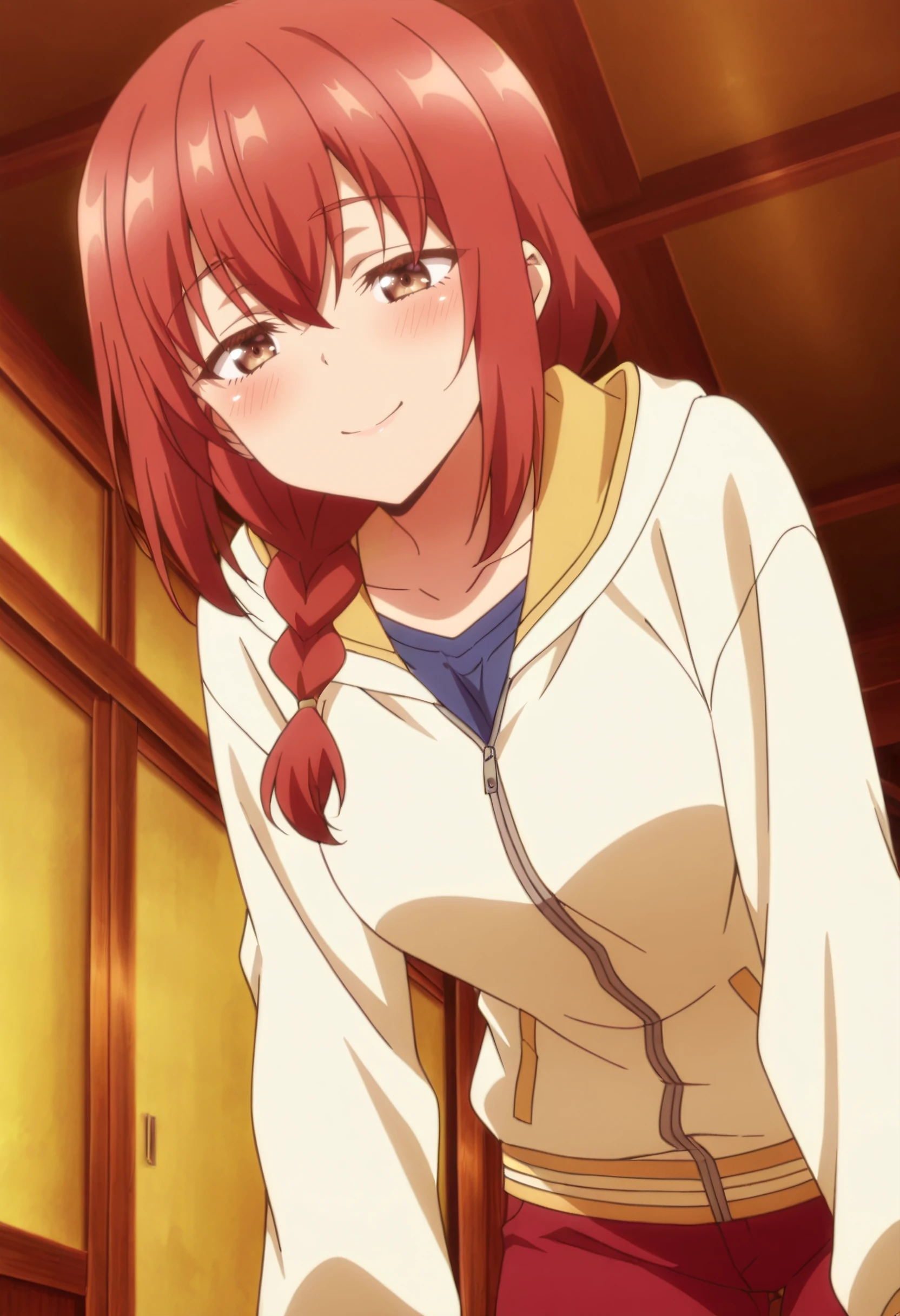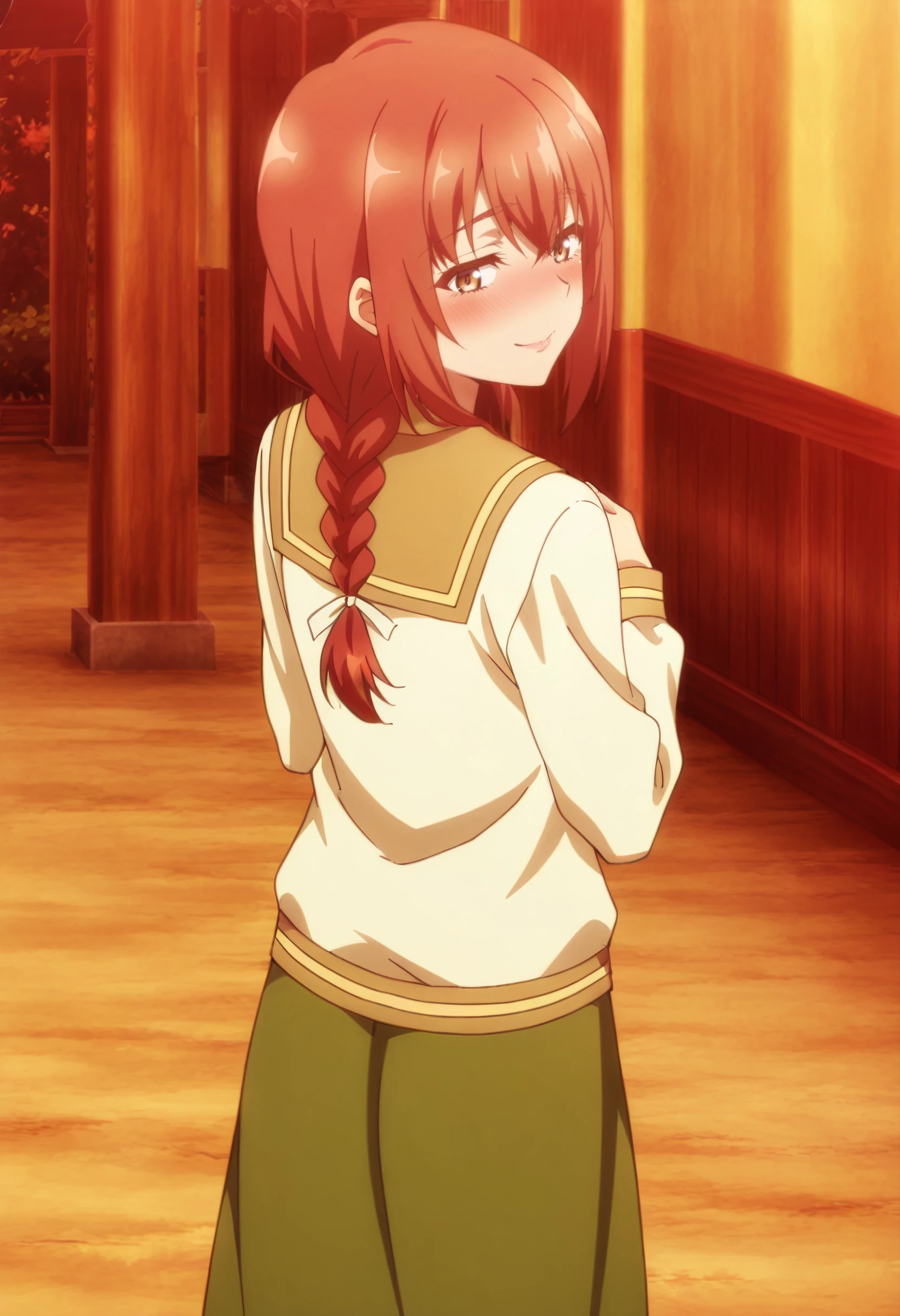 JHNMayMother, brown hair, red hair, braid, long hair, single braid, braided ponytail, hair over shoulder, brown eyes, hair between eyes,