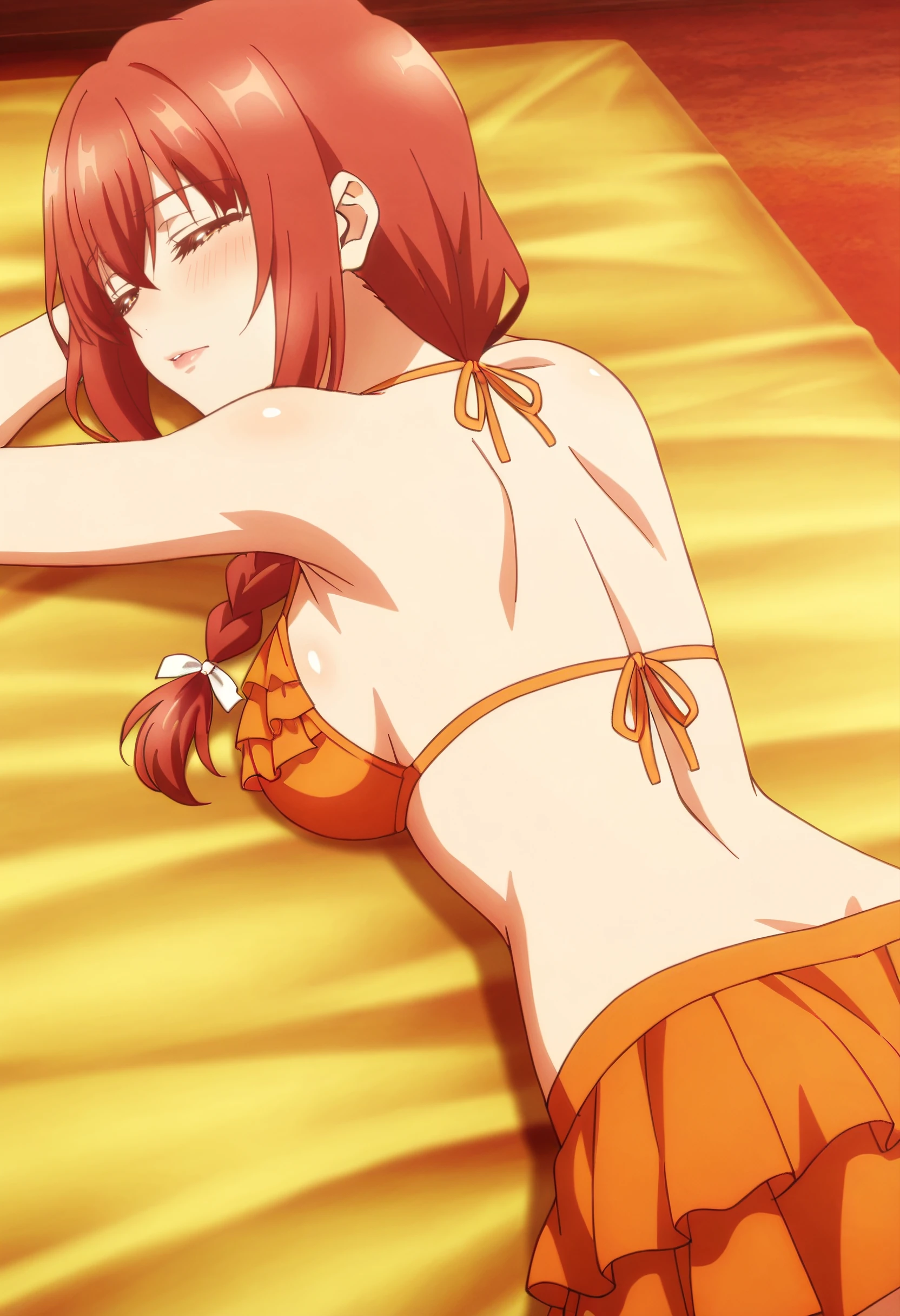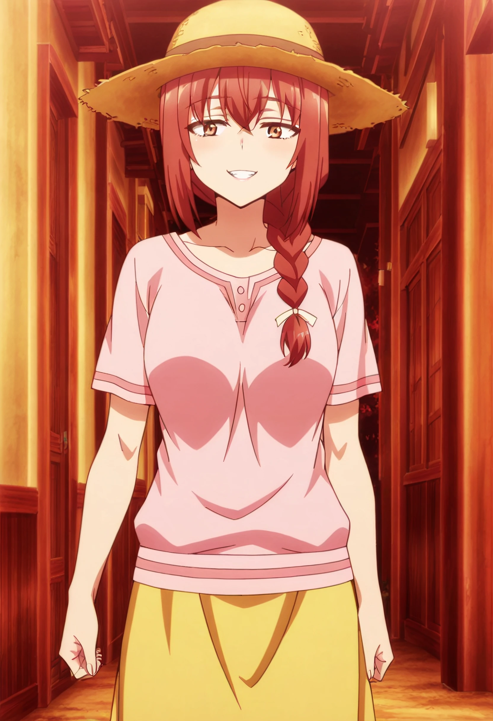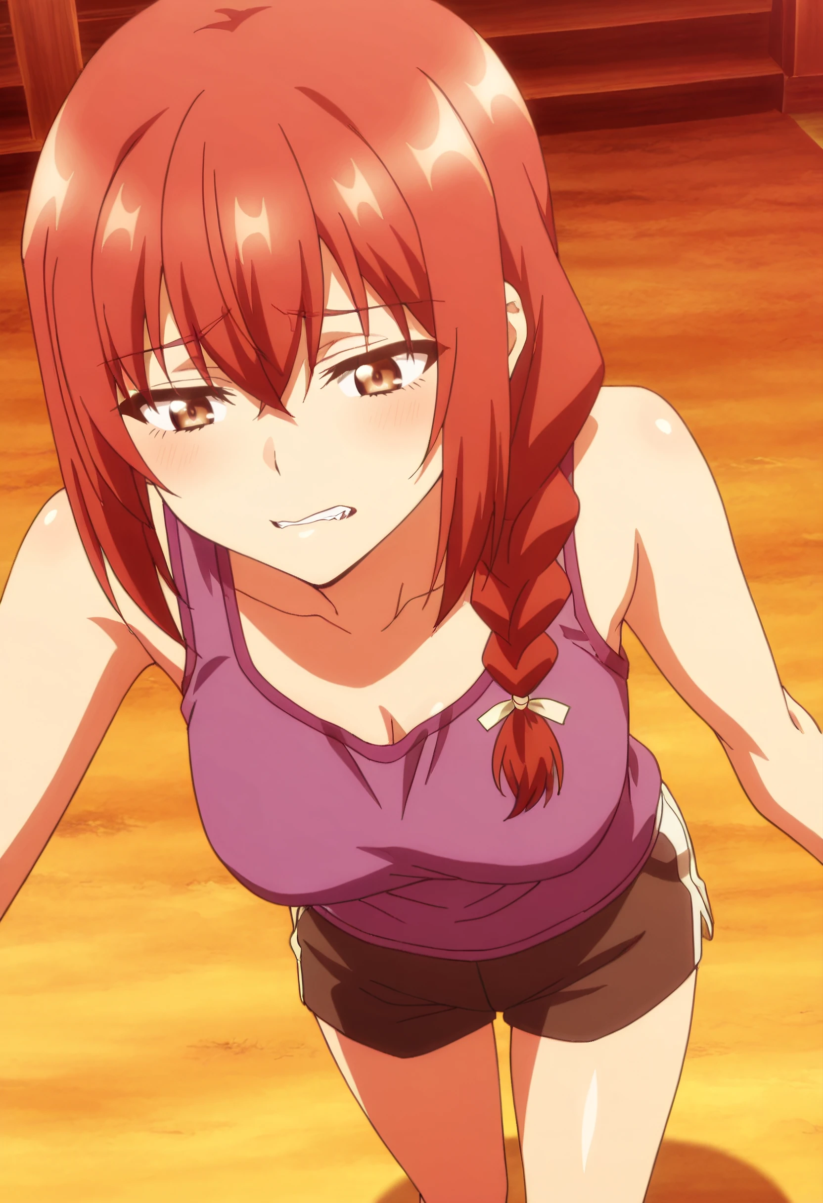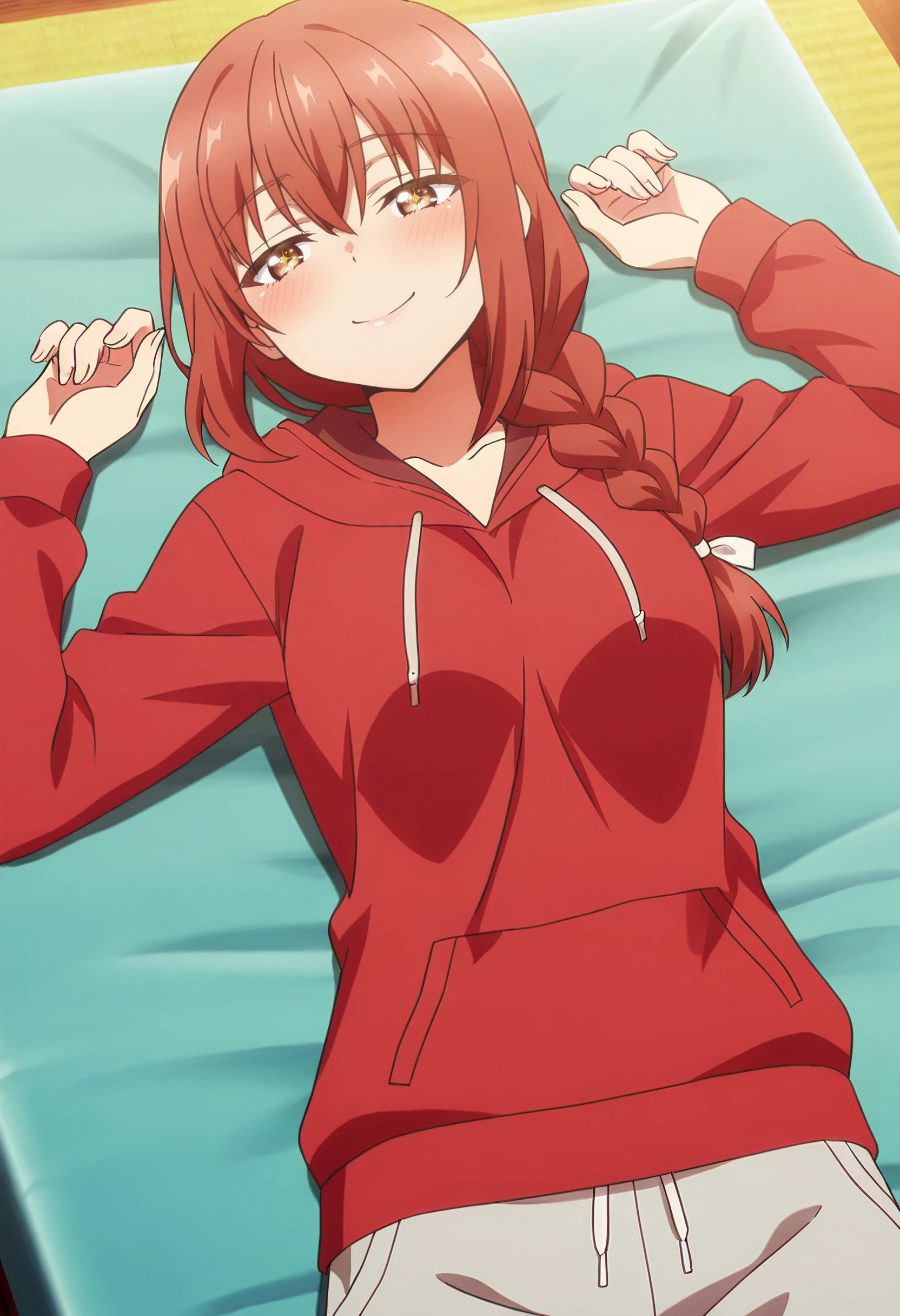 JHNMayMother, brown hair, red hair, braid, long hair, single braid, braided ponytail, hair over shoulder, brown eyes, hair between eyes,