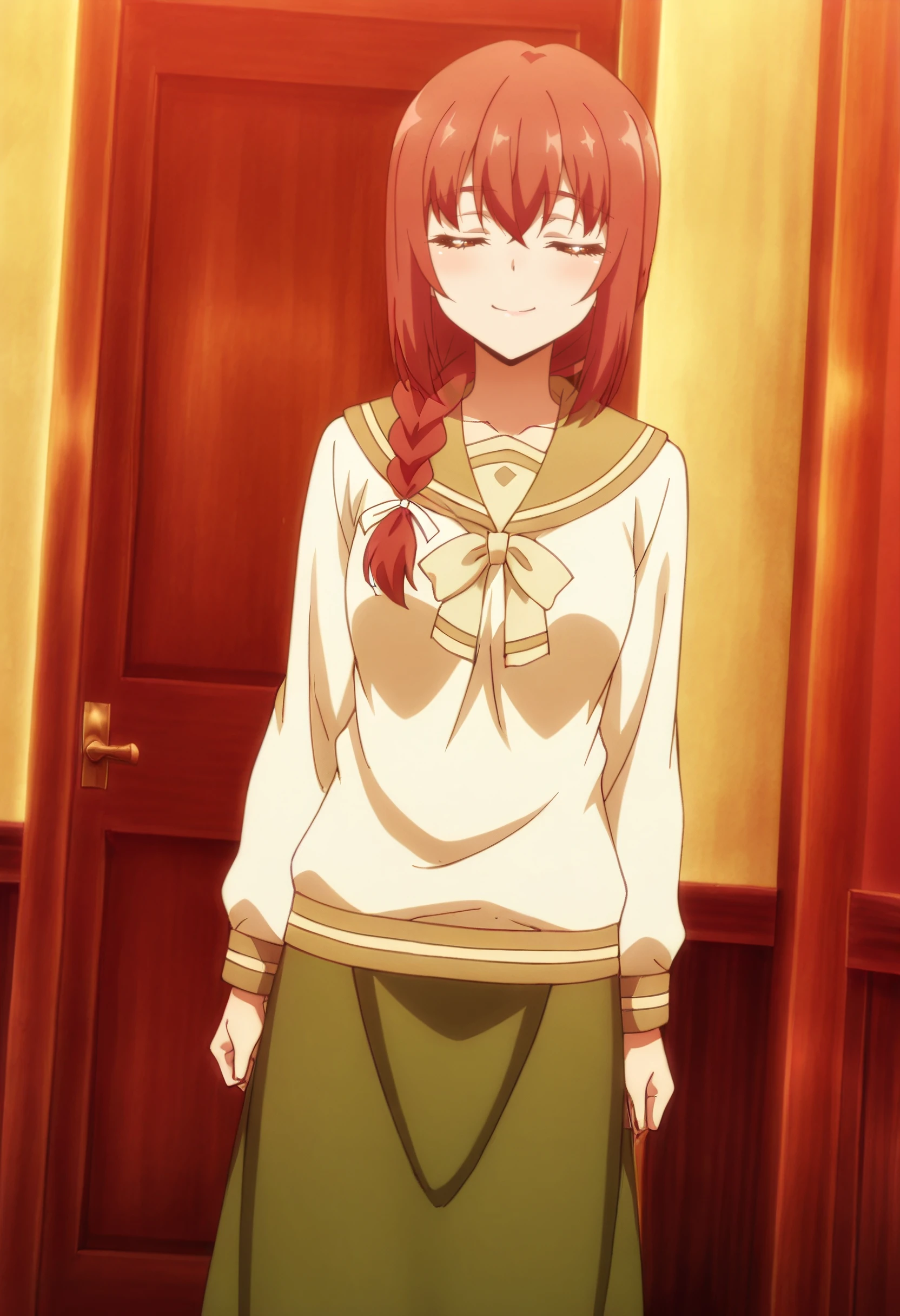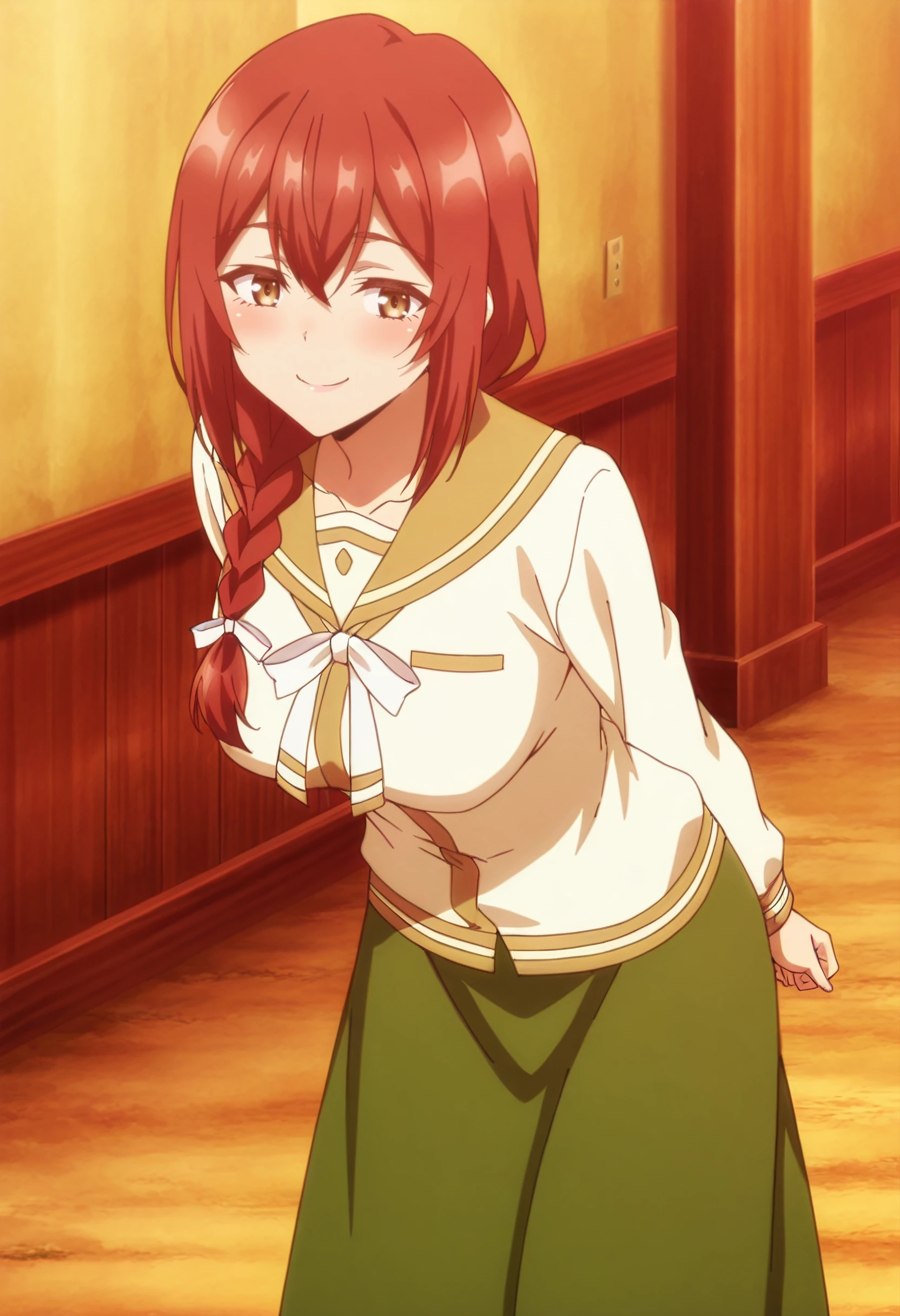 MayMOutfit, serafuku, white shirt, shirt, skirt, long skirt, long sleeves, green skirt, ribbon, hair ribbon, brown sailor collar, white ribbon, sailor collar,