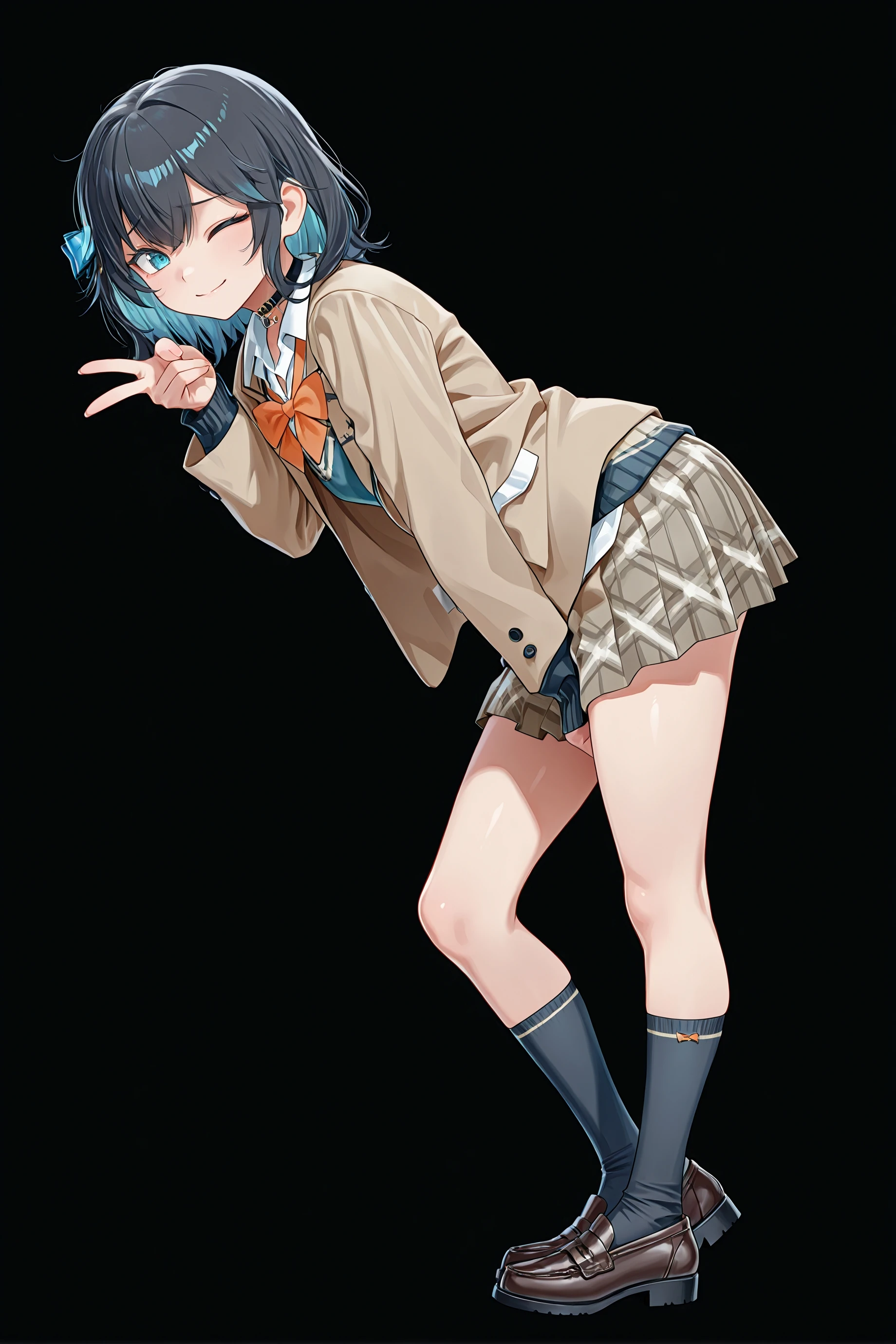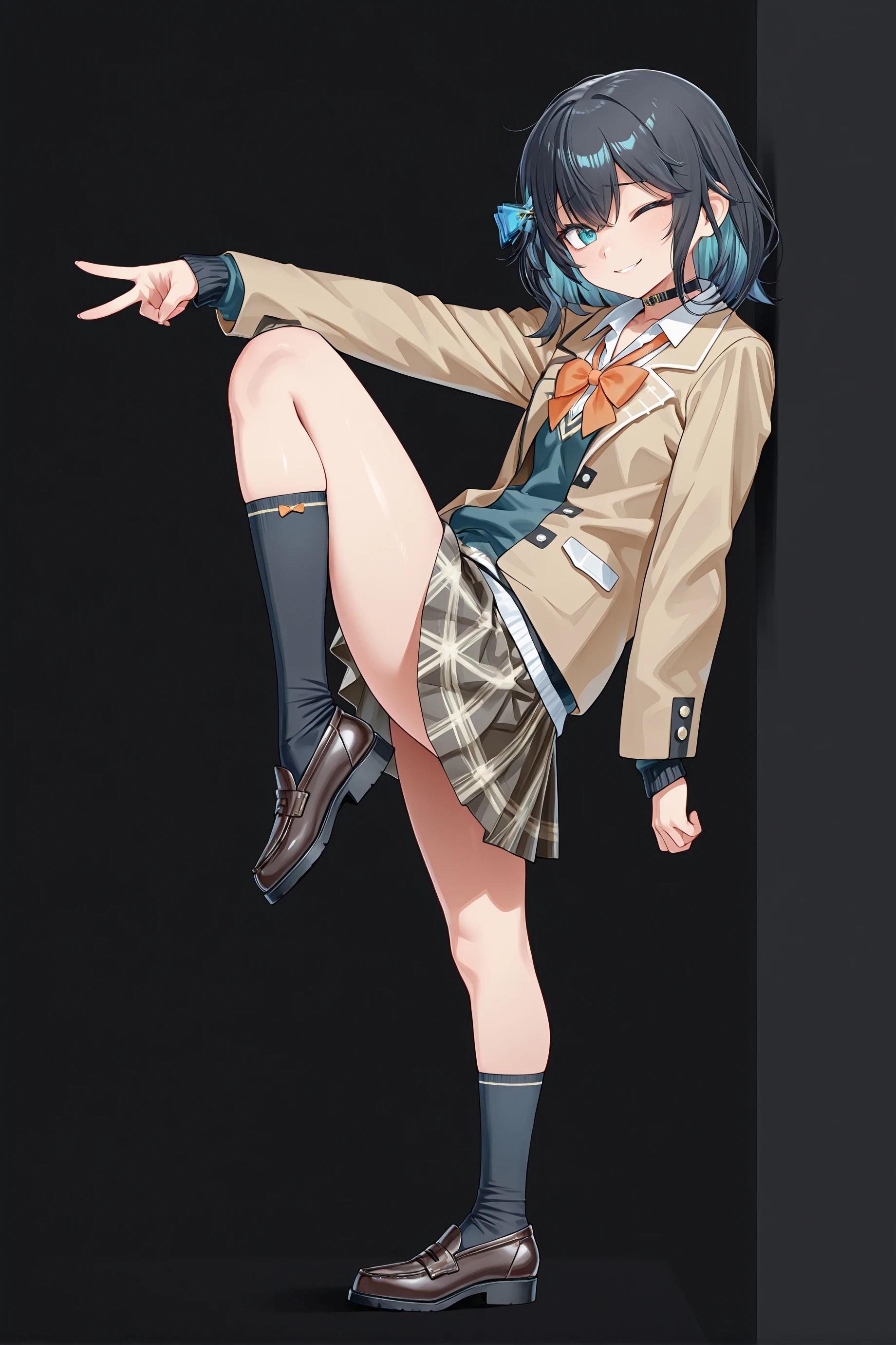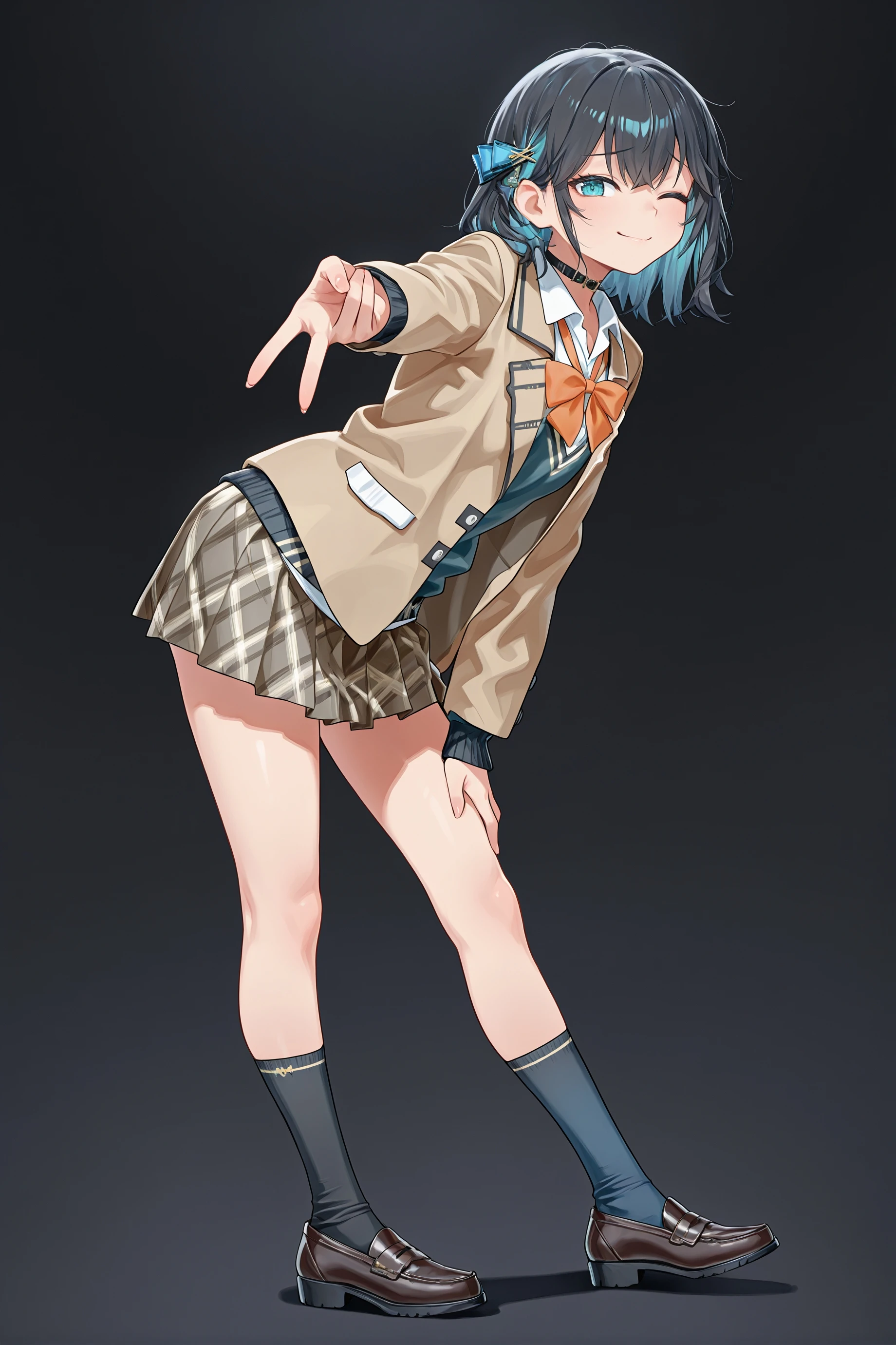 miyamai moca, brown jacket, skirt, choker, plaid skirt, orange bowtie, collared shirt, black socks, loafer,