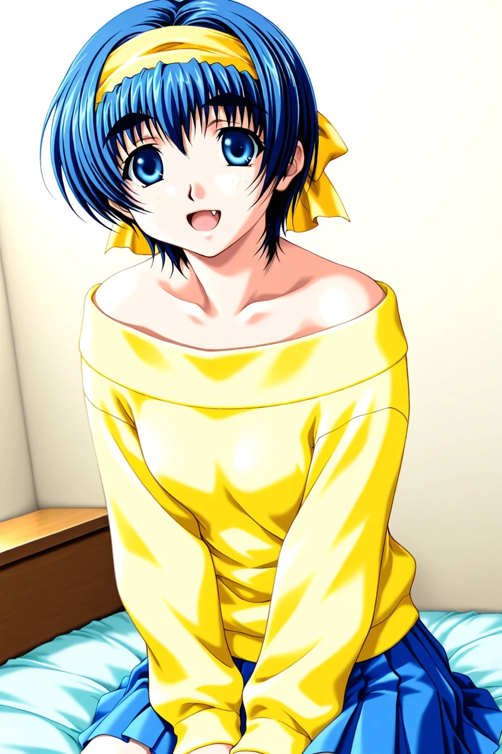 Yagami Shiina,Game Style,Early 2000s style,Blue hair,Short hair,yellow simple Headband,thick eyebrows,Blue eyes,Tareme,fang,