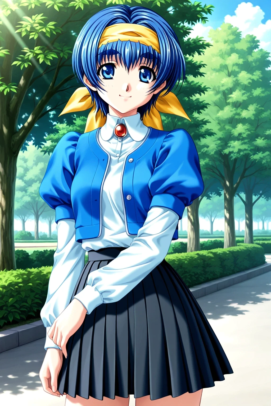 Blue puffed sleeves short-sleeved jacket,White Long sleeves blouse,black pleated skirt,