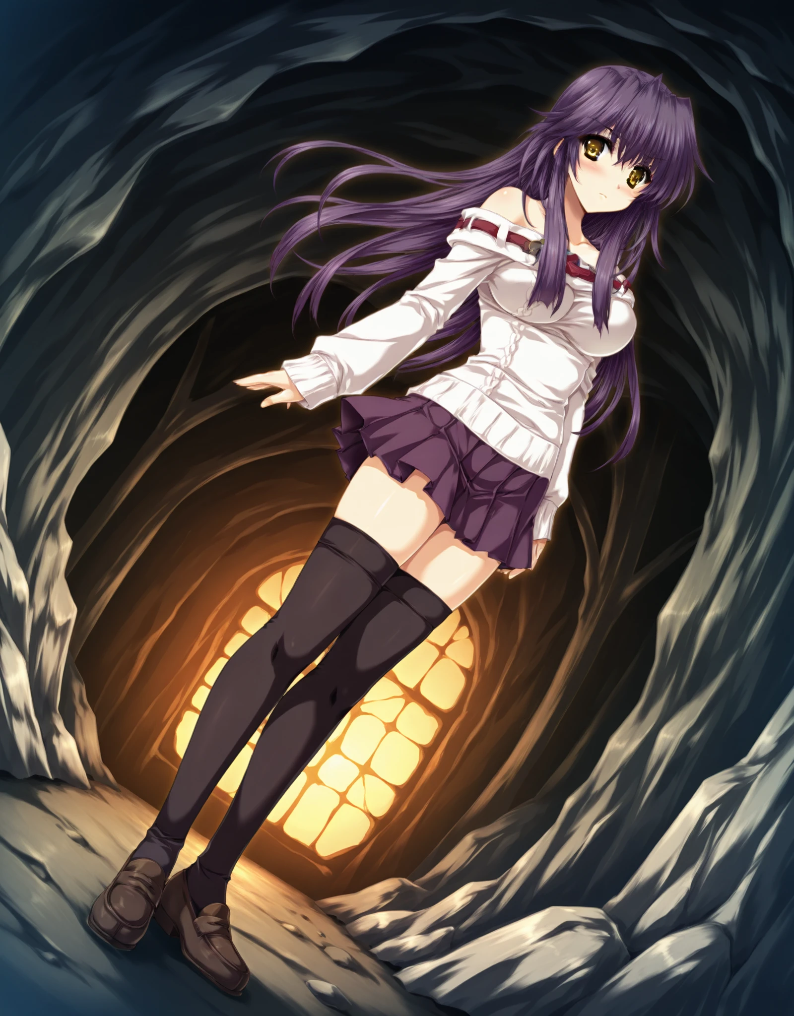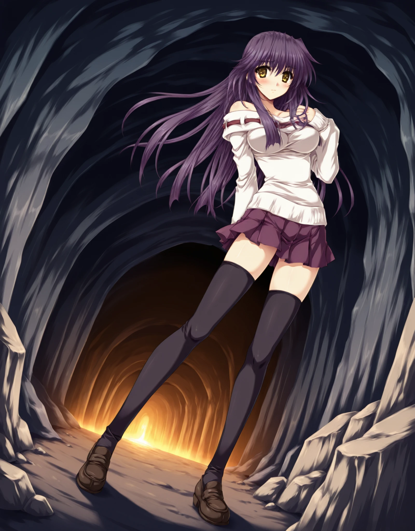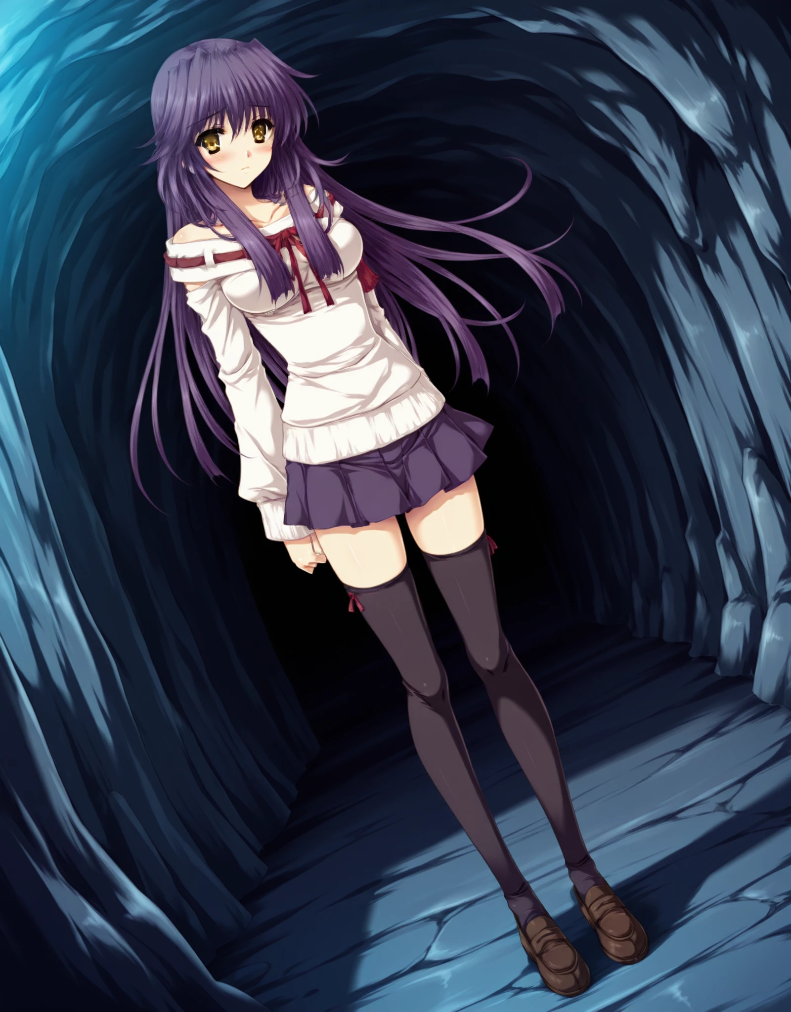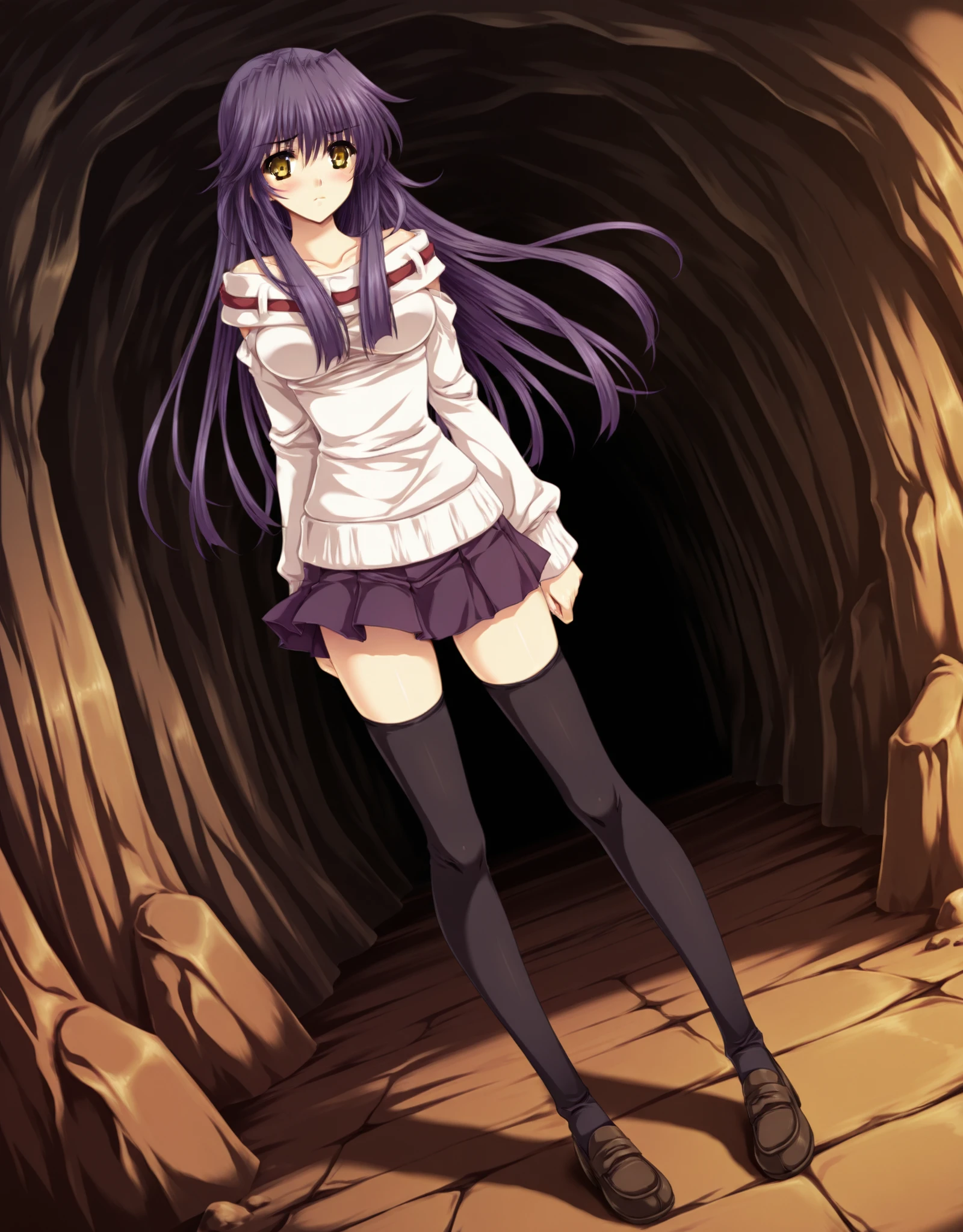 ClothesA: ,yae_d1,loafers,1girl,solo,thighhighs,long hair,skirt,purple hair,zettai ryouiki,(sweater:1.2),breasts,blush,(bare shoulders:1.3),black thighhighs,pleated skirt,dark blue skirt,white sweater,