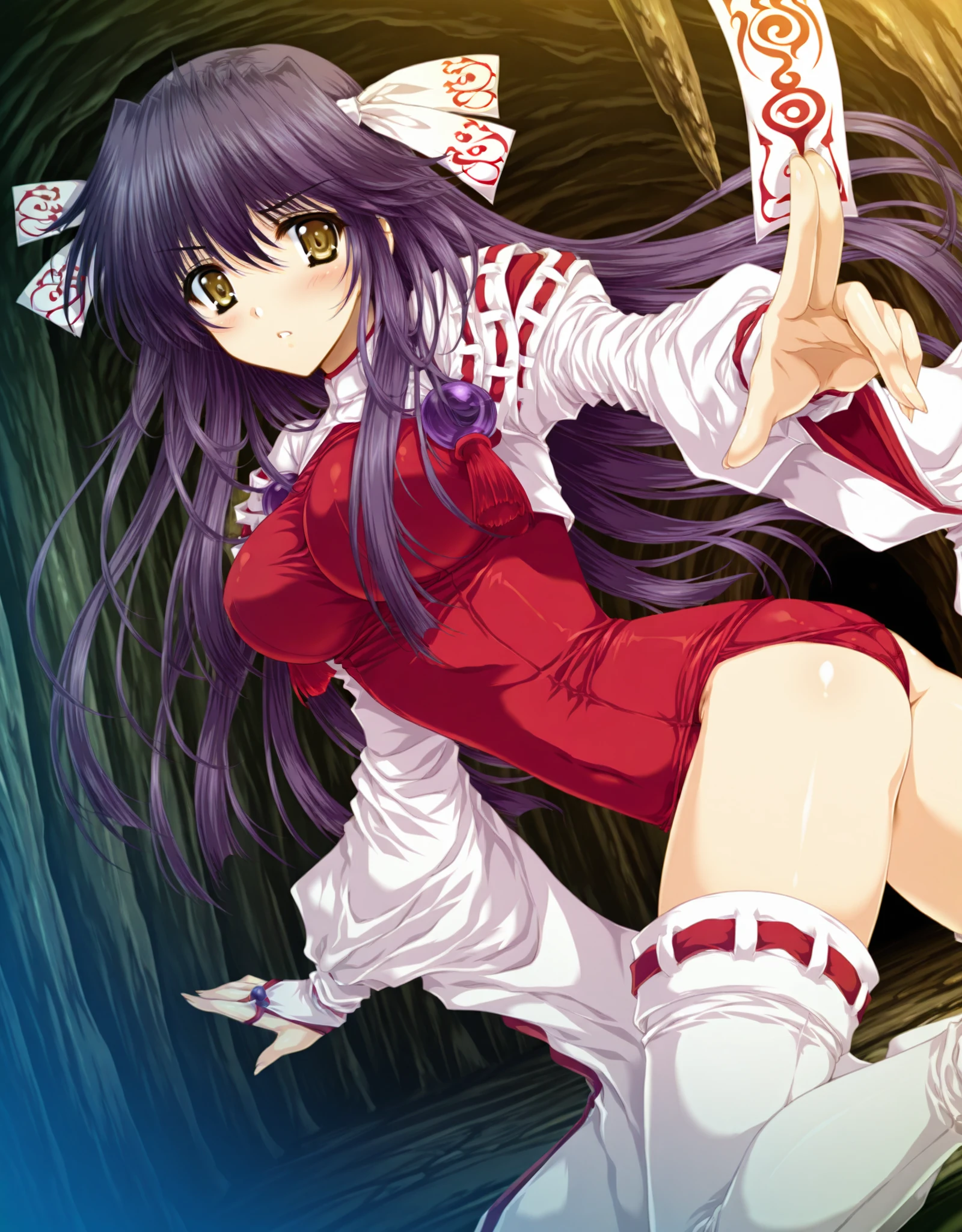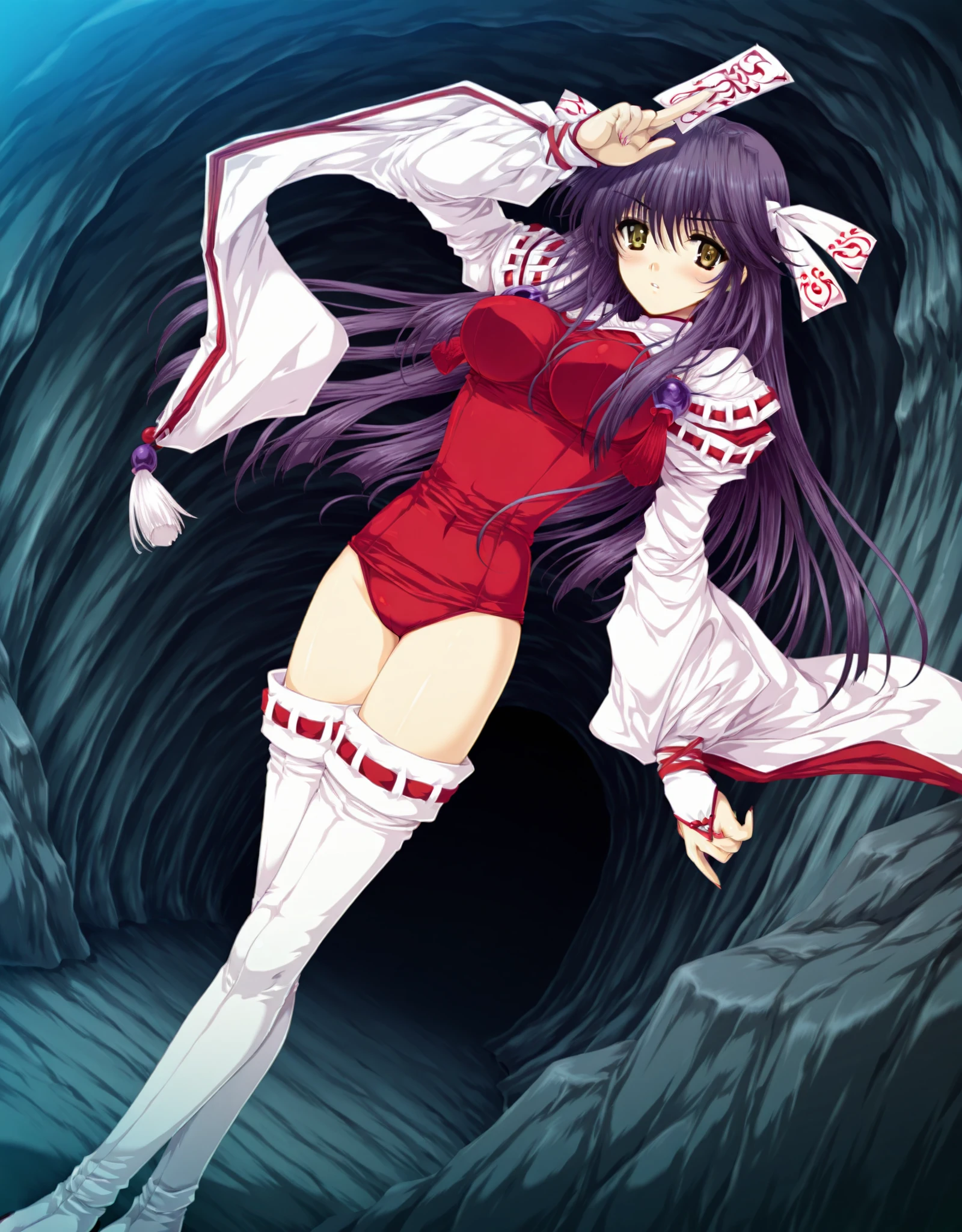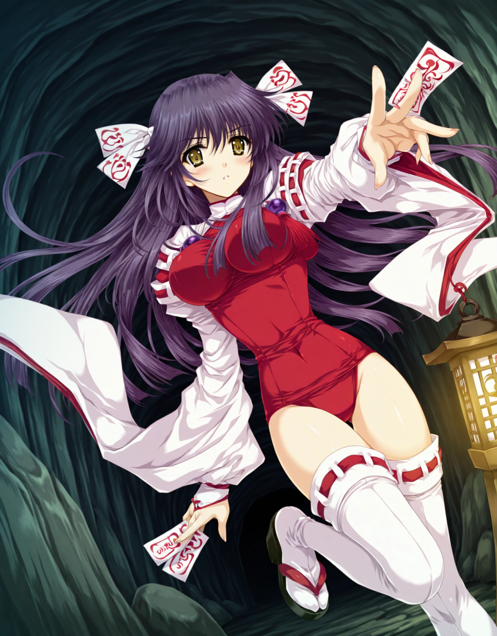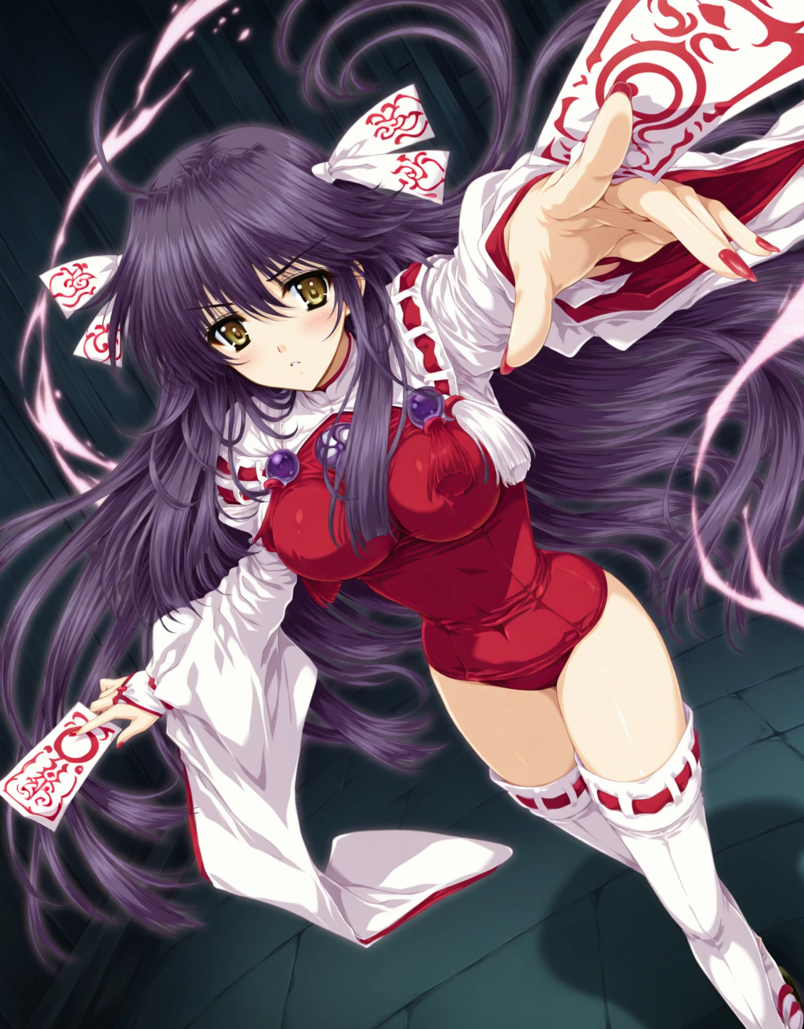 Miko: yae_miko,1girl,solo,1girl,thighhighs,breasts,solo,long hair,purple hair,leotard,white thighhighs,long sleeves,red one-piece swimsuit,ribbon,hair ribbon,bangs,wide sleeves,tabi,ribbon trim,ribbon-trimmed legwear,ribbon-trimmed sleeves,clothing_aside,