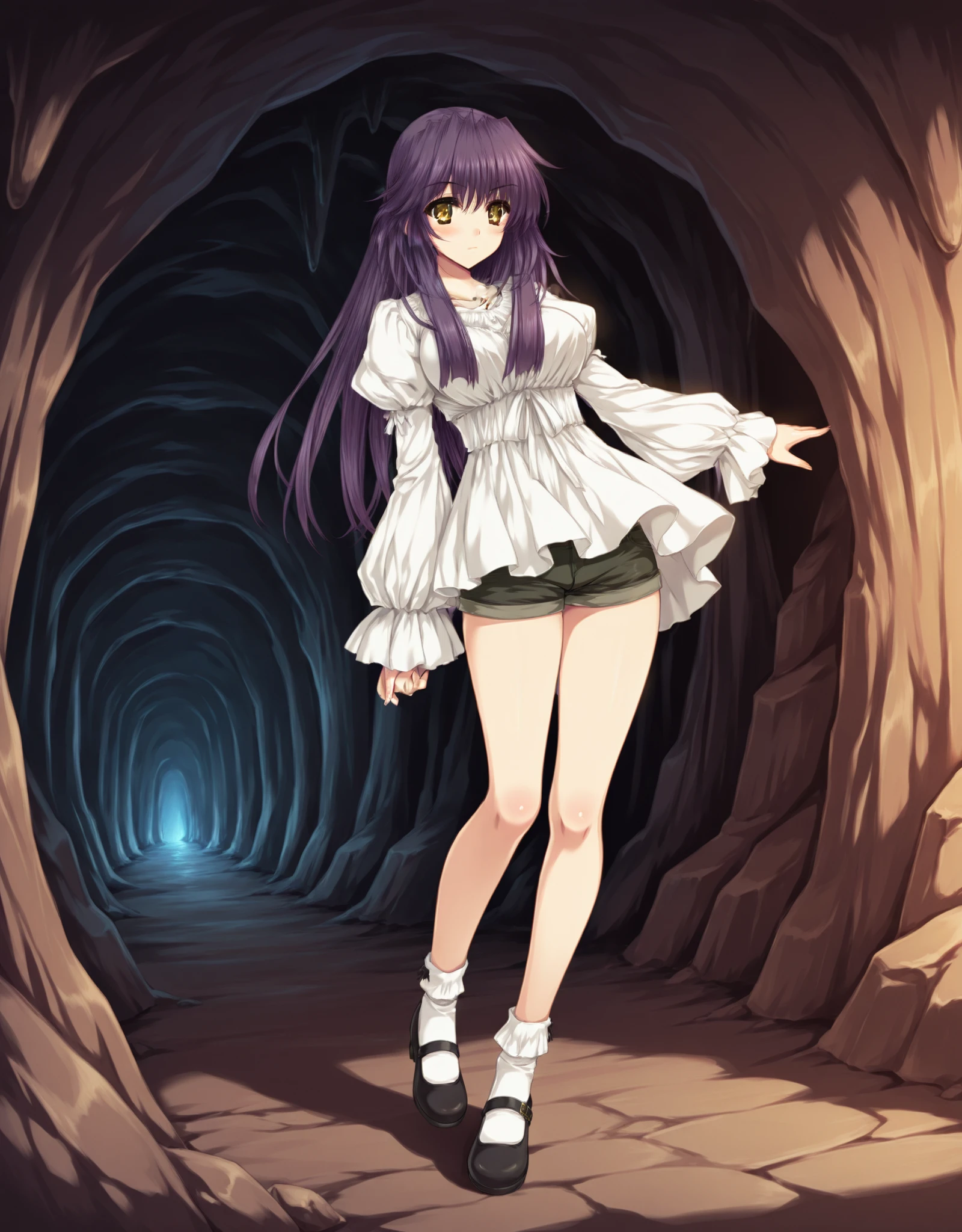 ClothesB: ,yae_d5,1girl,solo,purple hair,long hair,full body,yellow eyes,long sleeves,blush,puffy sleeves,(blouse:1.2),mary janes,short socks,puffy sleeves,casual,blouse,white dress,(brown shorts:1.1),wide sleeves,short shorts,green collar,