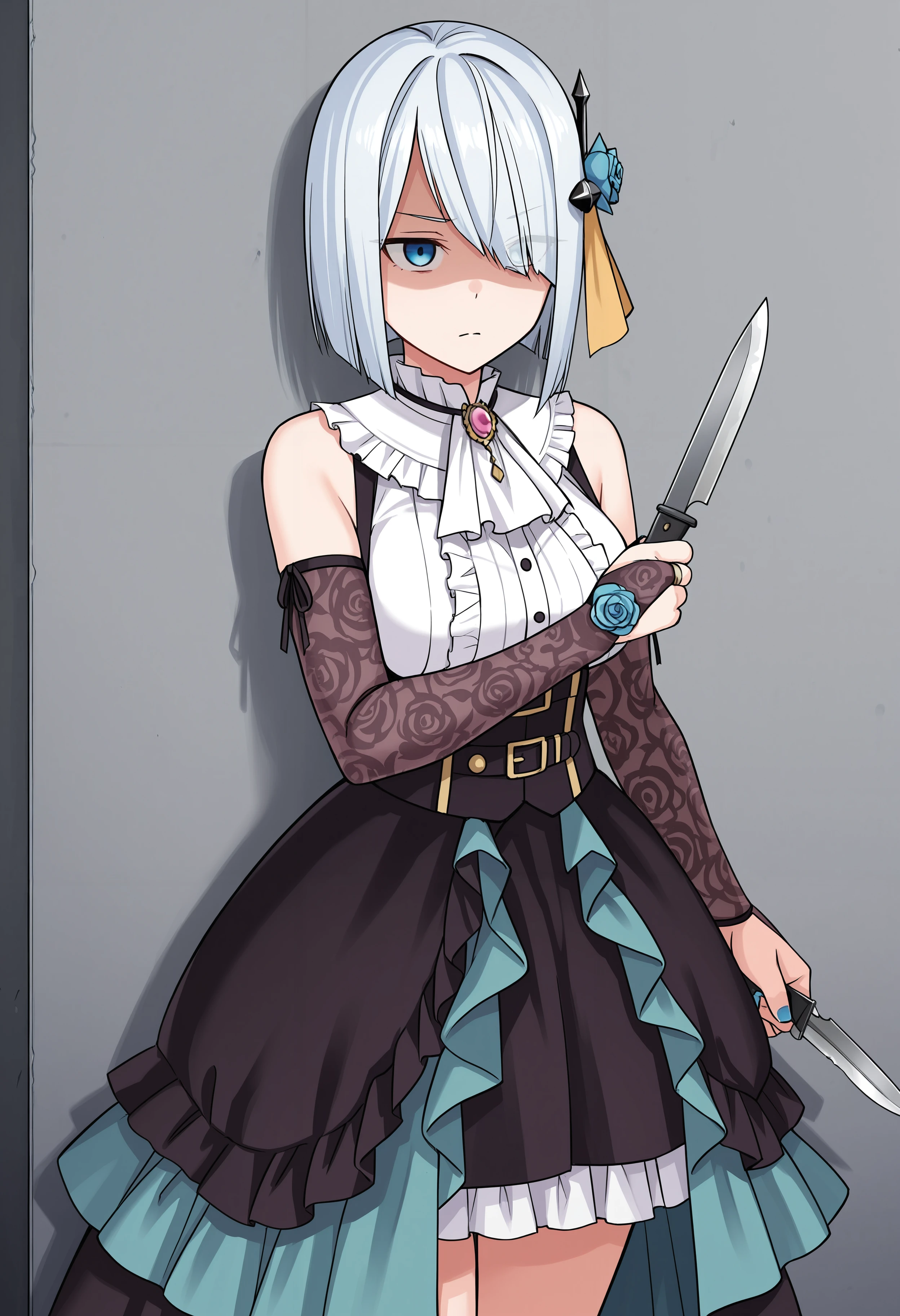 srphy_def, bridal gauntlets, frills, white ascot, blue rose, black skirt, blue nail polish,