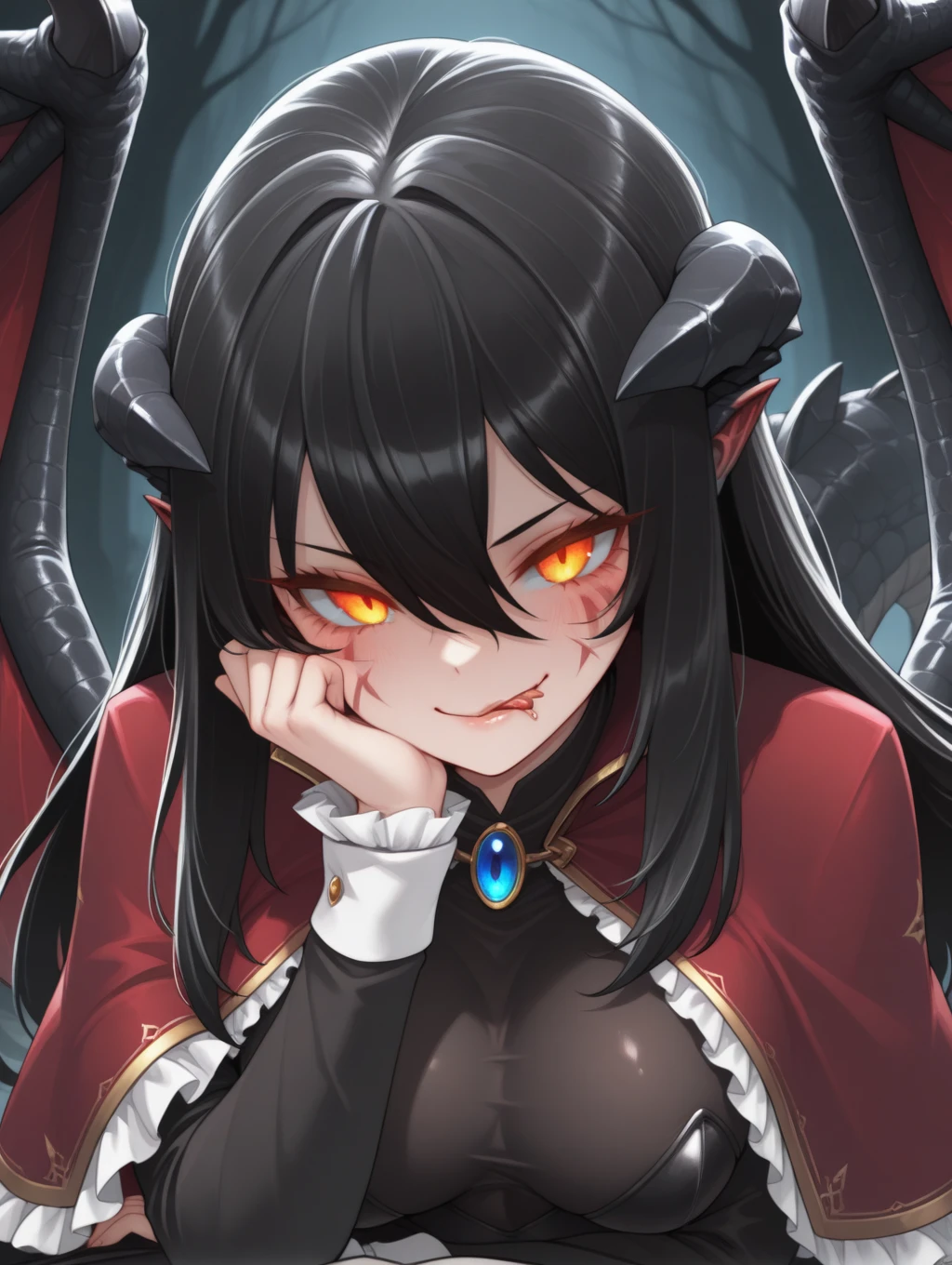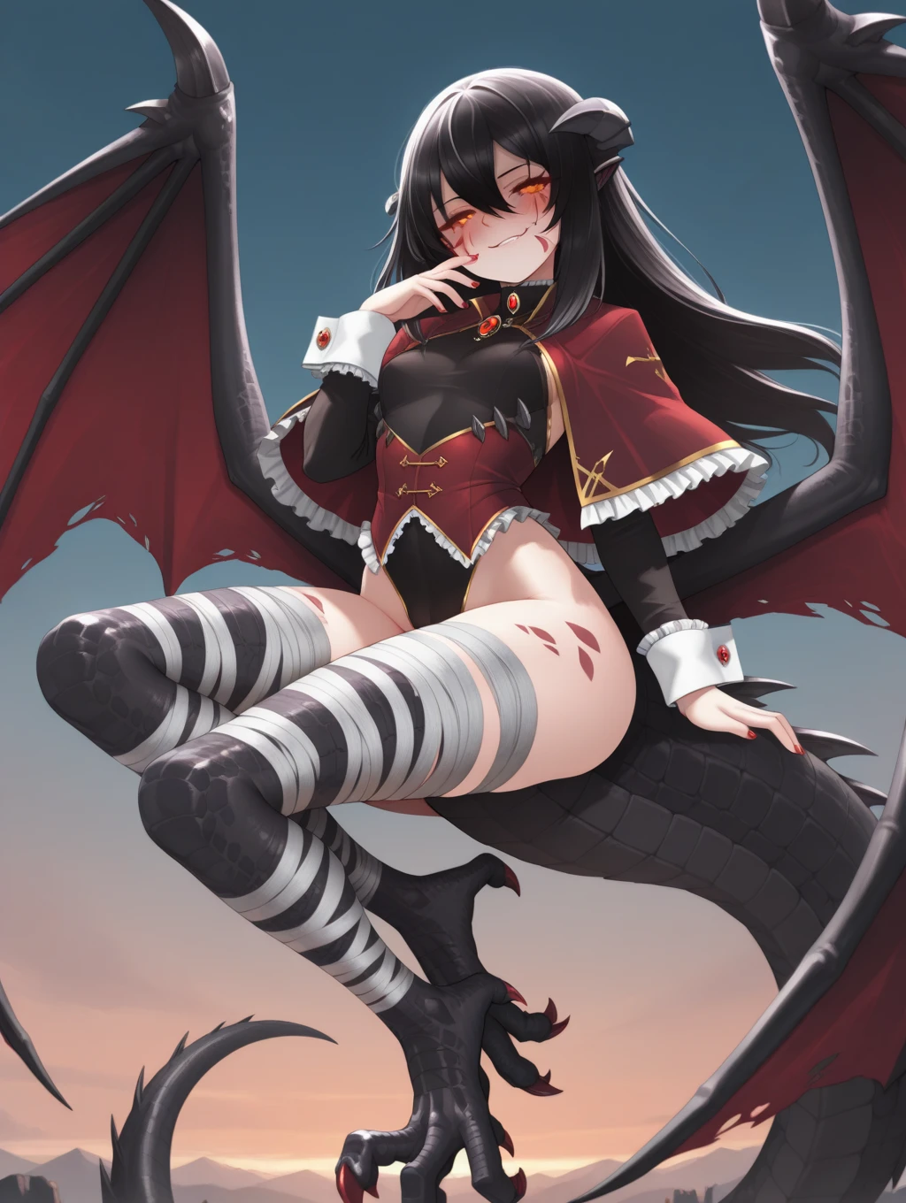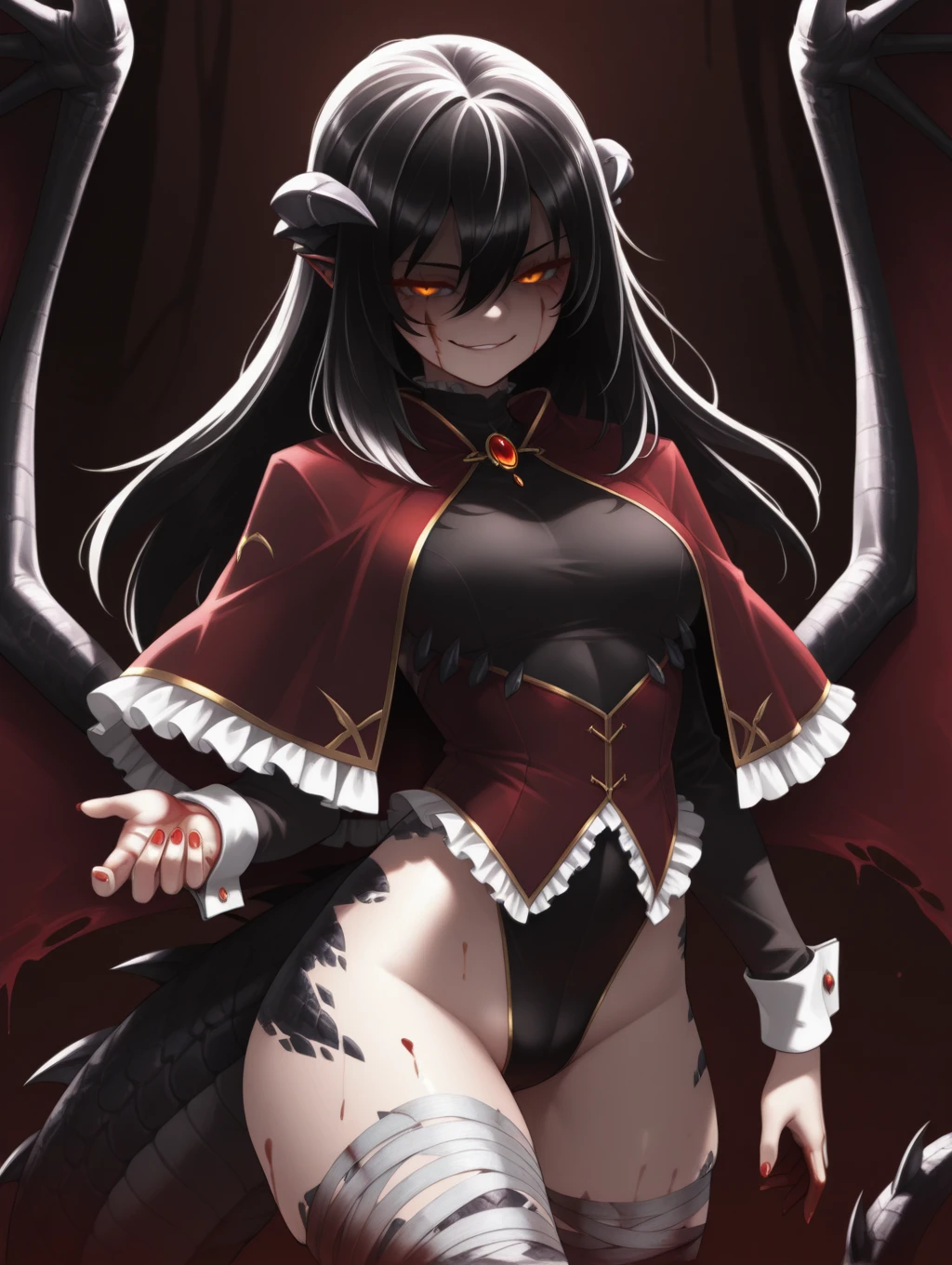 BlooDragon, black hair, long hair, hair between eyes, orange eyes, glowing eyes, facial marks, monster girl, dragon wings, dragon tail, talons, horns, bandaged leg, red nails, bandages, long sleeves, black leotard, frills, brooch, jewelry, nail polish, capelet, black sleeves, white cuffs,