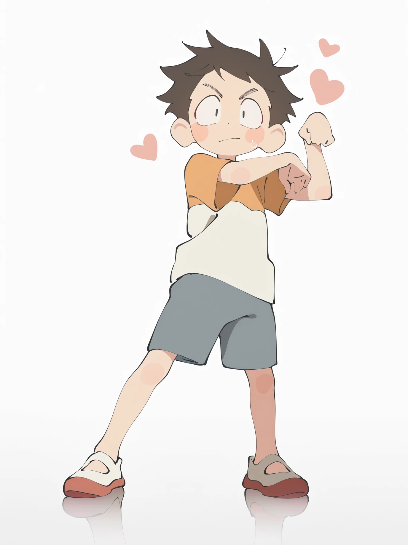 futa-elliott \(pokemon\), brown hair, black eyes, dot eyes, blush stickers, white orange shirt, grey shorts, blue uwabaki