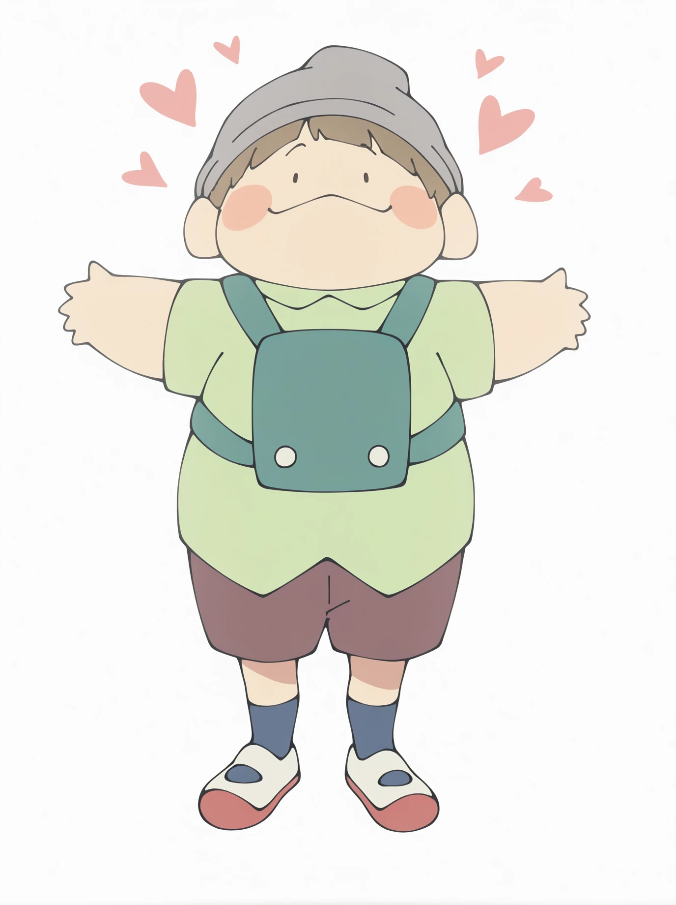 yoshi-ty \(pokemon\), brown hair, beanie, blush stickers, gray shorts, green shirt, socks, blue uwabaki, bag, fat man, fan, dot eyes