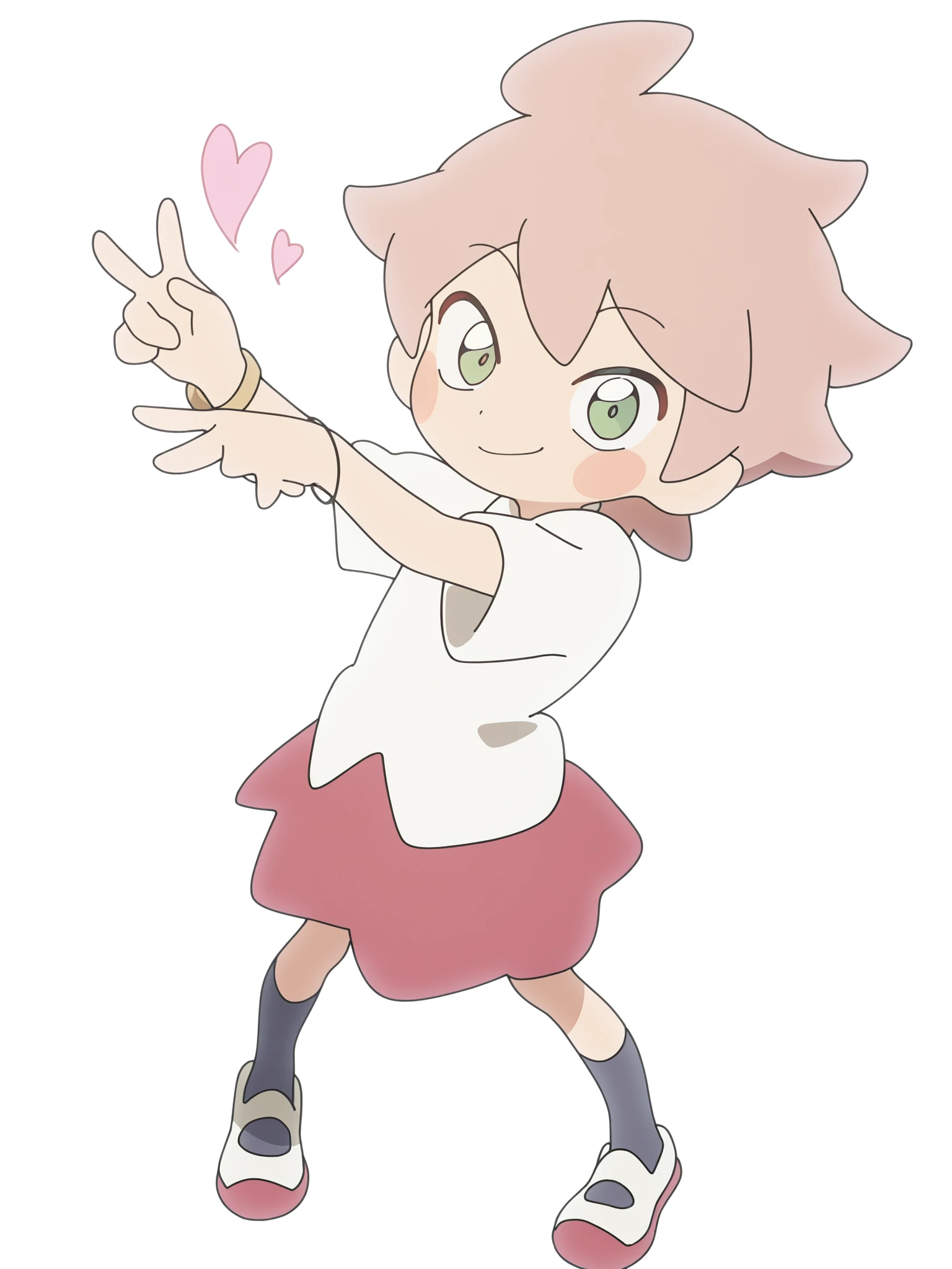 nono-kaori \(pokemon\), pink hair, short hair, white shirt, red skirt, green eyes, red uwabaki, blush stickers, gray socks, short sleeves, gold wristband