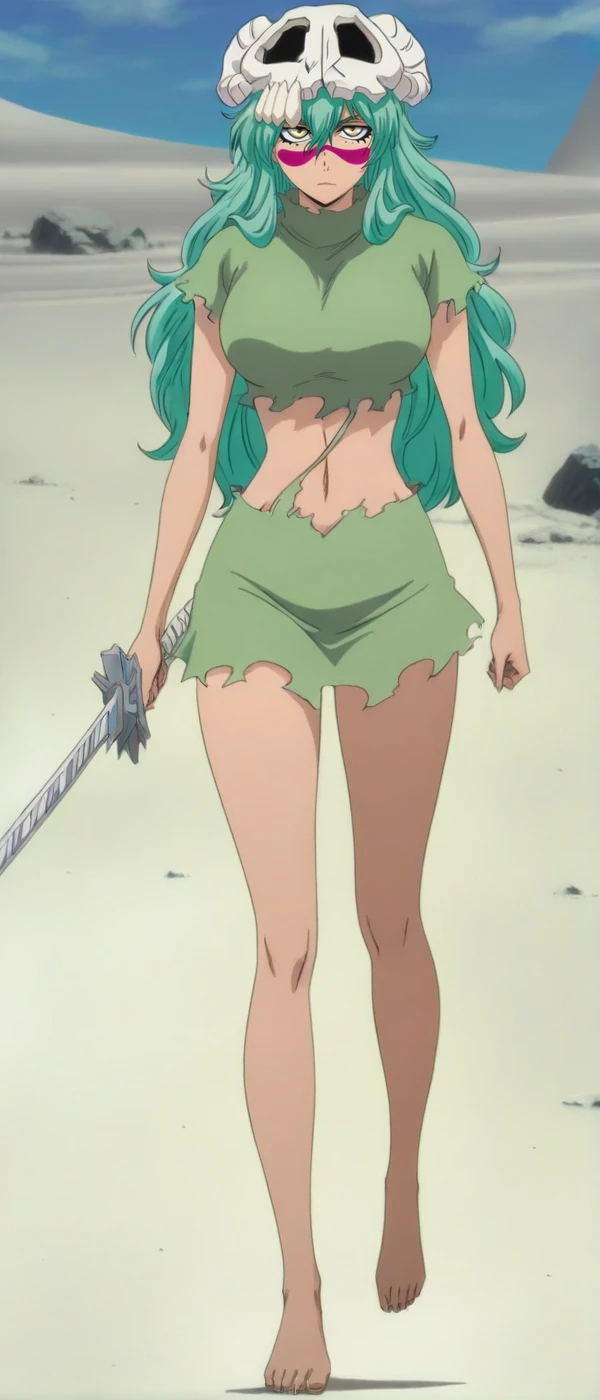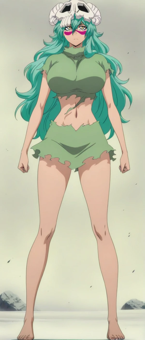 anime coloring, shirt, skirt, torn clothes, navel, midriff, skull,