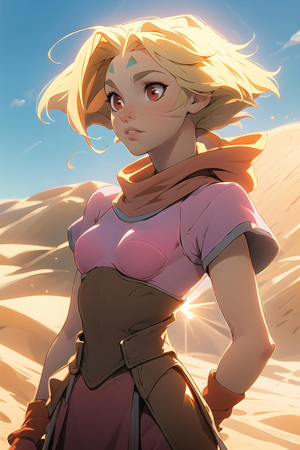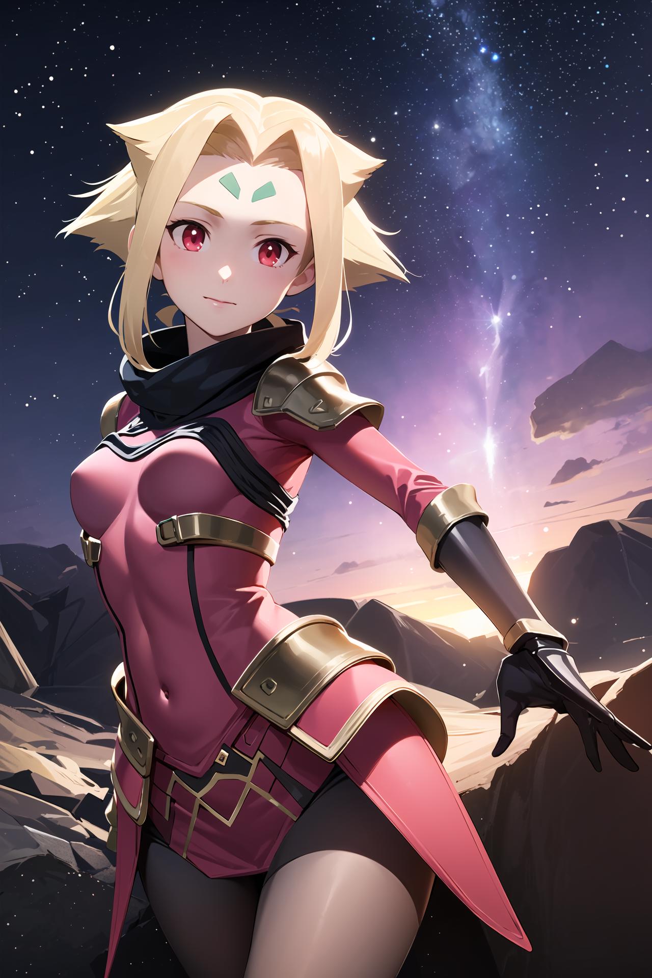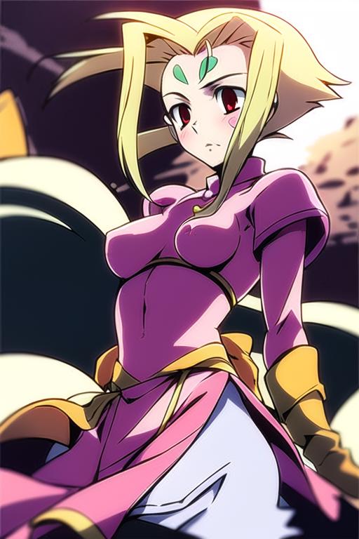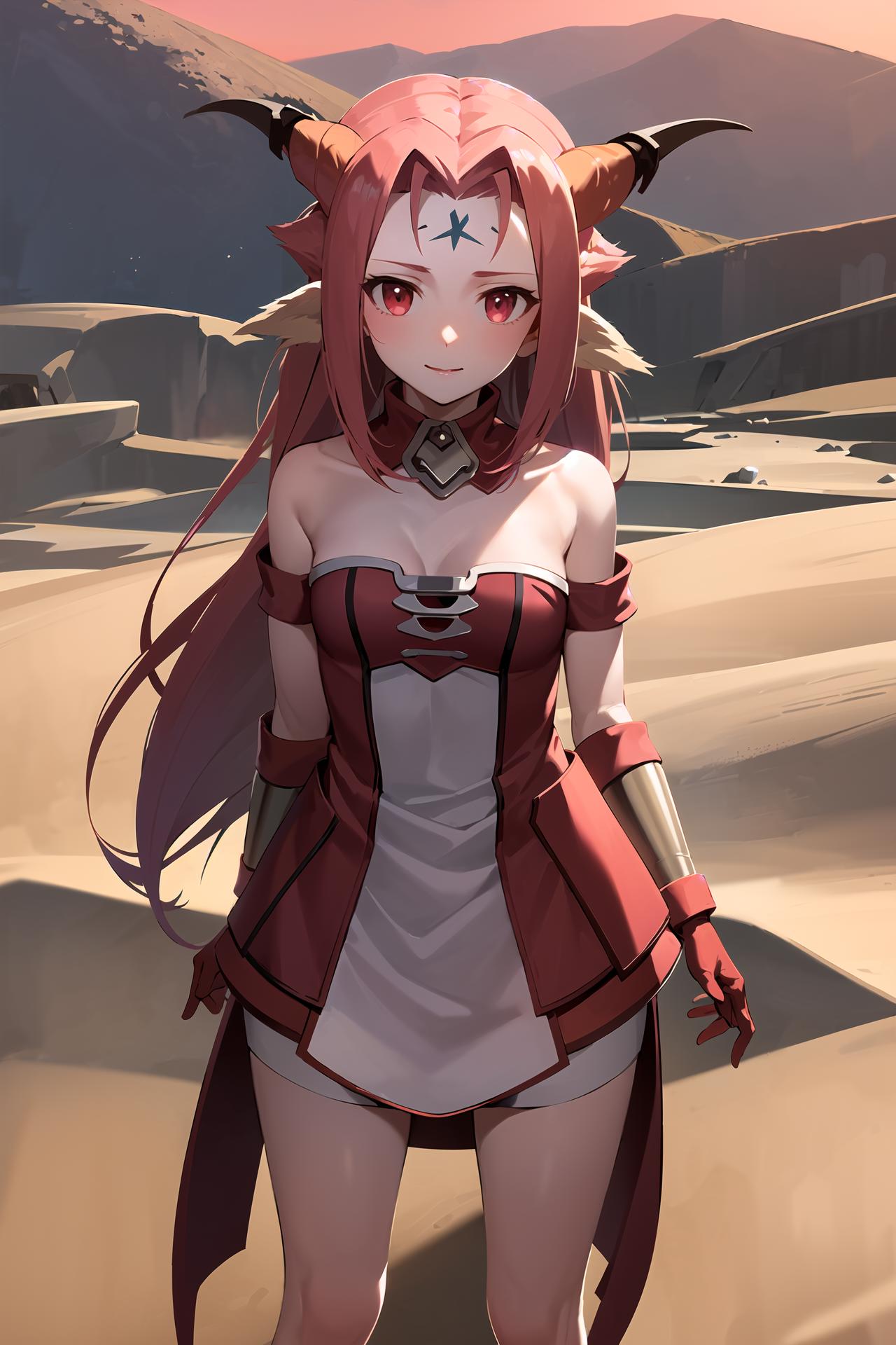 long blonde hair, red eyes, pink dress, forehead mark