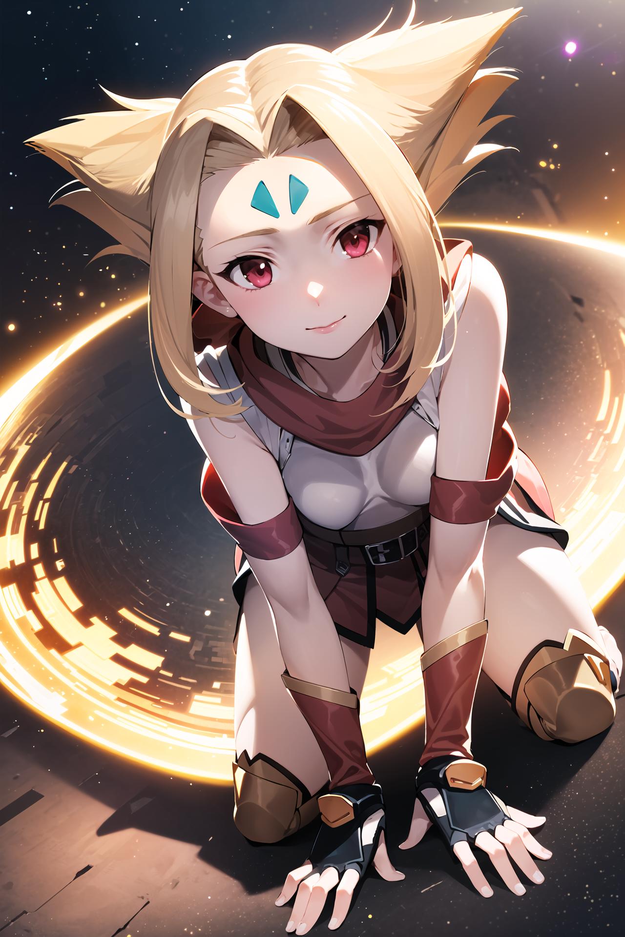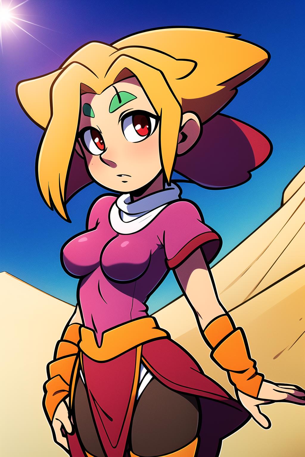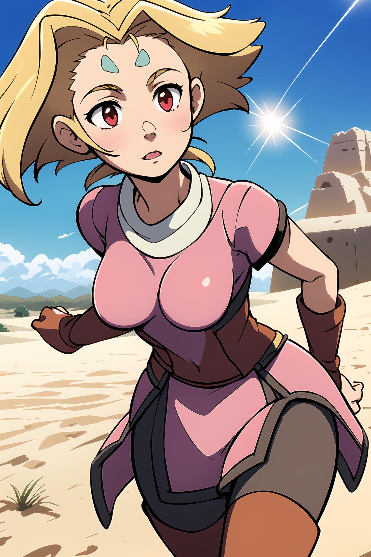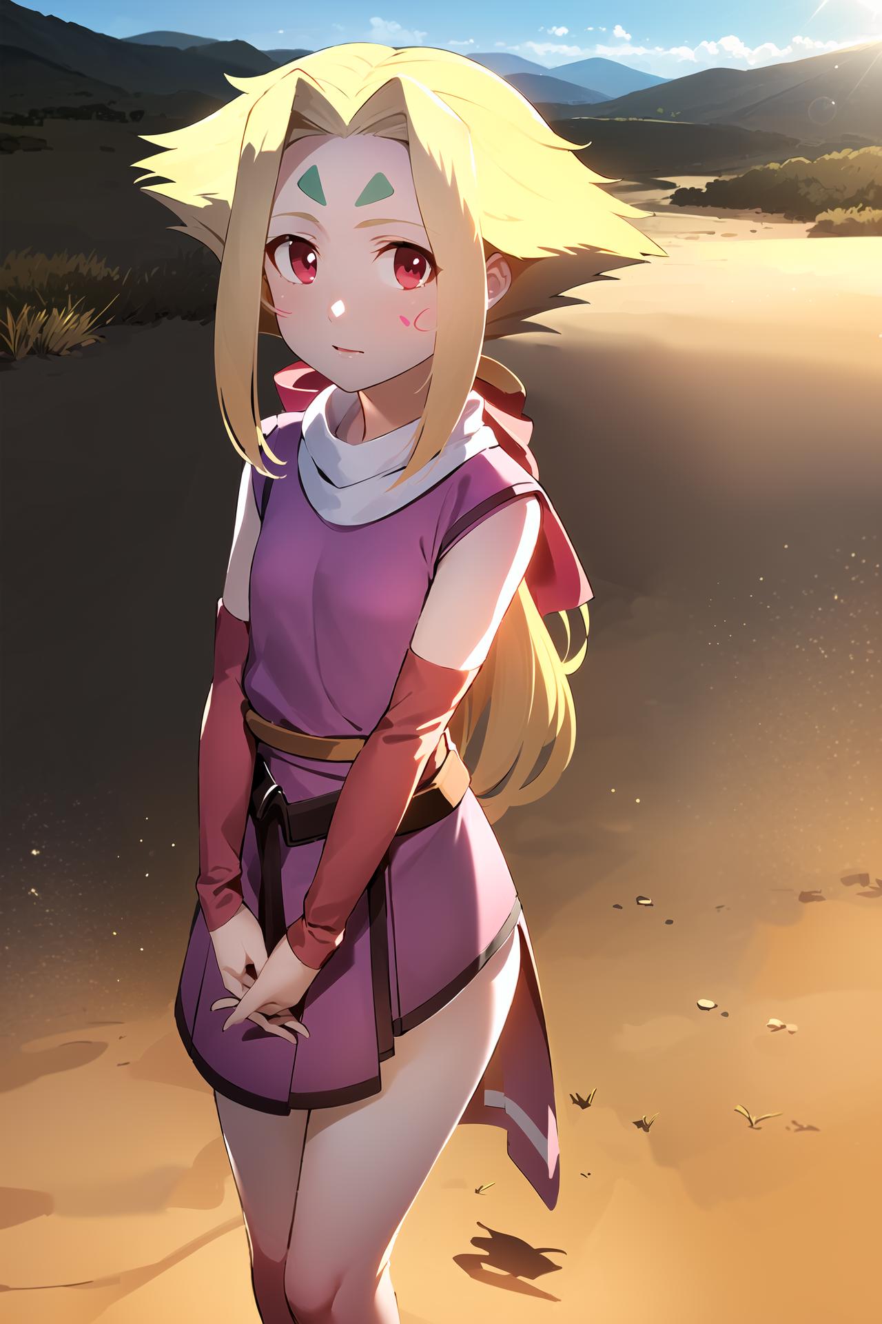 long blonde hair, red eyes, pink dress, forehead mark