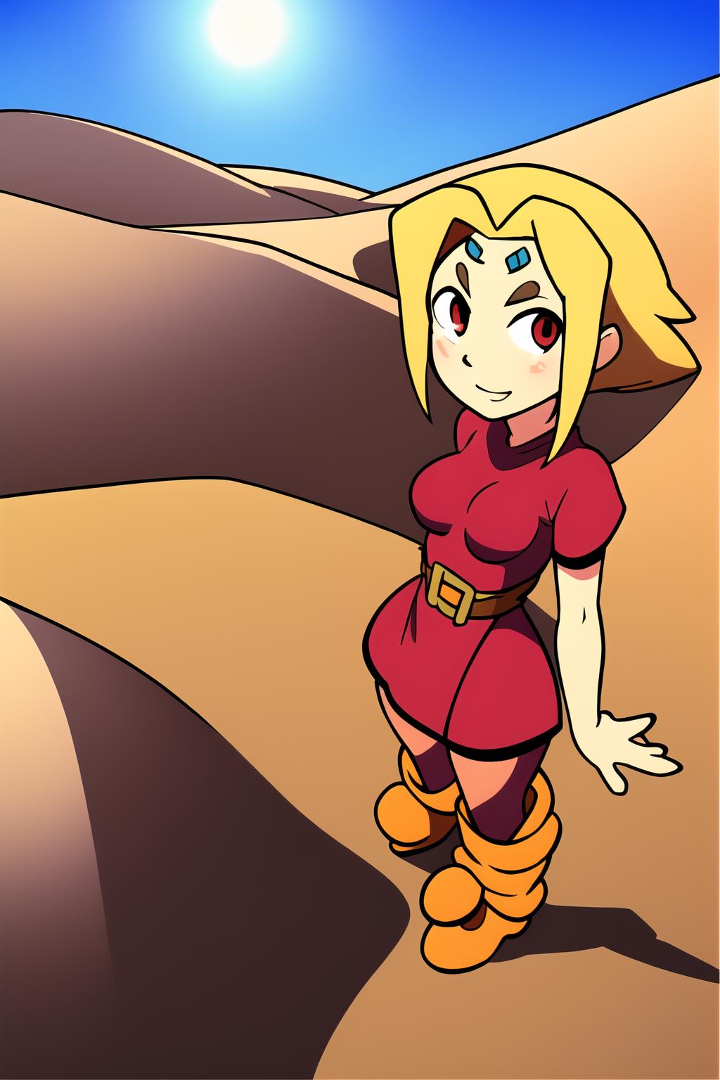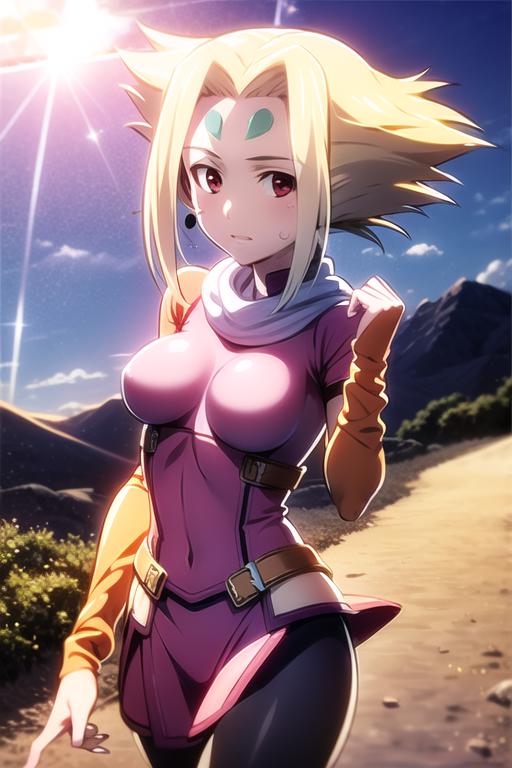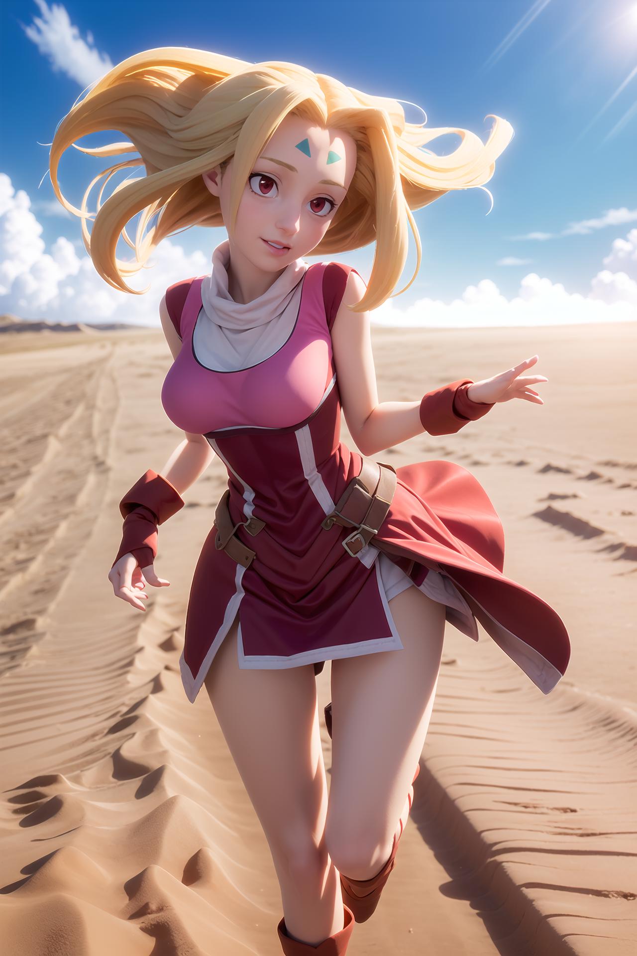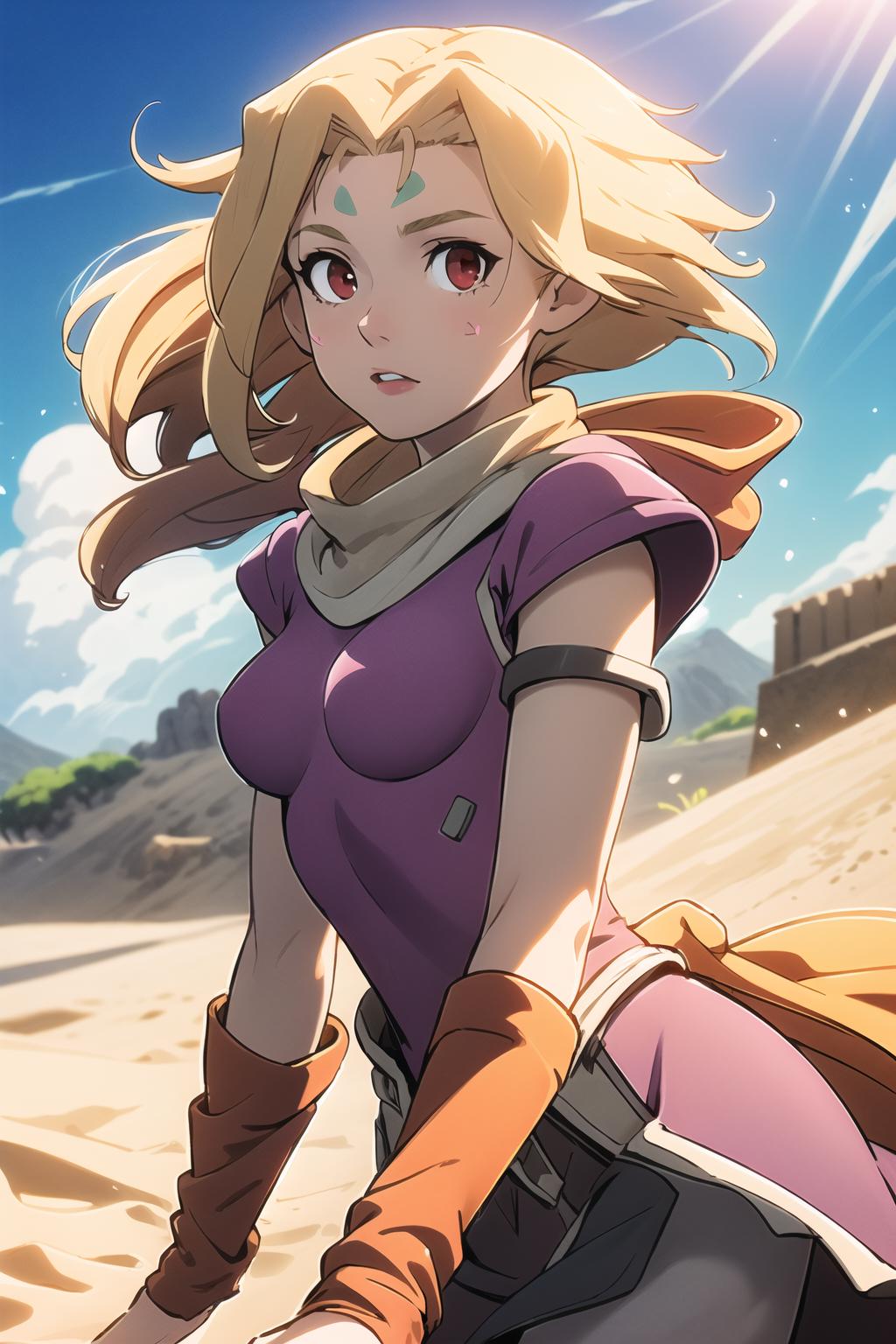 long blonde hair, red eyes, pink dress, forehead mark