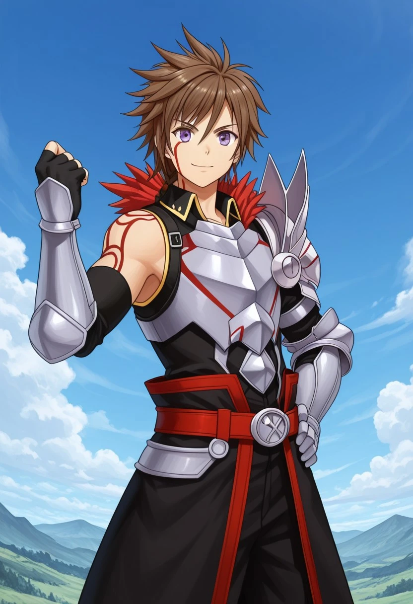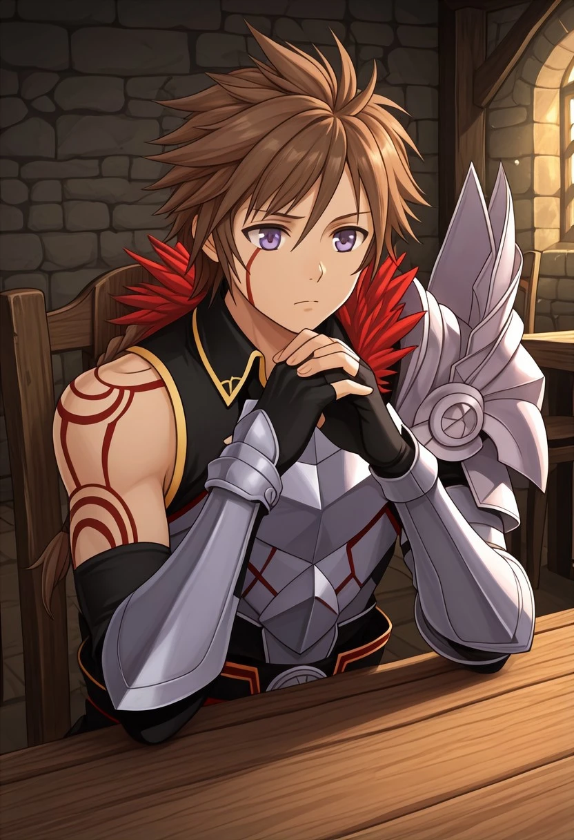 Yohei Arthur, brown hair, long tied braided ponytail, purple eyes, red face to arm tattoo, black sleeveless collared shirt, yellow accents, red fur trim, silver torso armor, red accents, single silver pauldron, black fingerless elbow gloves, silver vambraces, long black hip kilt, red belt with silver buckle, black pants, silver knee armor, red and black boots