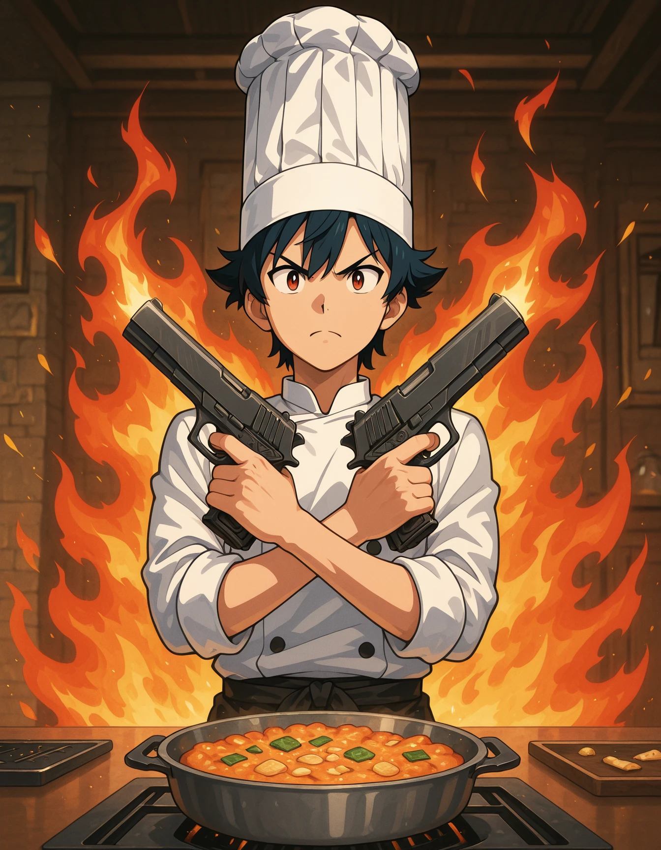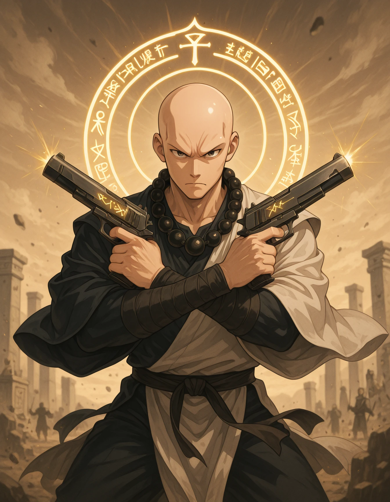 "Flatline, Flat vector illustration,,masterpiece, best quality, good quality, very aesthetic, absurdres, newest, 8K, depth of field, focused subject, dynamic angle, A stoic, peaceful anime monk — bald head, prayer beads — suddenly in a battle stance, crossing sacred relic pistols in an X pose. Glowing runes swirl as the air distorts with suppressed power. Background: ancient temple shattered by spiritual force. x pistol pose "