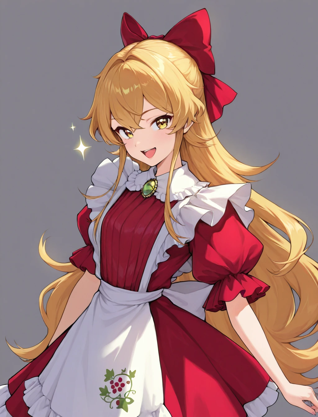 hair bow, red dress, brooch, apron, white socks, red shoes
