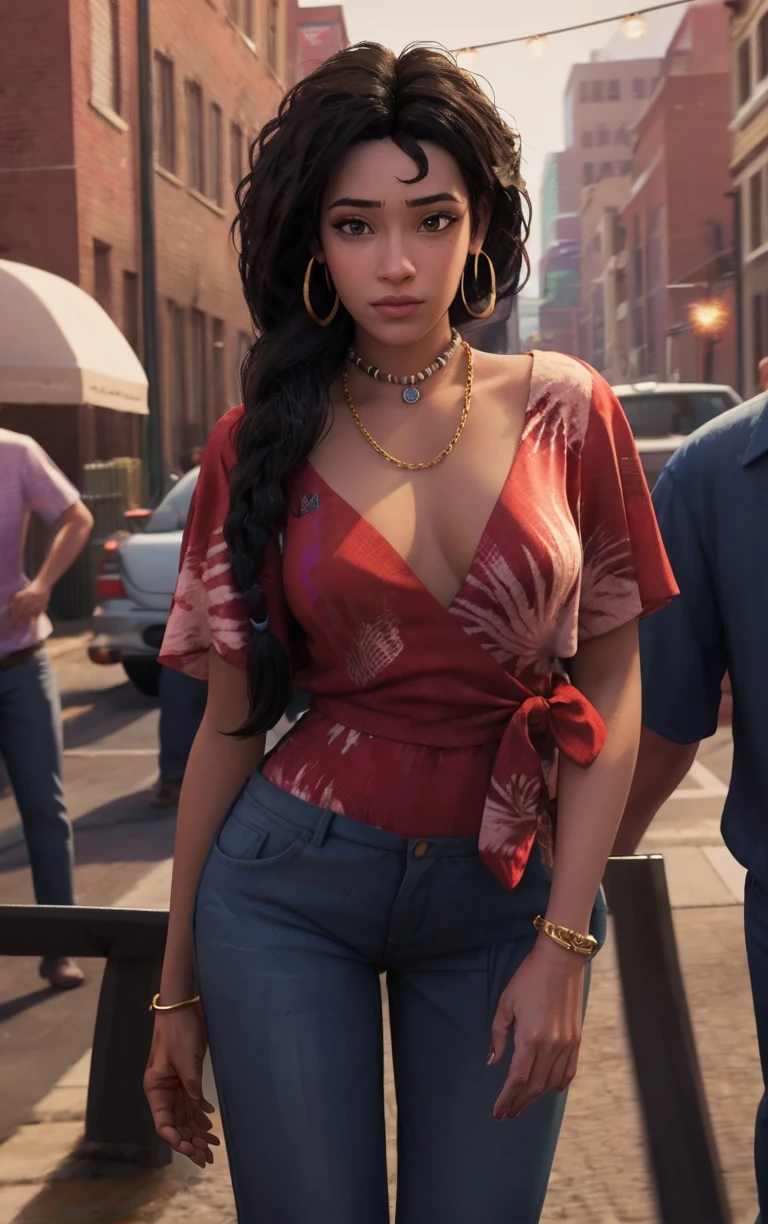 1girl, long hair, black hair, curly hair, single braid, hair over shoulder, dark skin, very dark skin, dark-skinned female, brown eyes, lips, freckles, breasts, jewelry, necklace, hoop earrings, earrings, gold chain, bracelet, nail polish,