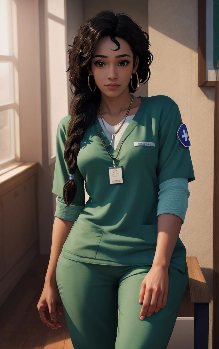 1girl, black hair, curly hair, messy hair, dreadlocks, single braid, hair over shoulder, dark skin, very dark skin, dark-skinned female, lips, freckles, brown eyes, necklace, hoop earrings, earrings, jewelry,