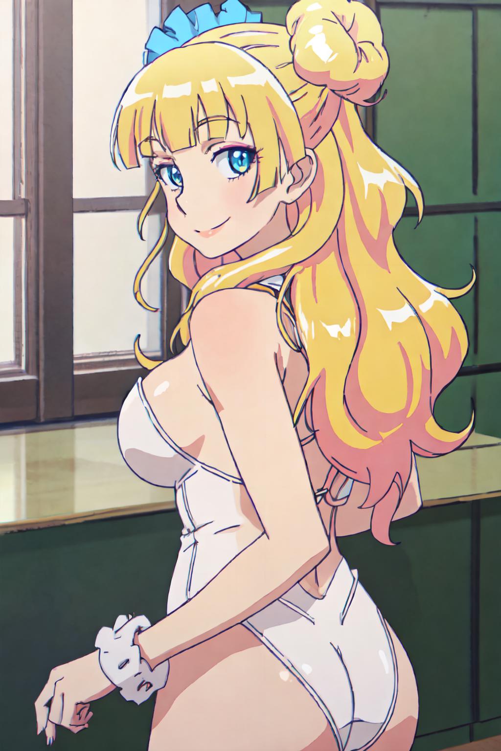 Galko:huge_breasts,smile,1girl, solo, long_hair blue_eyes, blonde_hair, hair_bun, scrunchie, hair_scrunchie, eyeliner, single_side_bun, gyaru, blue_scrunchie, kogal