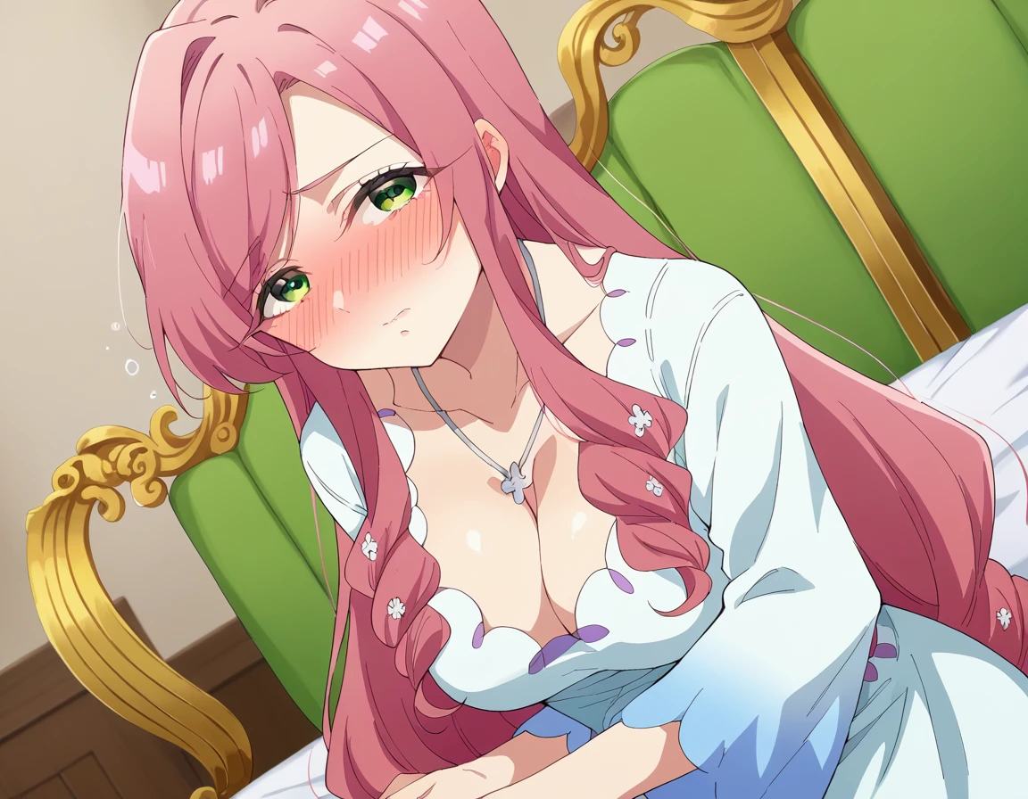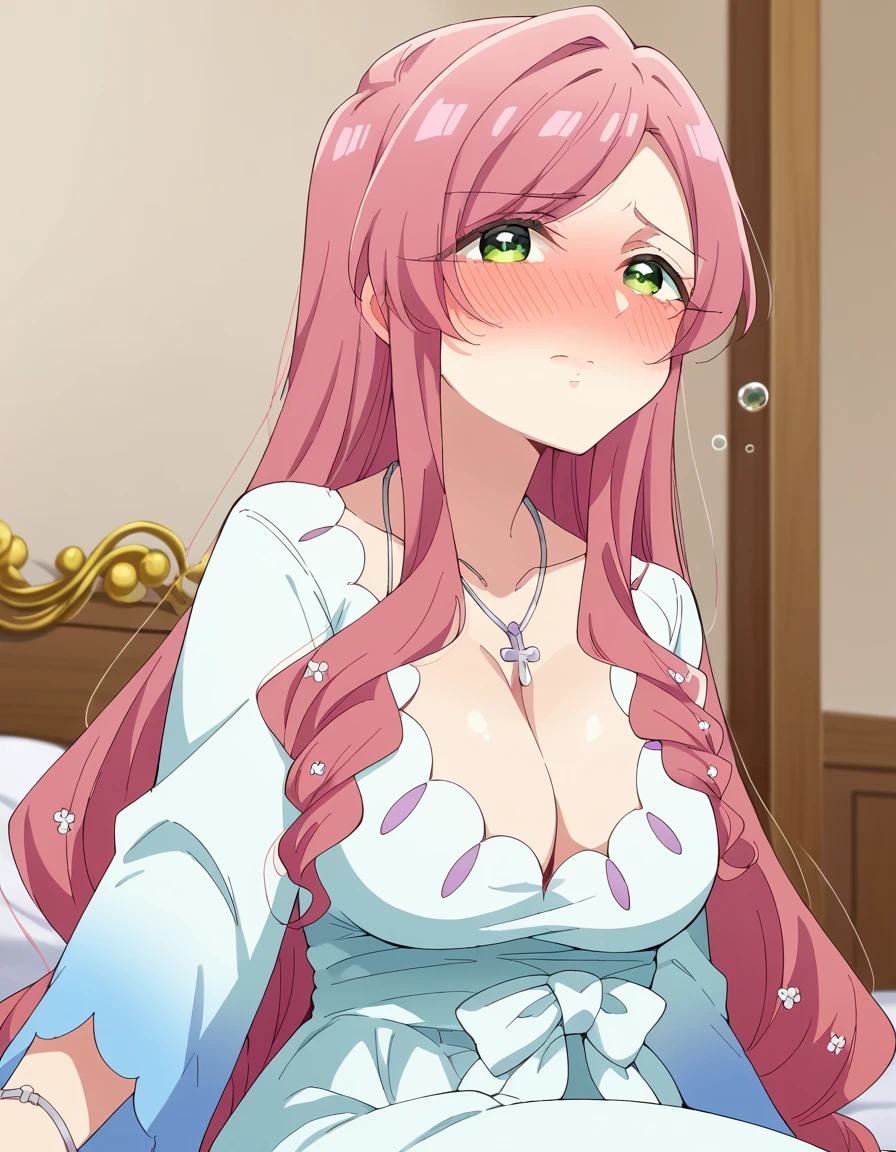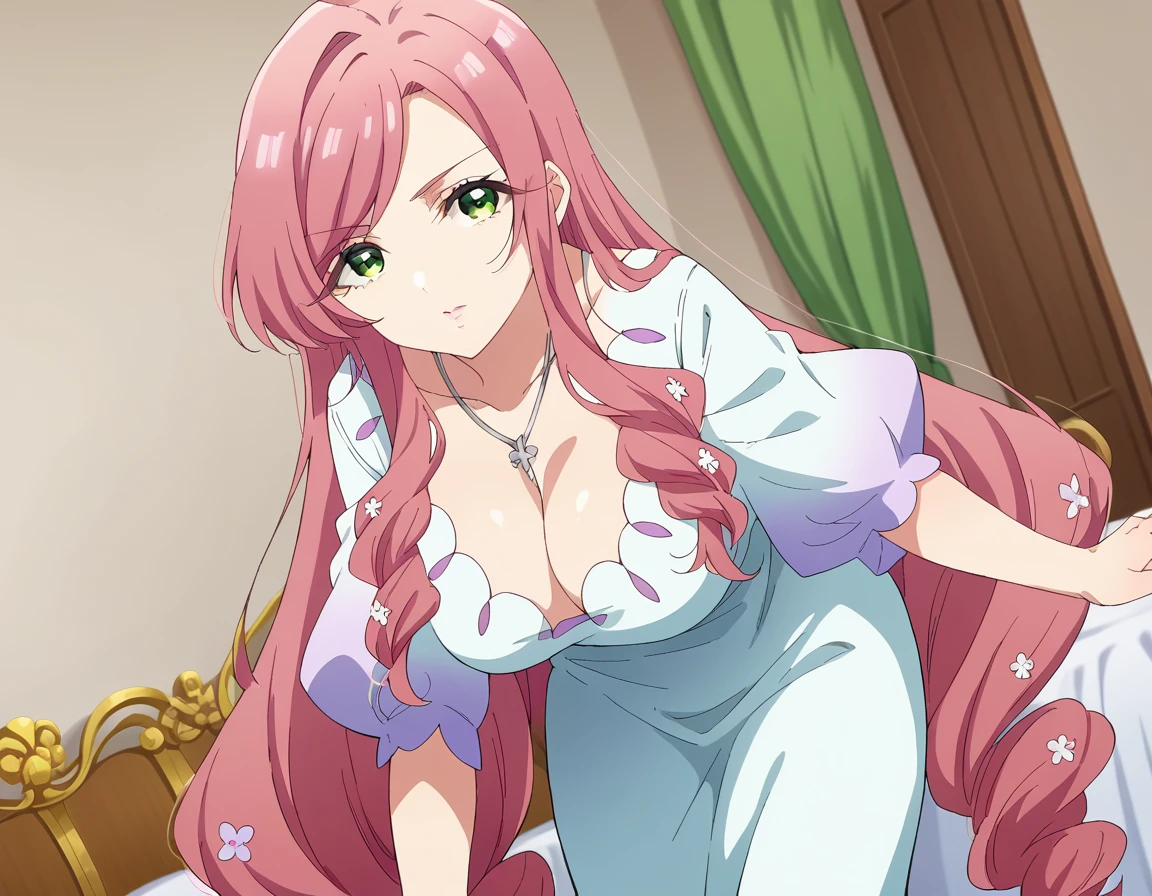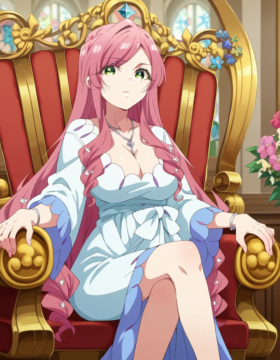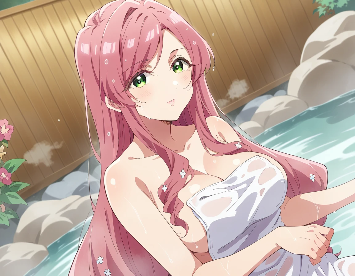 hahari hanazono, long hair, bangs, green eyes, pink hair, flower, hair flower,