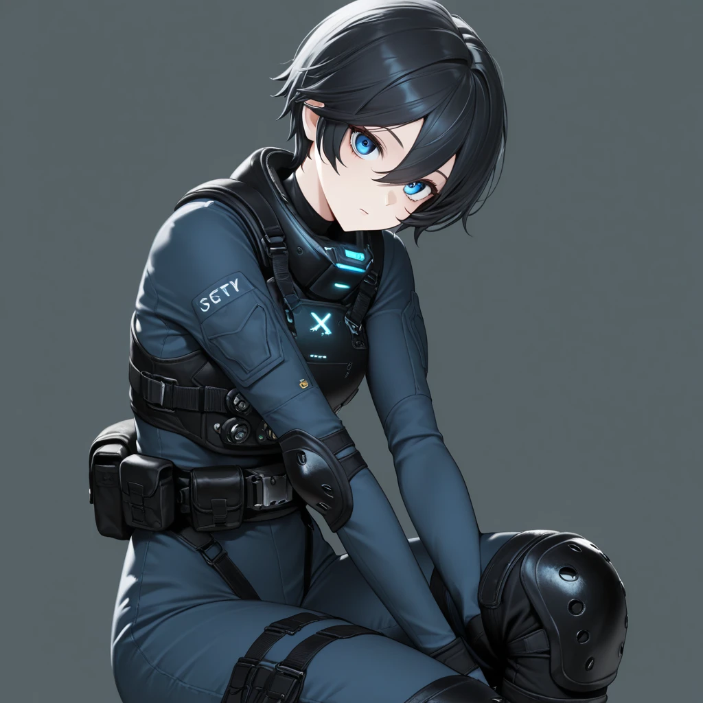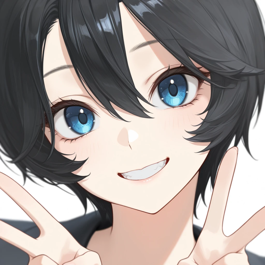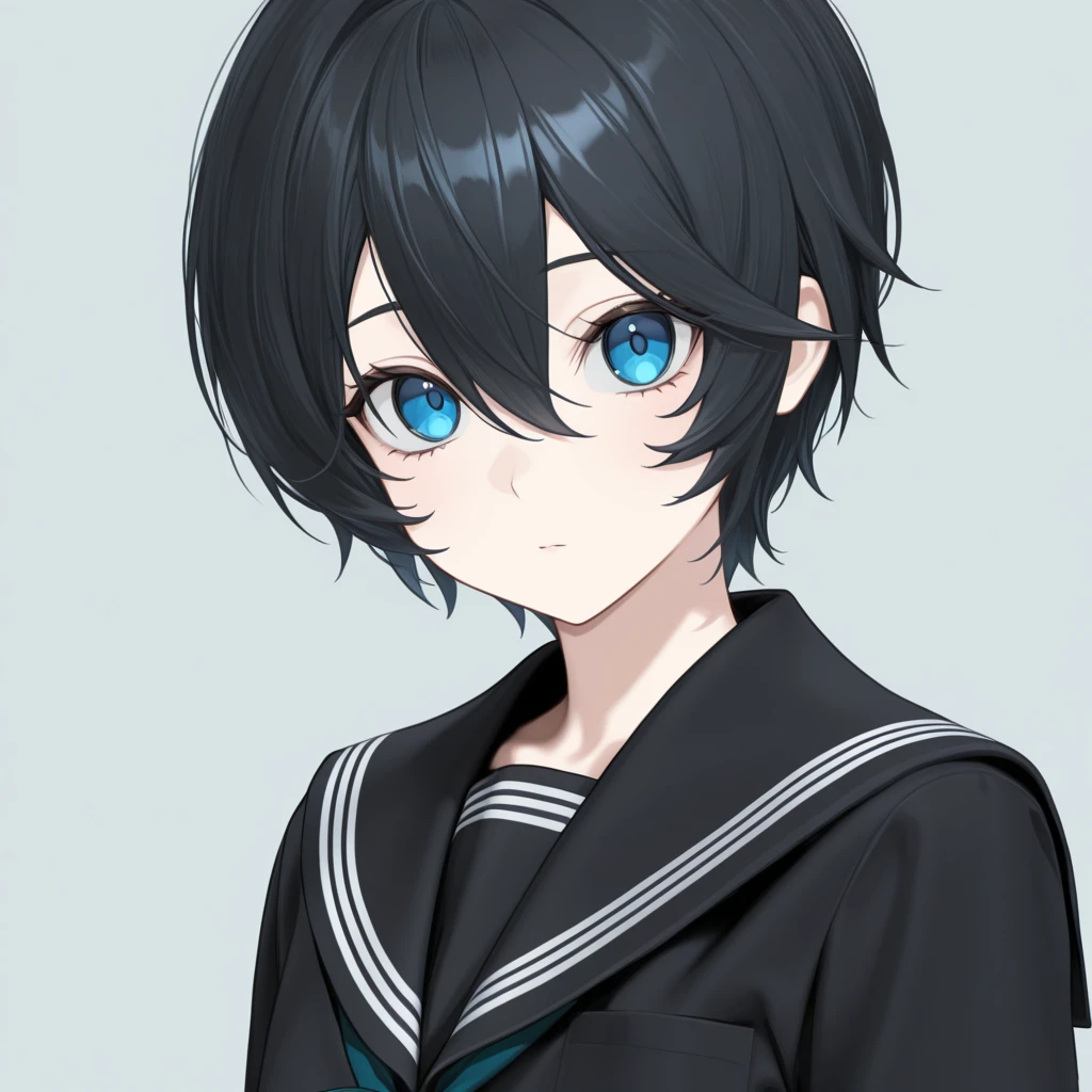 short hair, black hair, blue eyes, hair between eyes,