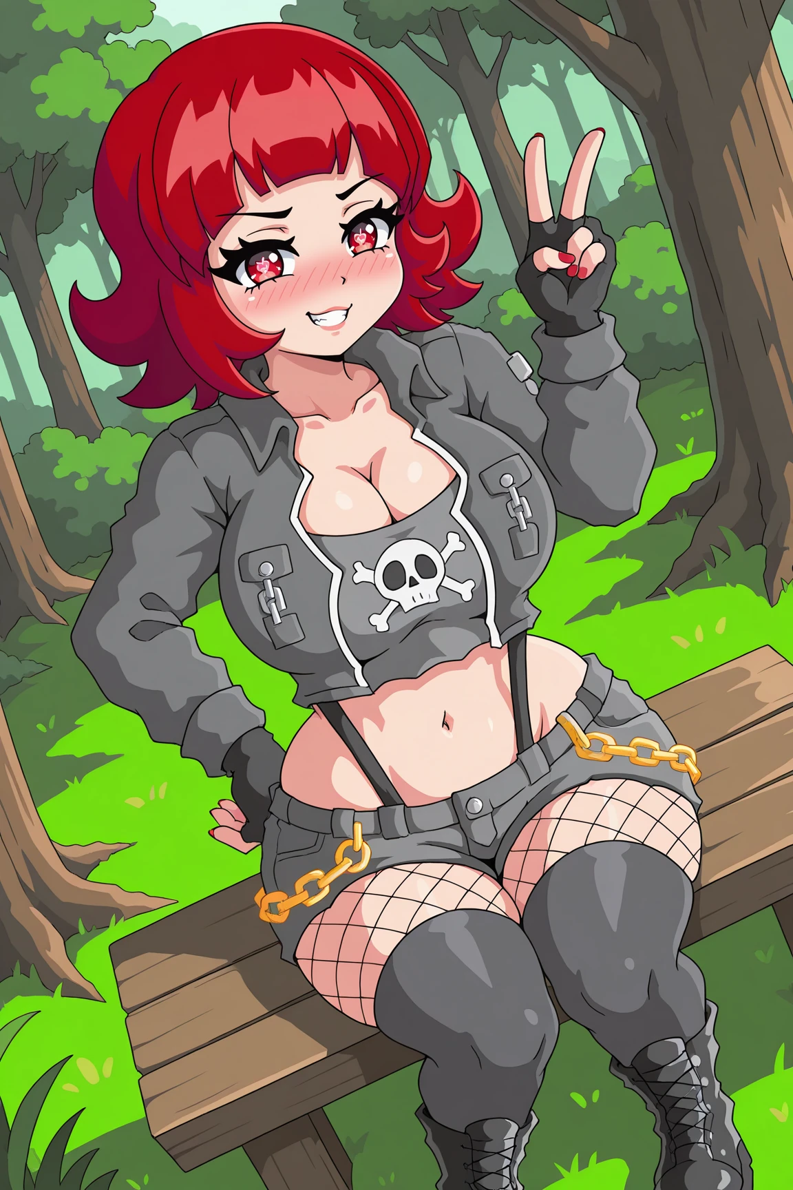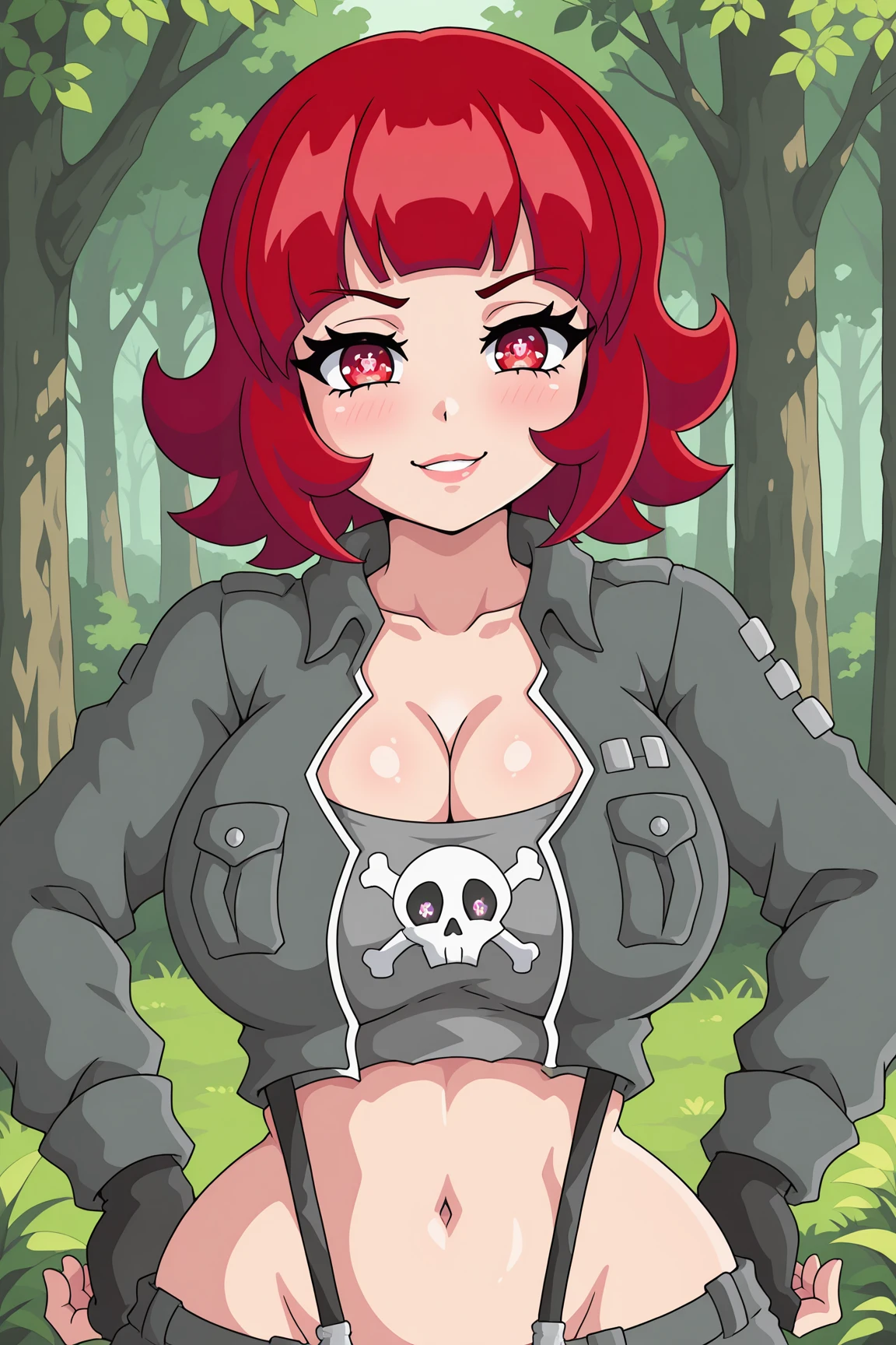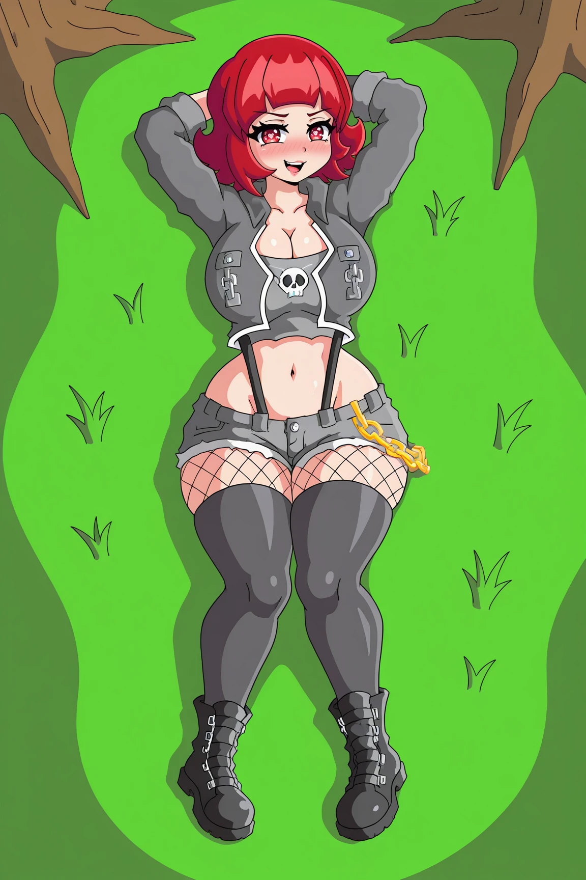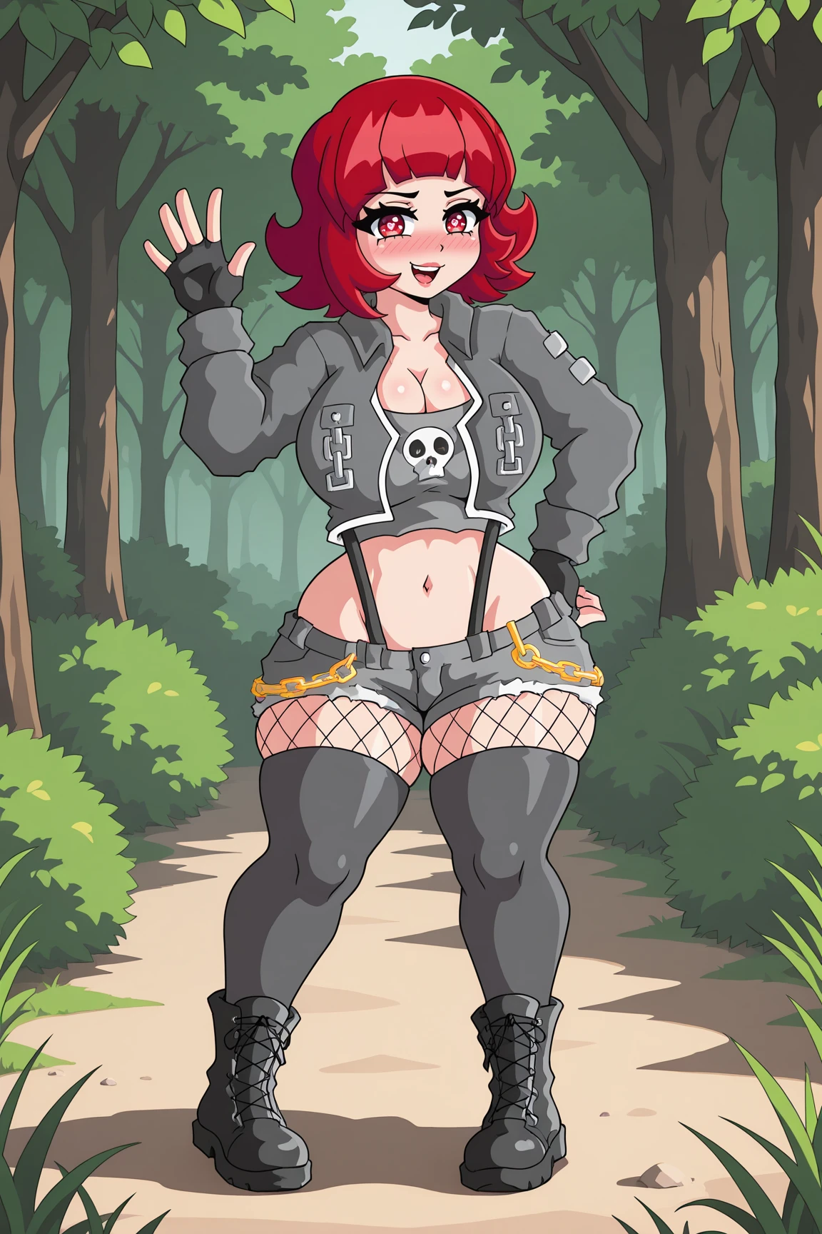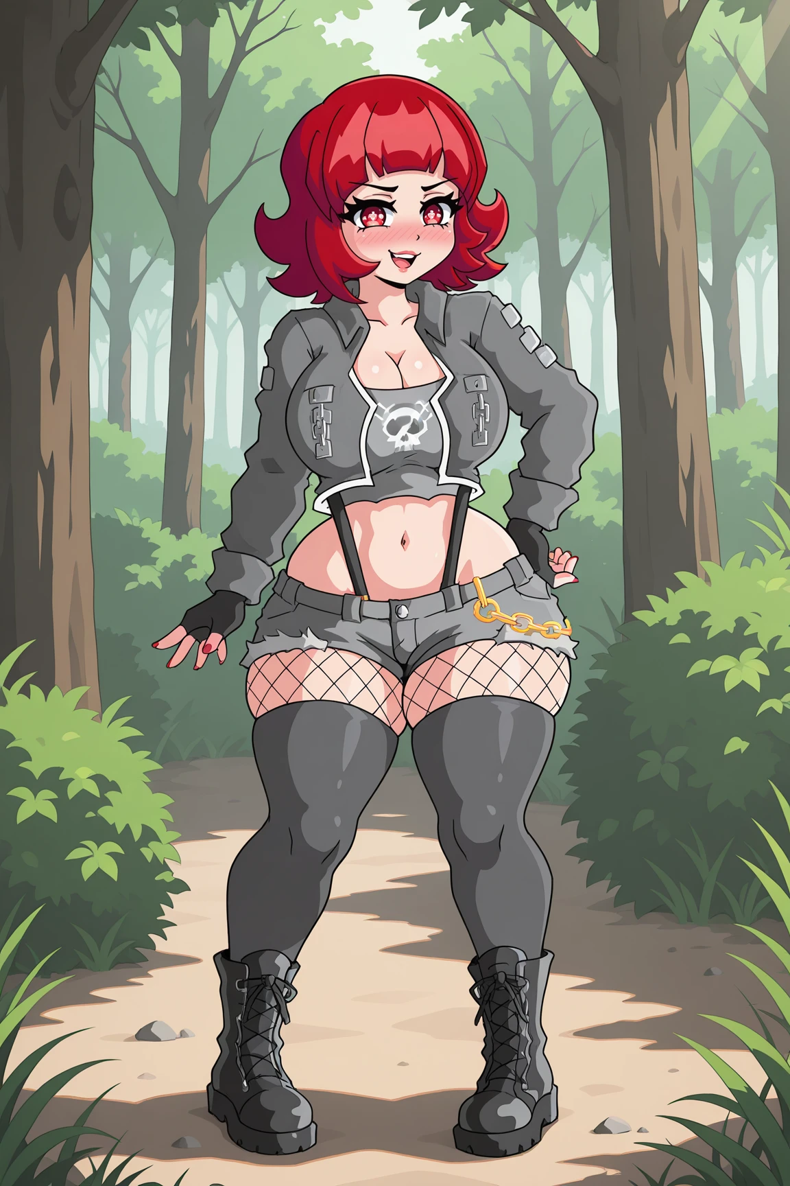 VeronicaOCILXL, red eyes, skull shaped pupils, red hair, short hair, , wide , grey jacket, long sleeves, cleavage, grey midriff, black suspenders, grey gloves, fingerless gloves, grey short, short shorts, fishnet pantyhose, grey thighhighs, black boots