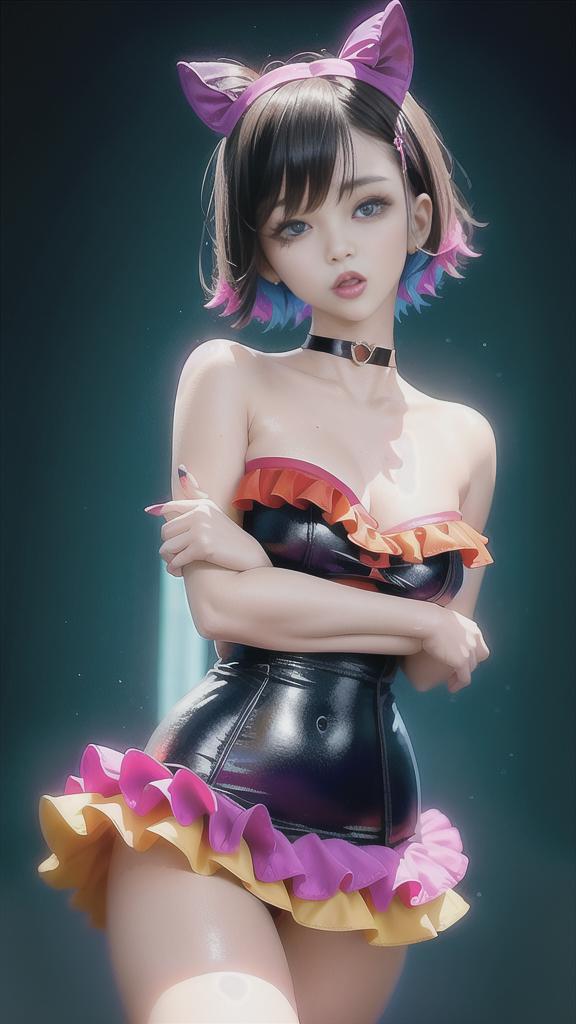 [(ulzzang 1.1:0.1), (pureros:0.1):-0.05], (semi realistic:1.3), (dynamic pose:1.2), (colorful anime character hair:1.35), (cosplay:1.35), (masterpiece:1.2), (best quality:1.15), (1girl:1.2), (solo:1.2), (??????:1.2), (korean mixed, kpop idol:1.3), (masculinity:1.25), (angular face:1.2), (choker+short skiny_outfit vintage gothic frill dress:1.1), (femme fatale:1.3), (upturned eyes:1.3), (thick eyebrows:1.1), (long Eyelashes+smokey eyeliner+eyeglitter+red eyeshadow+gloss lips+erotic sexy glitter makeup:1.1), 15 years old girl, teenager, (depth of field:1.1), (supreme quality beautiful face:1.3), (supreme quality beautiful bright eyes:1.3), (supreme quality hyper realistic texture human skin:1.3), (freckle, flush, blemish, fine wrinkles, pores, veiny, complexion:1.12), (lively skin, rough skin, dirty skin:1.15), (hyper extreme supreme quality beautiful women:1.1) (complete eyes, complete face:1.1), (realistic lighting, cinematic lighting:1.1), (simple background:1.25)