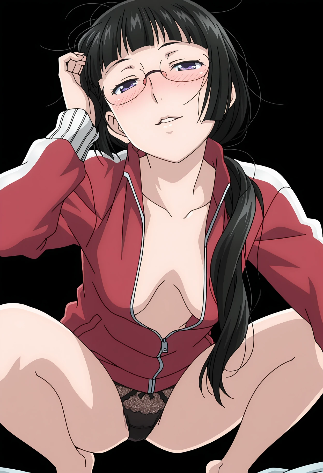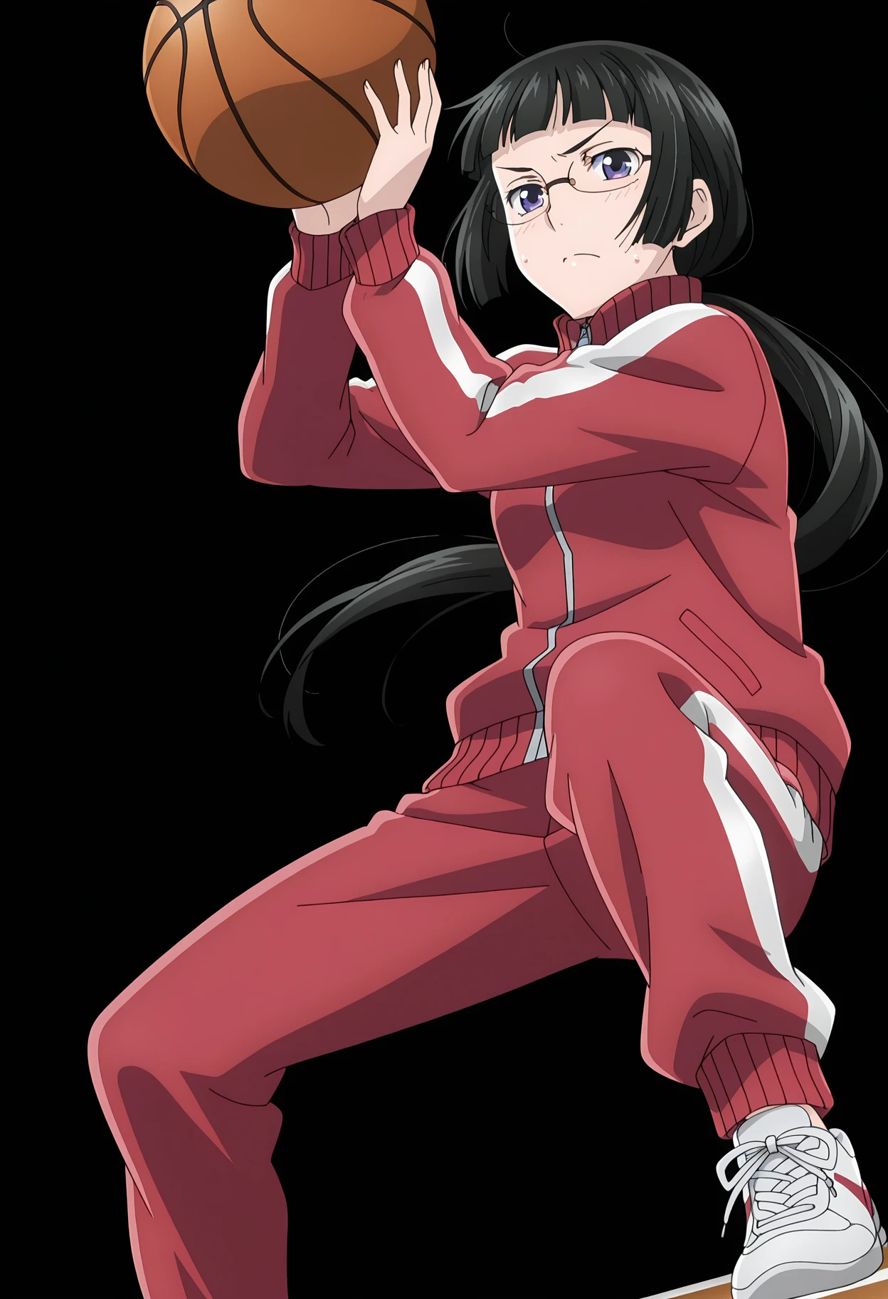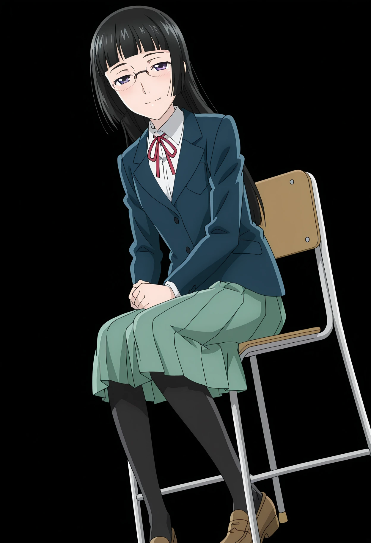 1girl, ruri, long hair, black hair, bangs, blunt bangs, ponytail, low ponytail, hair over shoulder, purple eyes, glasses, small breasts